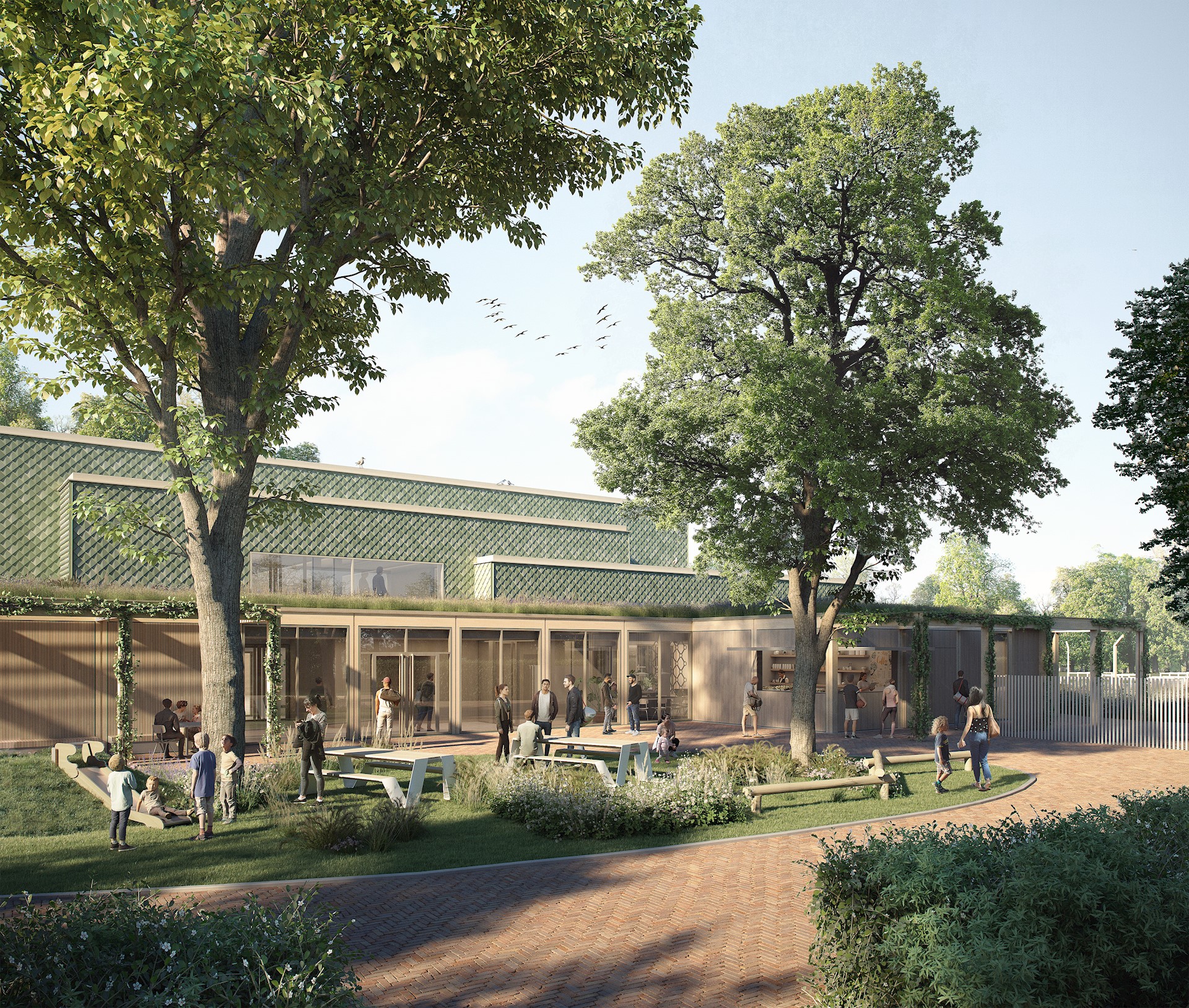 De gevel van ons ontwerp bestaat uit een combinatie van biobased materialen in de plint en de circulaire, onderhoudsvrije Pretty Plastic-tegels voor de hoofdmassa, die we eerder al toepasten in de Ambulancepost in Tiel. Ook daarmee gaat het fraai op in de natuurlijke, groene omgeving en sluit het aan op het paviljoenachtige karakter.