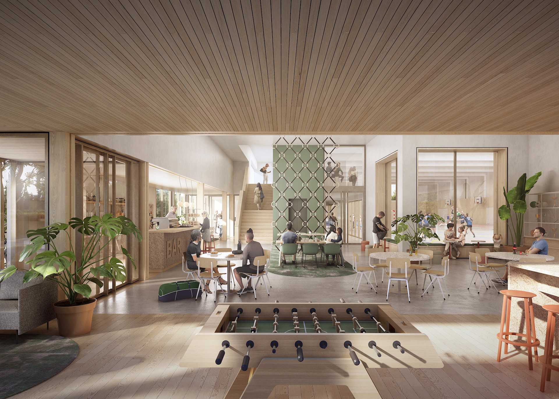 In onze visie voor de aanbesteding zijn de nieuwe sporthal en het naastgelegen zwembad zowel in het ruimtelijk ontwerp als functioneel gebruik verbonden tot één sportcluster. Het volume van de sporthal wordt trapsgewijs afgebouwd richting het uitnodigende entreeplein en het buitenbad. De warme plint zorgt voor een prettige menselijke maat en biedt diverse verblijfsplekken rondom het gebouw.
