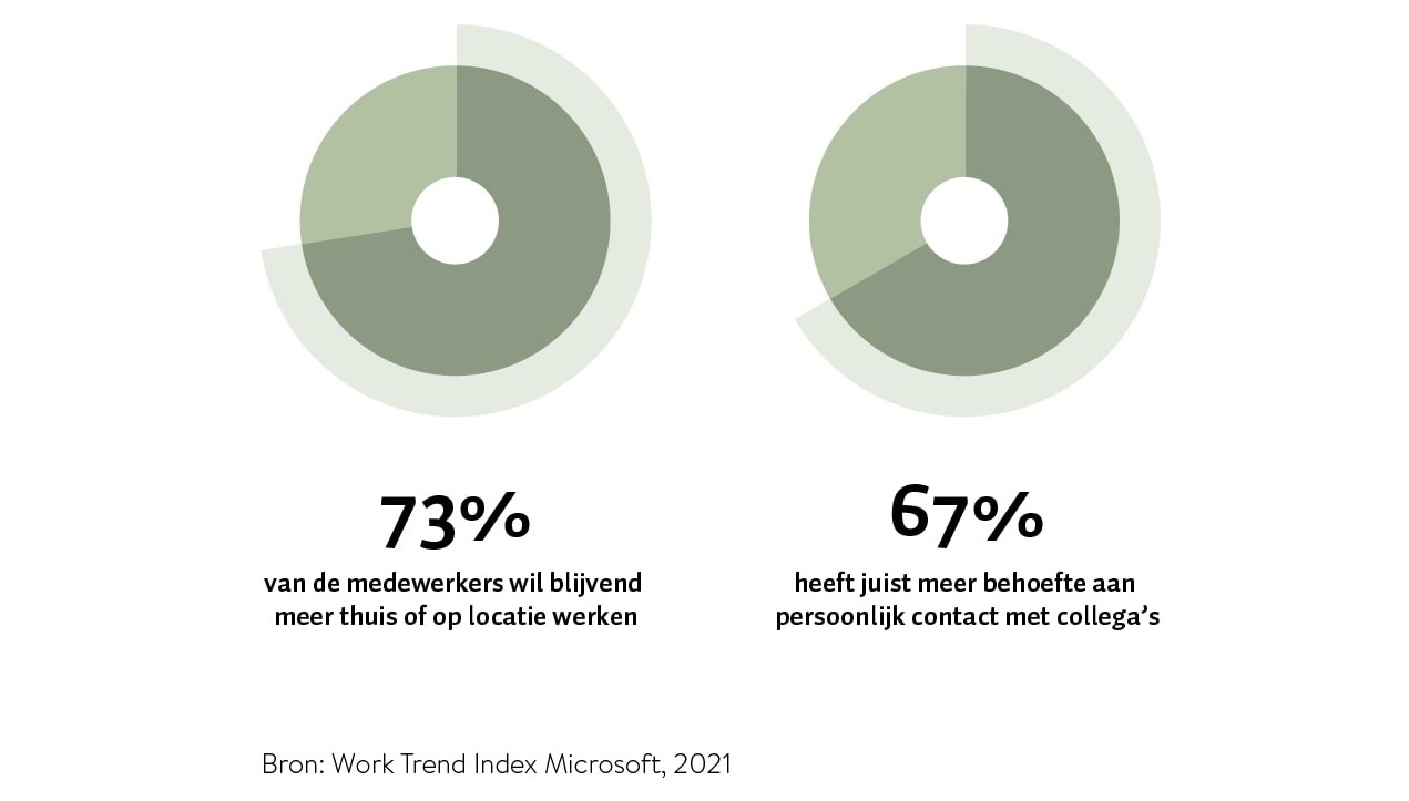 Mede door corona zijn we anders gaan kijken naar werken. We hinken een beetje op twee gedachten. Aan de ene kant willen mensen weer graag naar kantoor komen, bijvoorbeeld omdat ze dan meer sociaal contact met collega’s hebben, omdat ze zo werk en privé beter gescheiden kunnen houden, of omdat ze op hun werkplek simpelweg beter hun werk kunnen doen. Aan de andere kant hebben we ook goede redenen om (gedeeltelijk) thuis te willen werken. Minder reistijd, efficiënter kunnen werken en flexibel kunnen omgaan met onze werktijd zijn hierin belangrijke factoren. Overigens zijn natuurlijk niet alle soortenwerkzaamheden geschikt voor individueel thuiswerk. Kennisuitwisseling, brainstormen, creativiteit en strategisch denken, komen namelijk het beste tot hun recht in elkaars fysieke nabijheid.