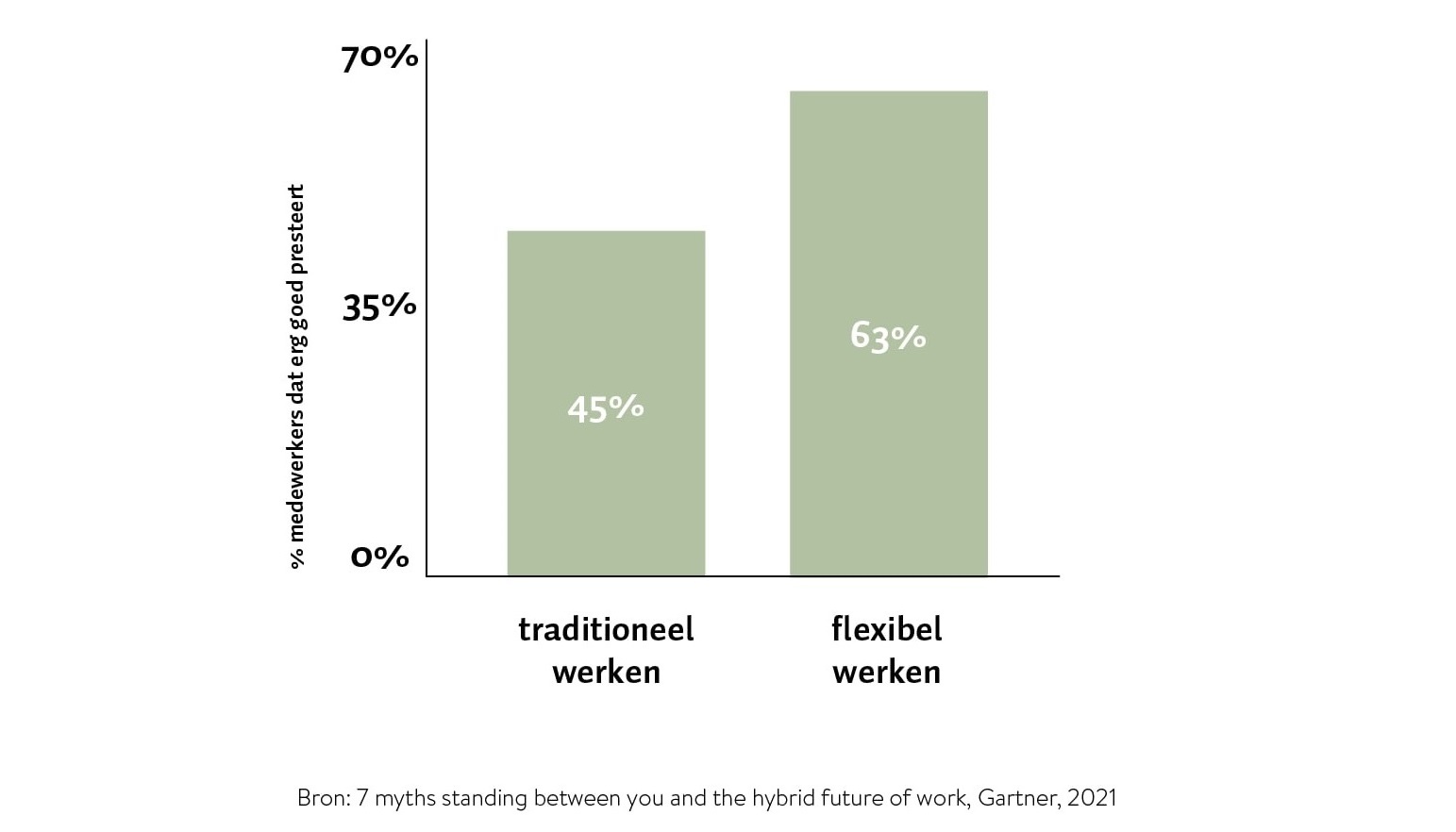 Doemdenkers beweren dat de productiviteit door Hybride Werken flink zou kunnen teruglopen. Maar wat blijkt? Het tegengestelde is waar, zo concludeert het Amerikaanse onderzoeksbureau Gartner. Zeker als we kijken naar hoe consistent iemand is in het opleveren van gewenste resultaten, en minder – zoals gebruikelijk – naar hoeveel iedere medewerker nou precies presteert. Krijgen we meer vrijheid in waar en wanneer we werken, dan groeit het percentage mensen dat erg goed presteert zelfs van 45% naar 63%, constateert Gartner.