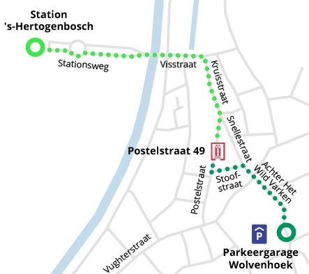 De binnenstad van 's-Hertogenbosch is afgesloten voor auto’s. U kunt met de auto wel toegang krijgen tot de Postelstraat om iets op te halen of af te leveren, maar u kunt niet in de straat parkeren.
