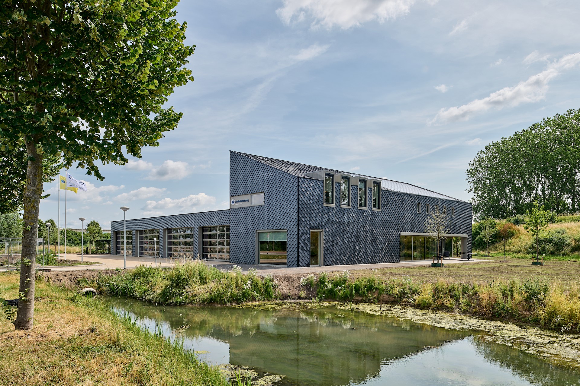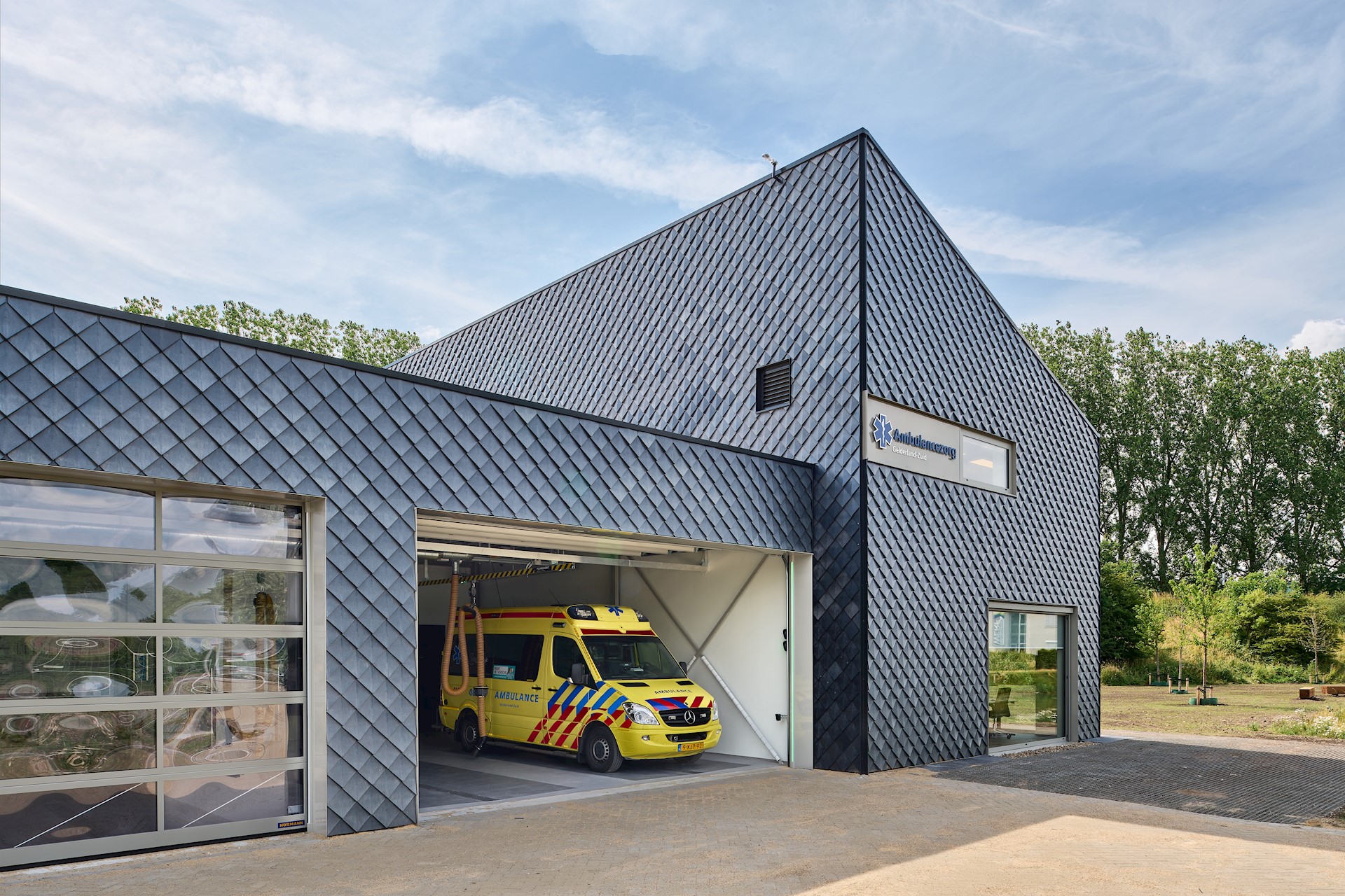 De grijze, ruitvormige tegels worden gemaakt van versnipperde PVC-bouwproducten, zoals raamkozijnen, regenpijpen en goten. De tegels worden in overlappende rijen eenvoudig met schroeven op het gebouw geïnstalleerd. Een groot voordeel van deze gevelbekleding is dat het volledig onderhoudsvrij is. Ook is het mogelijk de tegels te versnipperen en tot een nieuw product te persen. Zo blijven de Pretty Plastic-tegels dus ook ná gebruik in de ambulancepost een circulair product. We gebruiken de Pretty Plastic-tegels niet alleen als gevelafwerking, maar ook als dakleien. Dit is nog niet eerder gedaan en daarom een unieke stap. Doordat iedere tegel er net iets anders uitziet en de vorm van de tegel voor een fraai schaduwspel op de gevel zorgt, krijgt het geheel een natuurlijke en levendige uitstraling. De schuine kap op het kantoordeel zorgt voor een fraai accent en een herkenbaar en huiselijk beeld. Naast de prettige schaalsprong die het maakt naar de naastliggende boomgaard is het dak door de gunstige oriëntatie uitermate geschikt voor het integreren van zonnepanelen.