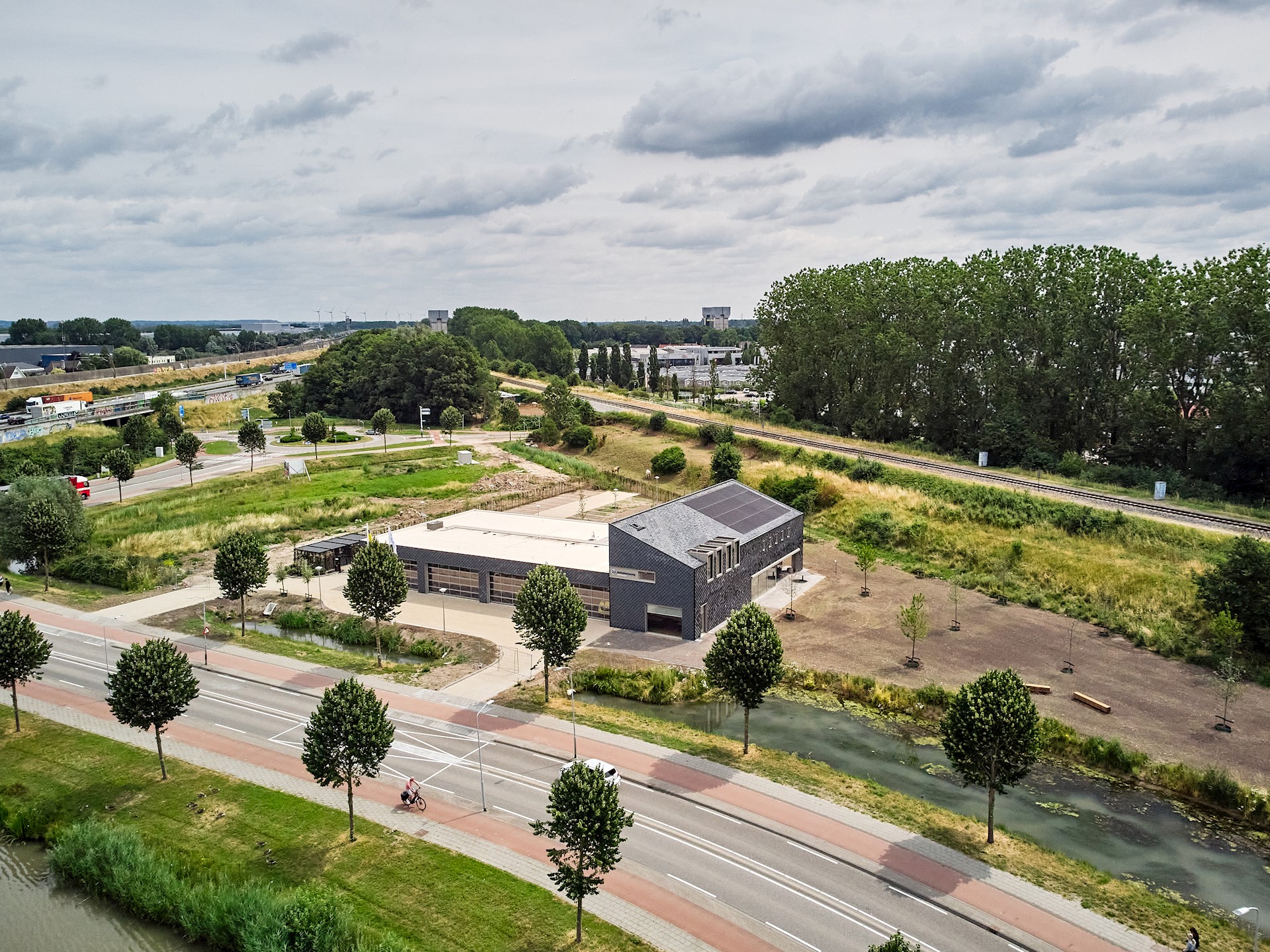 Er werd gezocht naar een donkerkleurig materiaal dat een fraai contrast vormt met de felgele kleuren van de ambulances en mooi afsteekt tegen de groene omgeving. Hiervoor zijn verschillende materialen in overweging genomen en vervolgens ter zijde gelegd. Zo is hout niet onderhoudsvrij en is aluminium niet duurzaam. Uiteindelijk viel de keuze op de circulaire tegel van Pretty Plastic. Er zijn al enkele kleinschalige projecten uitgevoerd met deze gevelbekleding, maar het is nog nooit op deze schaal toegepast. Daarmee fungeert dit project als een voorloper binnen de markt.