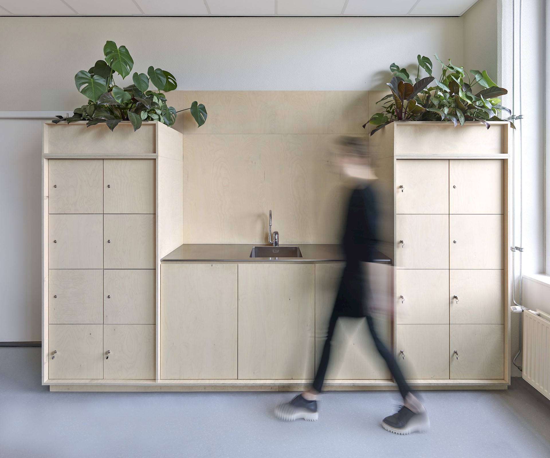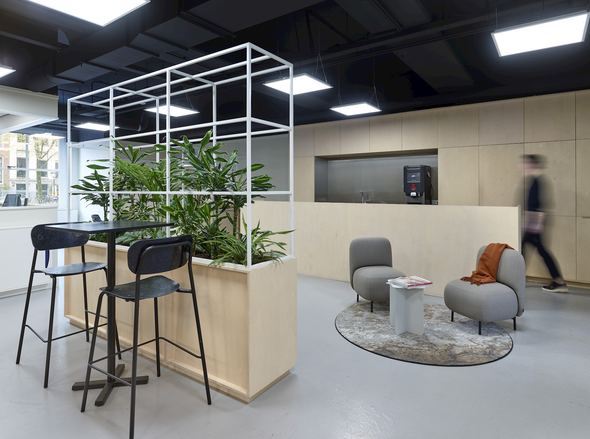 Zoals we dat in iedere kantooromgeving doen, is ook hier een zonering van dynamiek naar rust ontworpen. Gezien de karakteristieke, smalle vorm van het grachtenpand ligt deze zonering in verticale richting. Op de begane grond vinden we een dynamische omgeving, met daarin het werk-lunchcafé. Op de eerste verdieping heeft ontmoeting en samenwerken de overhand. Daar zijn verschillende grote vergaderruimtes te vinden. Op de tweede en derde etage liggen kantoorplekken voor geconcentreerd werken.