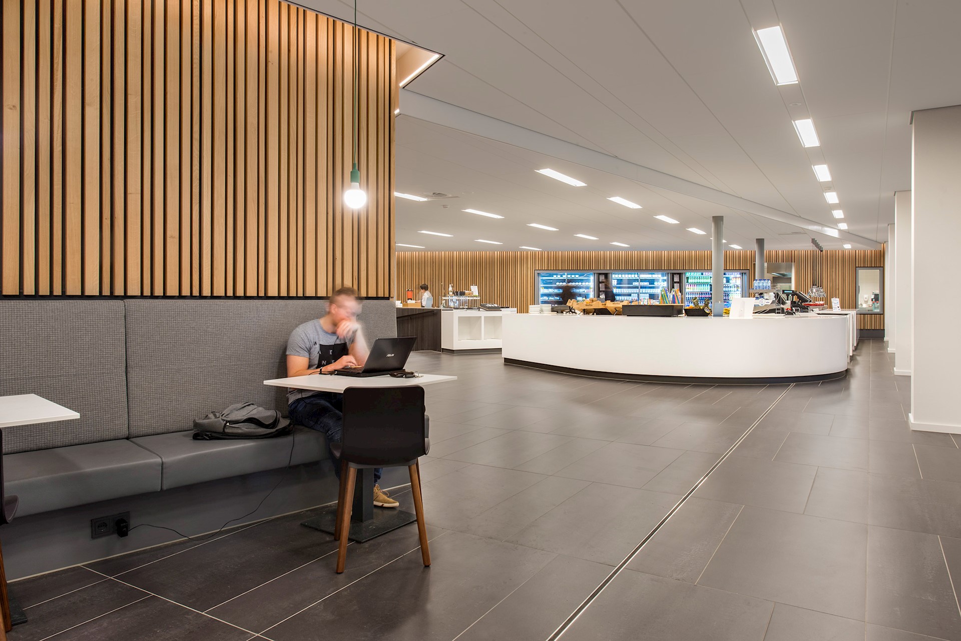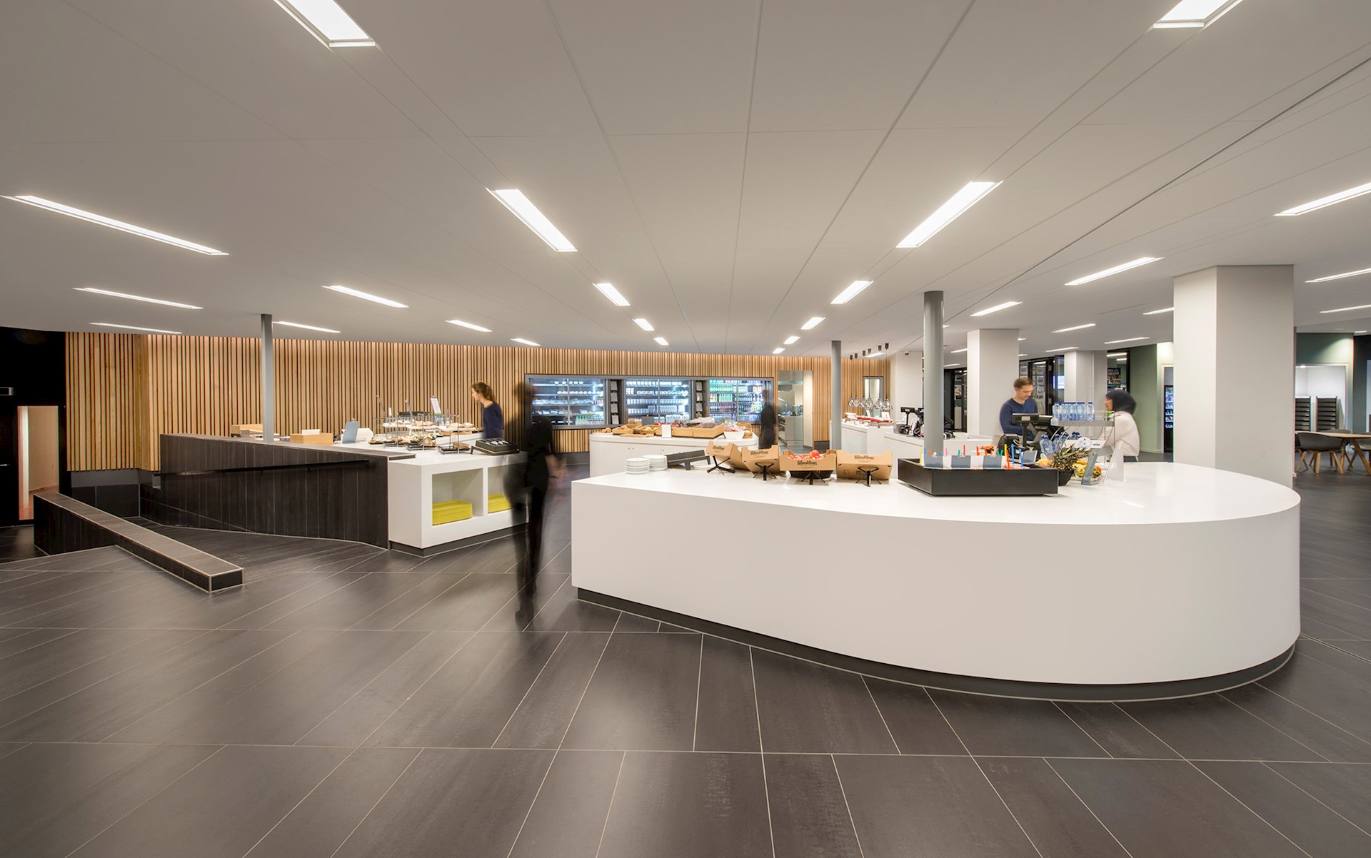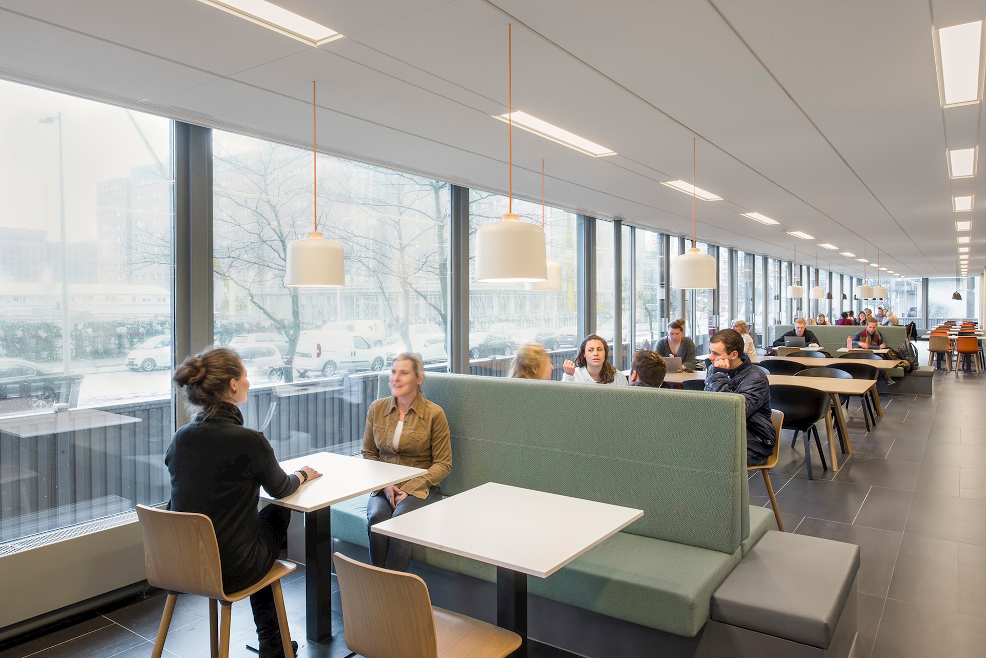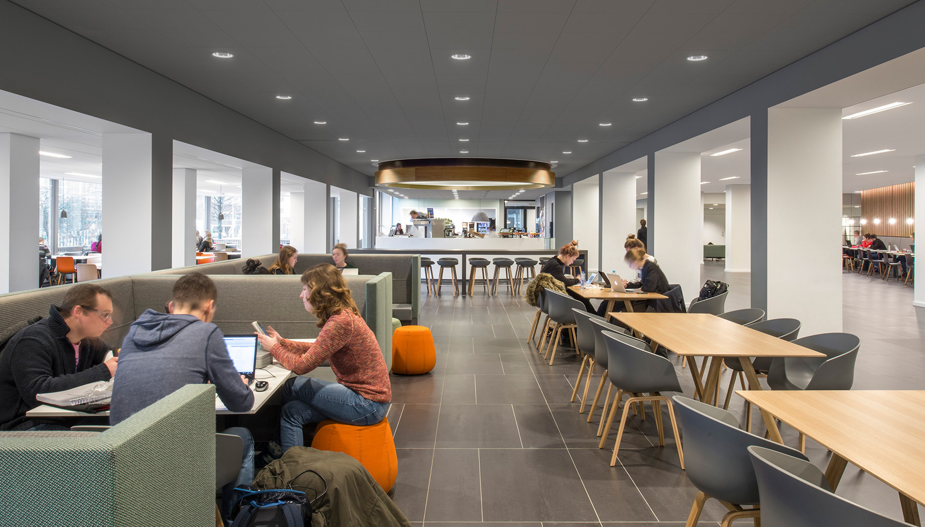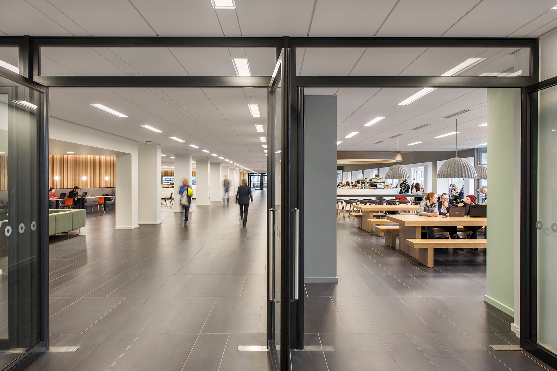 De belangrijkste ingreep was het ‘ontrommelen’ van de ruimte. De begane grond moest het verblijfs- en ontmoetingsgebied worden voor studenten, medewerkers en bezoekers, maar werd ervaren als gesloten en donker. Door wanden weg te halen ontstond een open en lichte omgeving met heldere zichtlijnen vanaf de hoofdentree tot aan het tweedelijns servicepunt achter in het gebouw, en vanaf de collegezalen tot buiten. Met het logisch ordenen van de stromen en het herinrichten van de ruimtes ontstond een optimale omgeving voor ontmoeting.