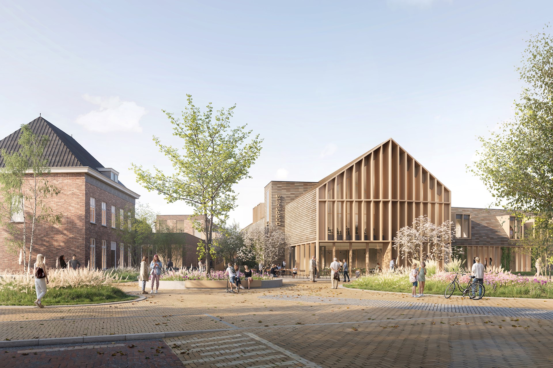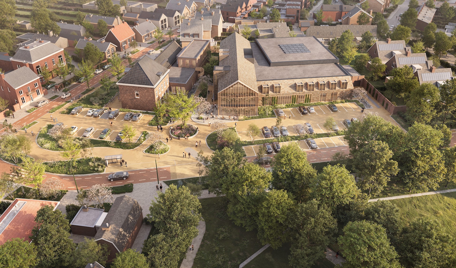 De vernieuwde multifunctionele accommodatie moest niet alleen optimaal aansluiten op de wensen van de gebruikers, maar ook op de bijzondere locatie in het dorp. We hebben veel aandacht besteed aan een mooie inpassing in het landschap met zicht op de omgeving, een uitnodigende entree en een levendig dorpsplein. De omgeving rondom het nieuwe complex zal worden heringericht om ontmoetingen te bevorderen in een groene setting, centraal gelegen tussen Kiosk, Kasteel en Klooster. Deze inrichting zal naadloos aansluiten op het dorpscentrum en het Witte Kasteel.