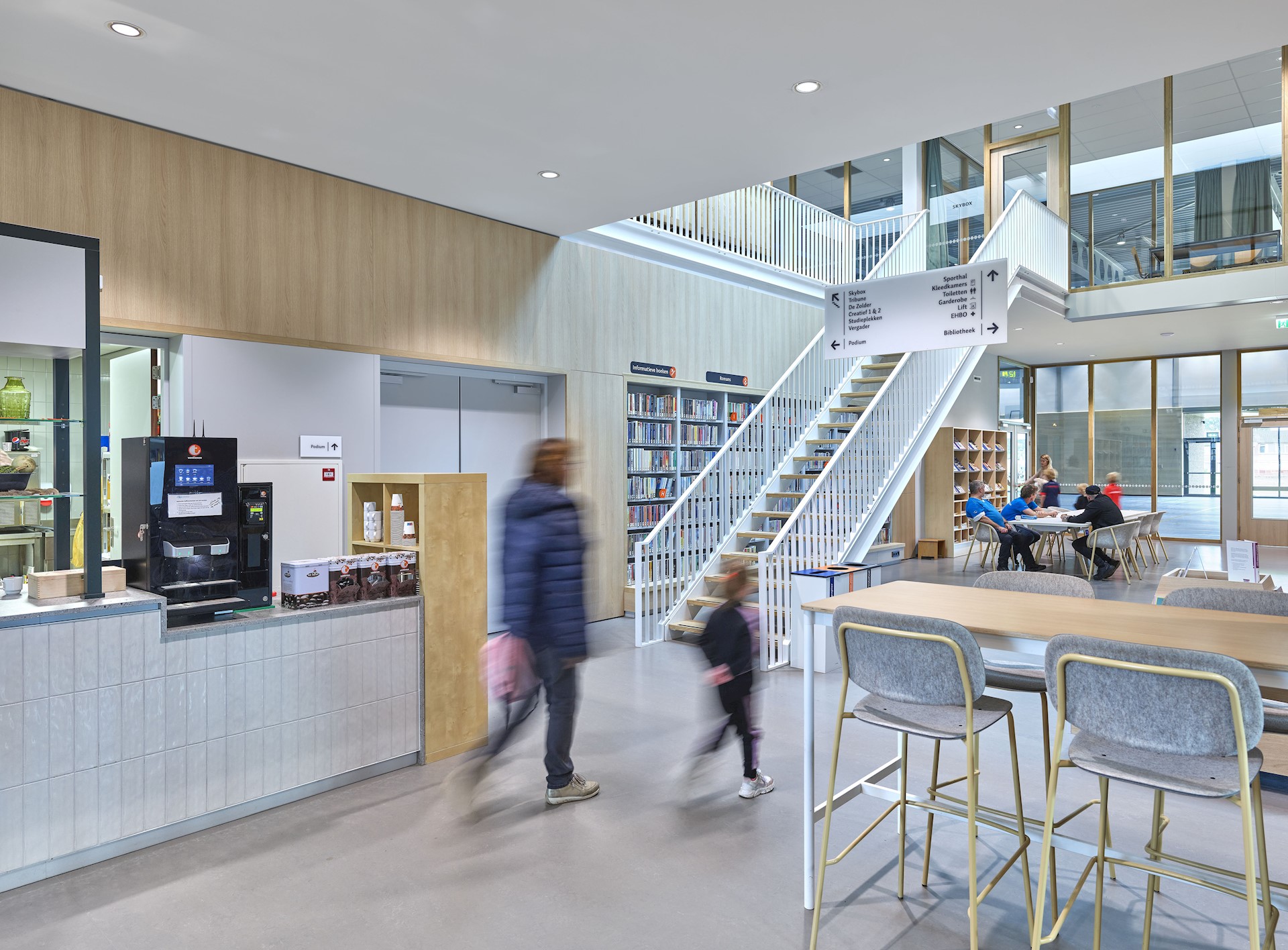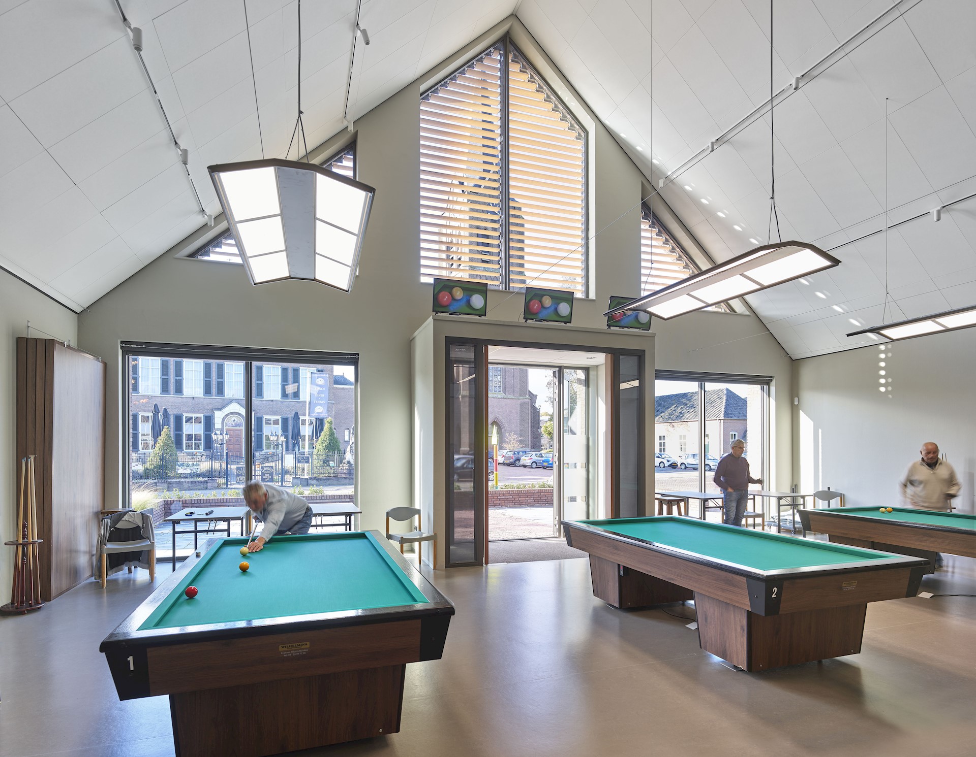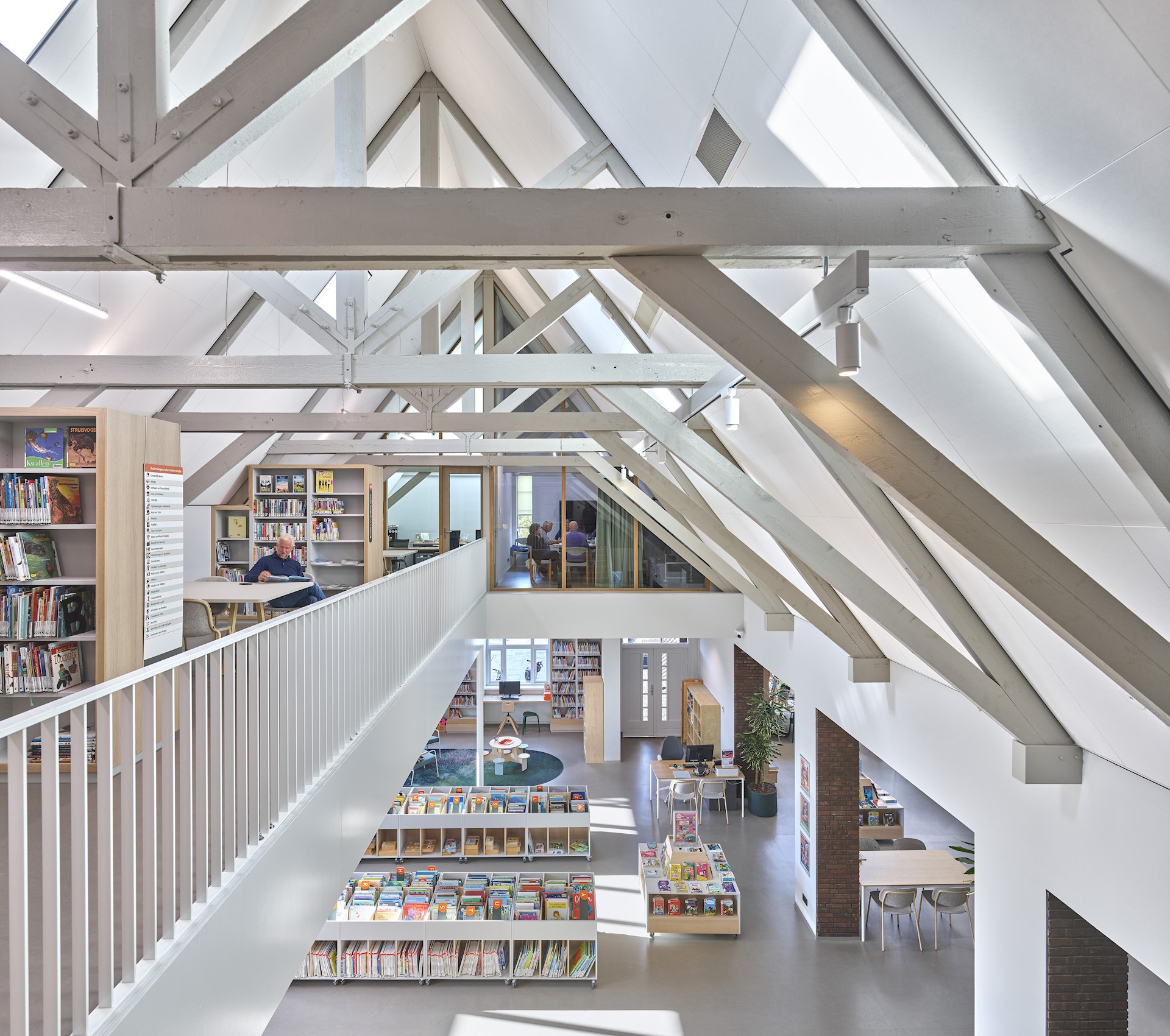 Dankzij de transparante voorgevel krijgen voorbijgangers vanaf de Kerkstraat prachtig zicht op de sfeervolle bijeenkomstruimte. In deze mix van café en bibliotheek lopen inwoners spontaan binnen voor een kopje koffie of het lenen van een boek. Samen met een gezellig terras aan de Kerkstraat geeft deze transparante voorgevel het dorpshuis een uitnodigend karakter. De mooie detaillering, de ornamenten en het ambachtelijk metselwerk gecombineerd met de houten luiken en lamellen zorgen voor warmte en sfeer. Aangelicht in de avonduren is het een pareltje aan de Kerkstraat!