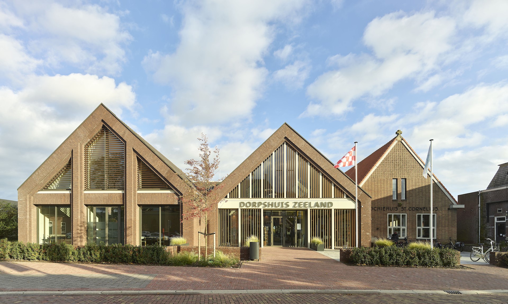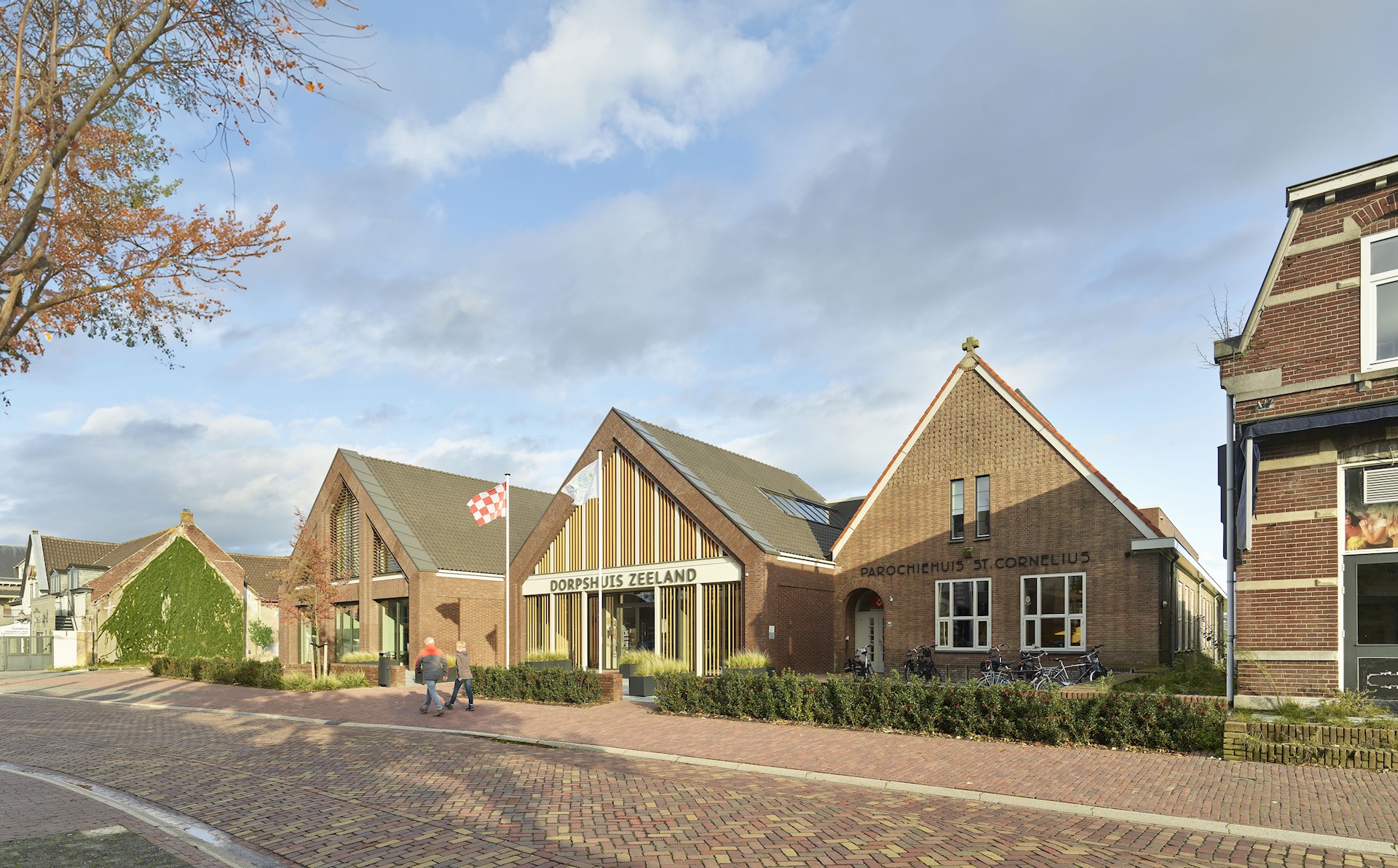 Het bestaande parochiehuis vormde in ons ontwerp de aanleiding voor een nieuw drieluik in het centrum van het dorp. Het behoud van dit monument gaf aanleiding om te kiezen voor drie vergelijkbare bouwmassa’s die aansluiten bij de architectuur in de Kerkstraat. De nieuwe gevels hebben ieder een eigen karakter, maar komen samen door een gedeelde lijn en vormentaal. Het kleuren- en materialenpalet van de omliggende panden is hierin overgenomen. Zo is de nieuwbouw opgebouwd uit een warme roodbruine baksteen, keramische dakpannen en lichte kozijnen. Bovendien zijn de nieuwe gevels opgebouwd uit karakteristiek verspringend en geornamenteerd metselwerk, wat aansluit bij het ambachtelijke metselwerk van het parochiehuis en de andere historische panden in haar omgeving. In de nieuwe voorgevel wordt het stenige beeld doorbroken door grote glasvlakken. Houten lamellen en luiken verzachten de aanblik en zorgen voor warmte en intimiteit, zoals de raamluiken ook sfeer geven in de gevel van de tegenoverliggende pastorie.