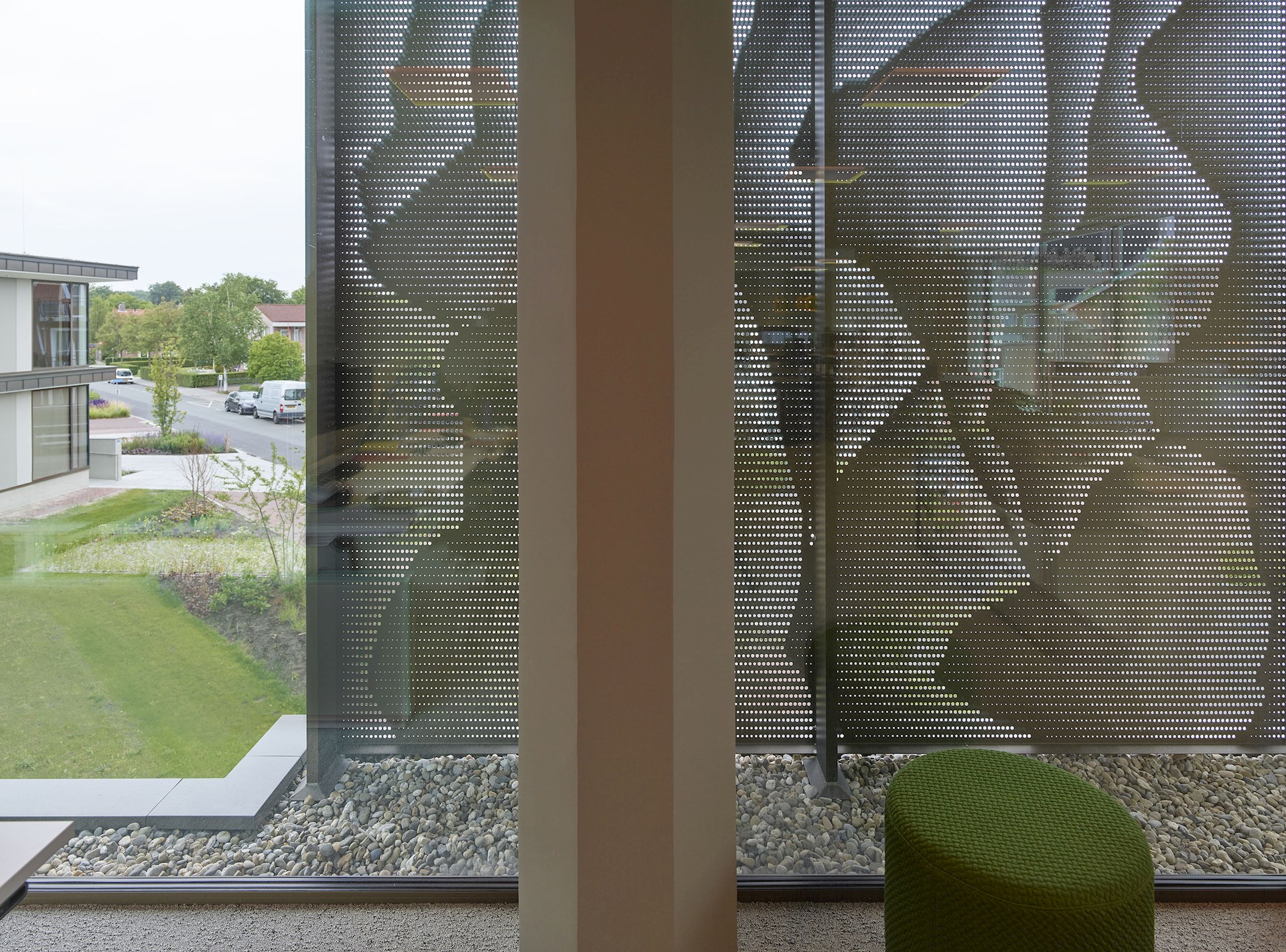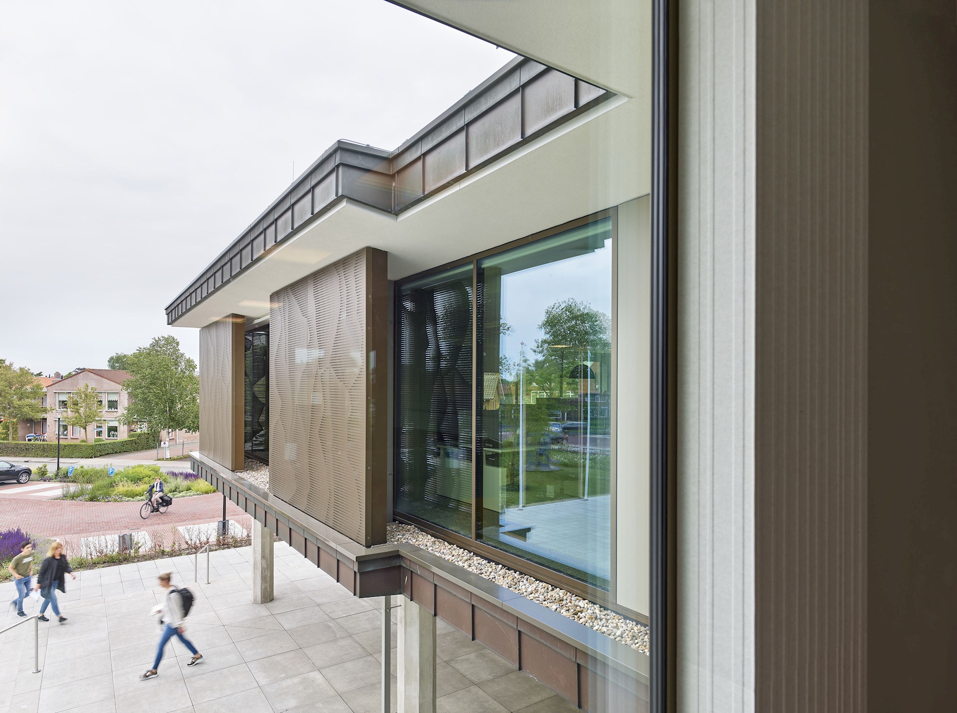 Om deze interactie te versterken deden wij een aantal belangrijke architectonische ingrepen aan het gebouw, waaronder het realiseren van veel glas aan de gevelzijde. Hierdoor valt een enorme hoeveelheid daglicht binnen waardoor het gebouw een open en toegankelijke uitstraling krijgt. Aan de hoeken van de vier vleugels van het gebouw brachten we door middel van geperforeerde aluminium schermen een bijzondere detaillering aan. Hierdoor ontstaat er niet alleen meer plasticiteit en gelaagdheid in de gevel maar door de geperforeerde schermen ontstaan subtiele doorkijkjes naar de prachtige groene omgeving van het gemeentehuis.