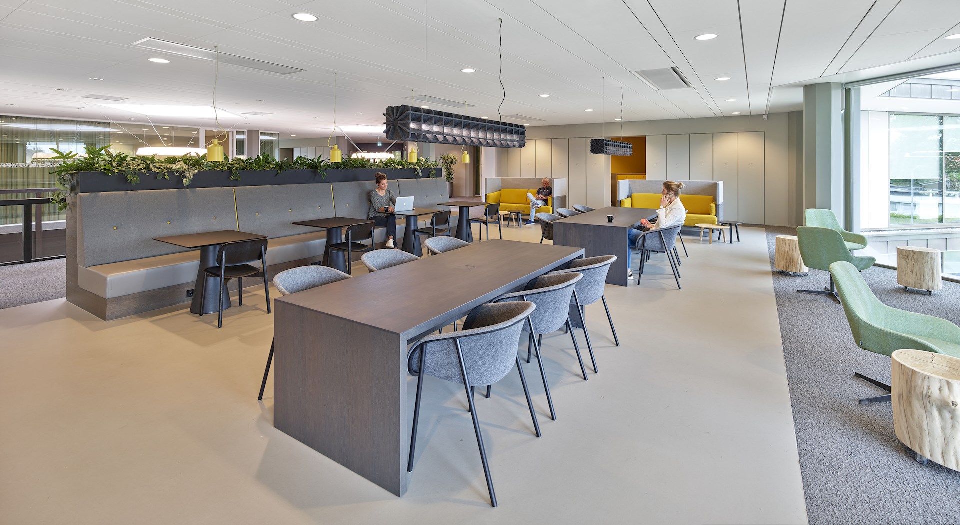 Om het activiteit gerelateerd werken te faciliteren ontwierpen wij een flexibel werkconcept. In het hart van het gebouw vindt de ontmoeting tussen ambtenaren en externen plaats. Wij realiseerden hier een openbaar toegankelijk werklunch-café met uitstekende voorzieningen zoals een goede koffiebar en comfortabele zitplekken waar men graag bijeenkomt voor lunch of (kort) overleg. De toepassing van veel okergeel- en groentinten versterkt de levendige sfeer en door het behouden van de bestaande daklichten versterken we de ruimtelijke en lichte omgeving van deze ruimte.