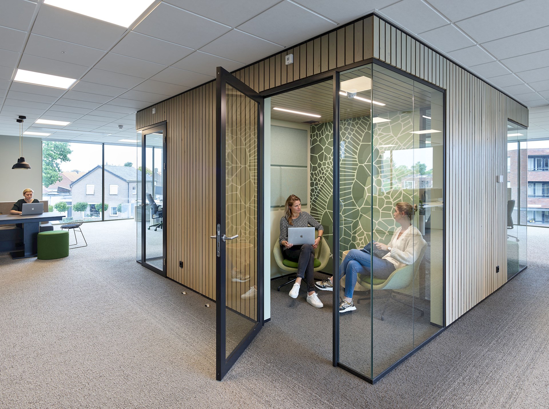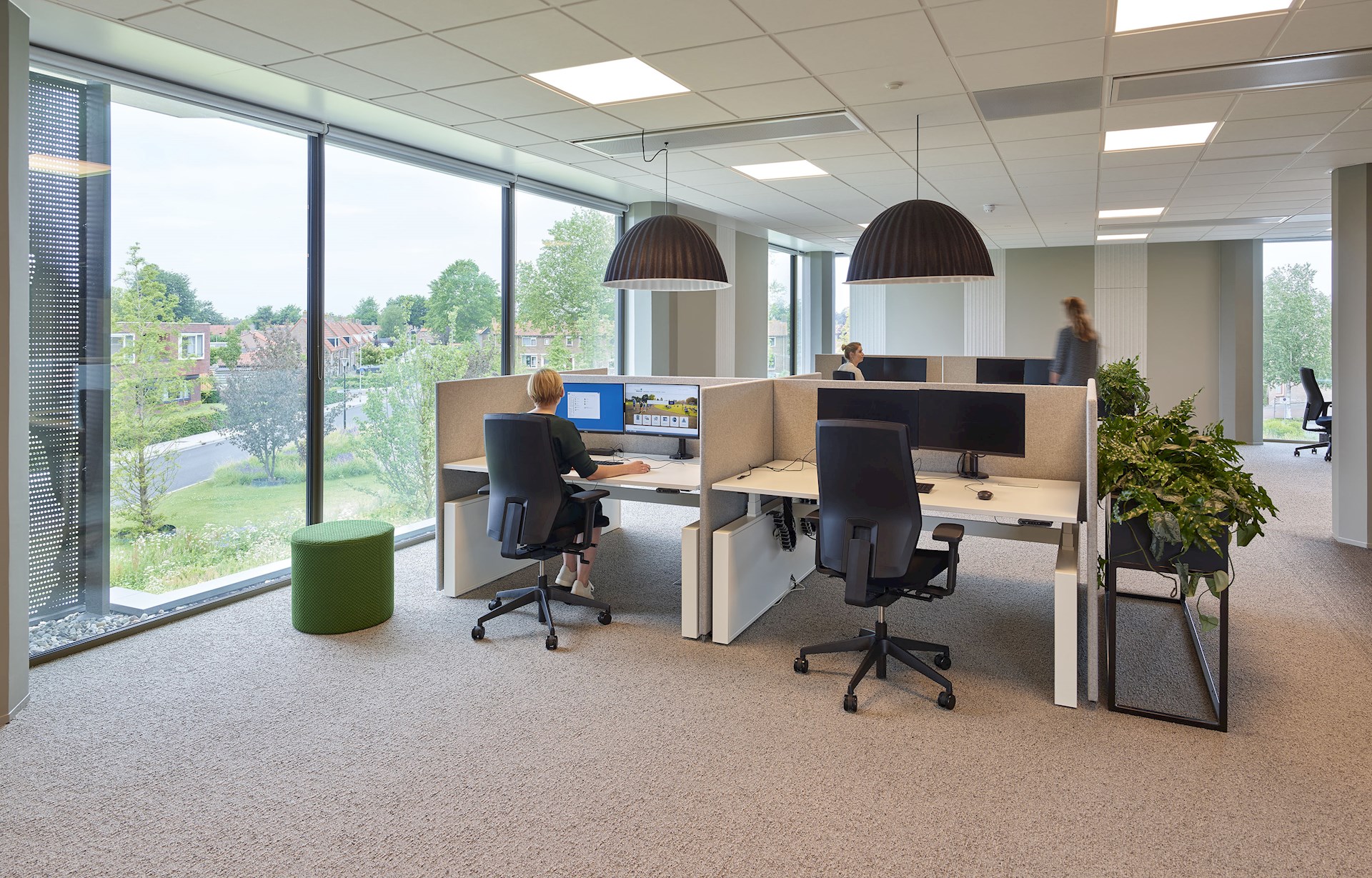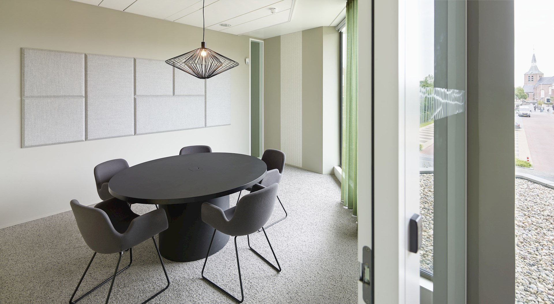 Extra aandacht hebben we besteed aan de beplanting in de werkomgeving. De toepassing van veel groen zorgt voor een gezond binnenklimaat en daarnaast heeft uitzicht op groen een bewezen stressverlagend effect. Ook op de wanden versterken we de relatie met de groene omgeving van het gebouw door het gebruik van grafische patronen die zijn geïnspireerd op de nervenpatronen van de verschillende bomen uit de omgeving van het gemeentehuis. De akoestische panelen in lichtgrijze kleur vormen daarnaast een fraai abstract patroon op de wanden en dragen bij aan een aangenaam akoestisch binnenklimaat.