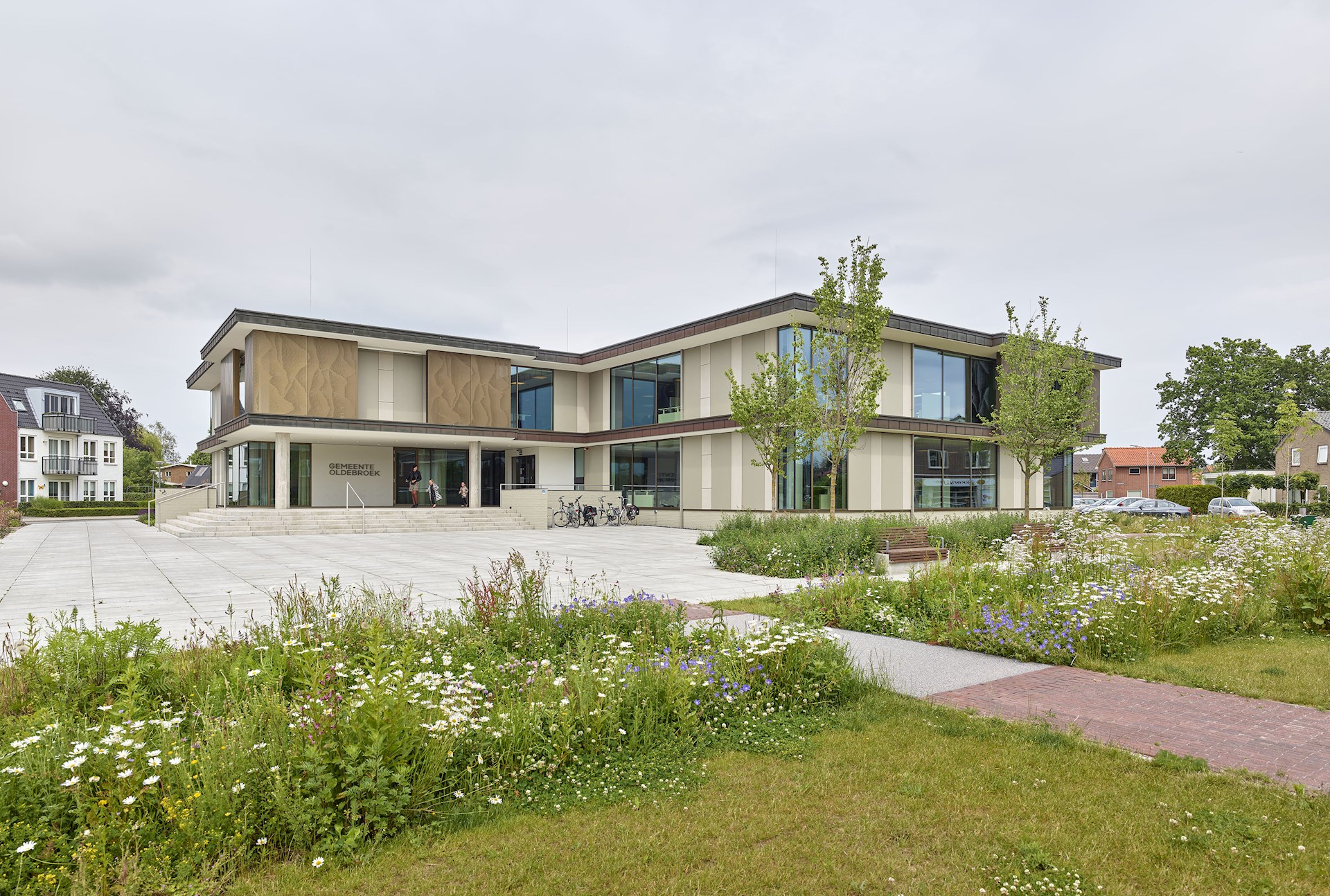 Karakteristiek voor de gemeente Oldebroek is de prachtige groene omgeving. Ook het gebied rondom het gemeentehuis kenmerkt zich door veel groen. Dit groene karakter wilden wij graag in het gebouw zichtbaar maken en interactie tussen binnen en buiten stimuleren. Het ontwerp van de gevel en het interieur is dan ook hand in hand ontwikkeld, waarbij gekeken is naar optimale daglichttoetreding in de kantooromgeving en zicht van binnen naar buiten.