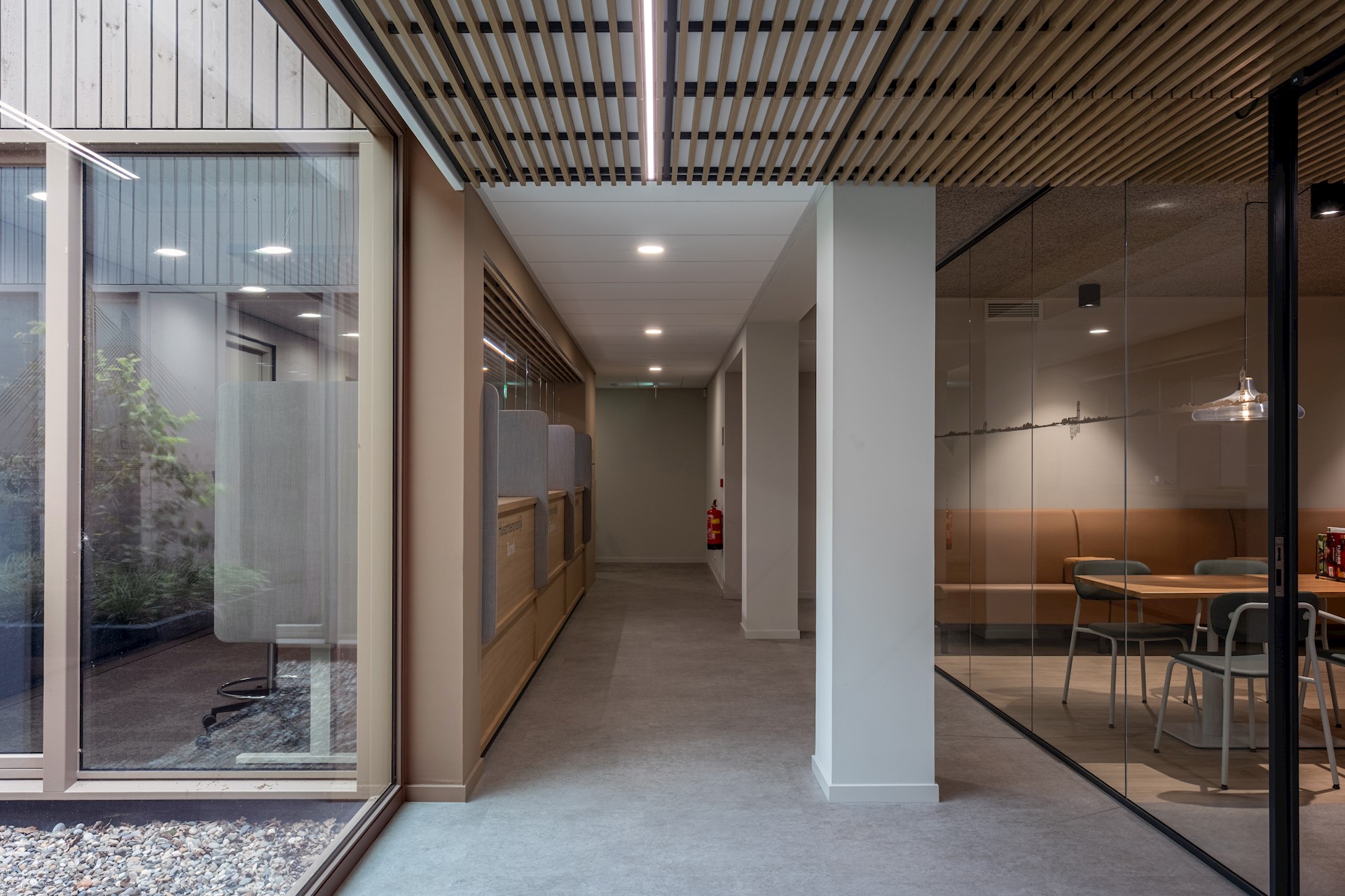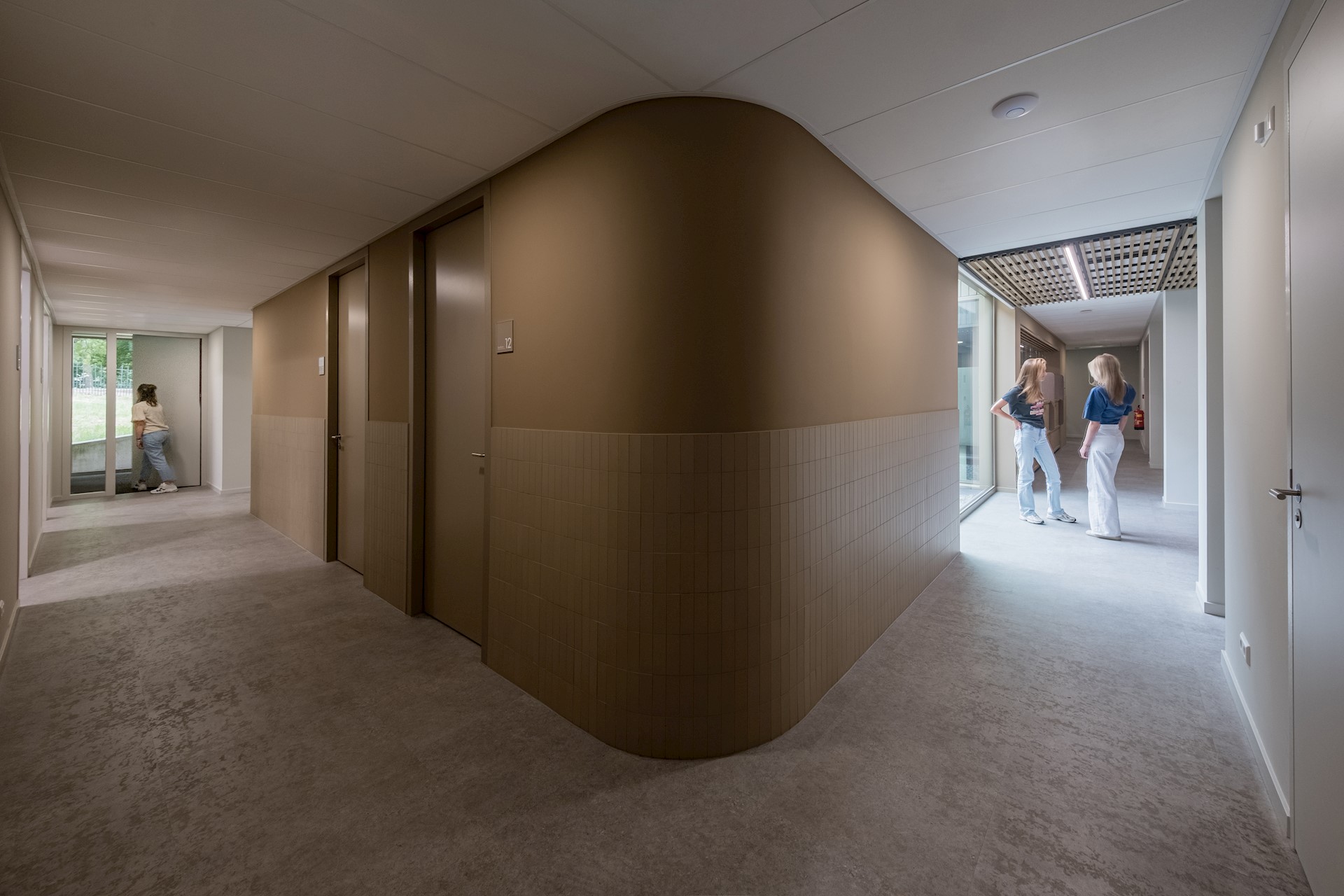 Deze ruimten zijn verbonden via een rondloop die door een accent in kleur en materiaal een uitgesproken karakter krijgt. De wachtruimte heeft warme materialen en een terughoudend kleurenpalet, wat een huiskamergevoel geeft. Bezoekers vinden vanuit daar eenvoudig hun weg naar de verschillende spreek- en behandelkamers.