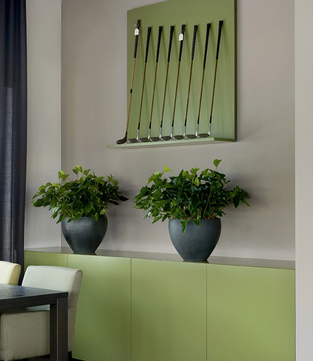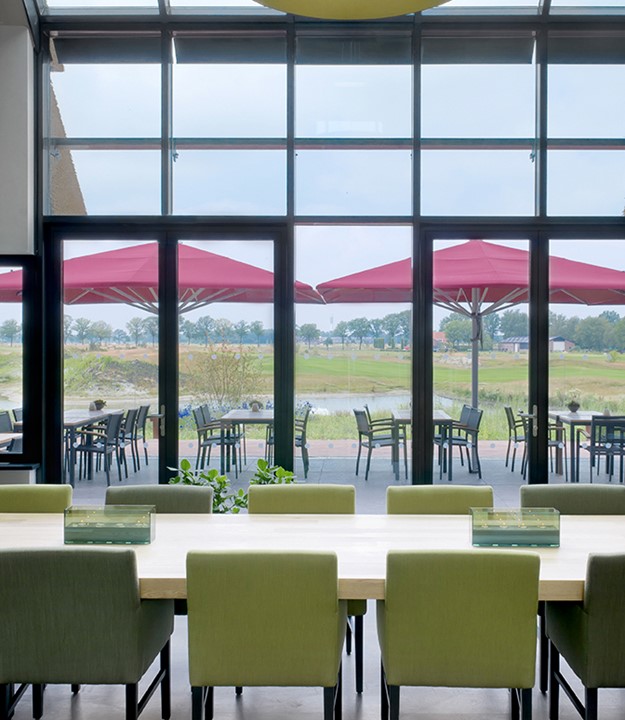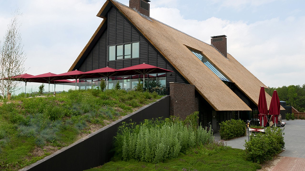 Om het zo goed mogelijk in het landschap in te passen, is het exterieur van het clubhuis samengesteld uit natuurlijke materialen zoals diep roodpaarse bakstenen, riet en donker hout. De gekozen vormgeving, kleuren en de detaillering zorgen voor een eigentijdse, landelijke uitstraling.