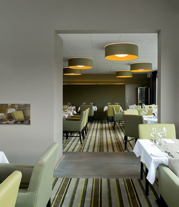 De centrale hal is letterlijk in het midden gesitueerd waardoor gangen nagenoeg niet voorkomen. Deze hal krijgt erg veel licht door grote glazen insnijdingen in de kap en ontwikkelt zich rond een vide met een royale trap. Die leidt op de eerste verdieping naar de belangrijkste verblijfsruimten, zoals de brasserie met verschillende sferen, het restaurant, de professionele keuken met bijruimten, en een zeer riant terras. En dat alles op niveau! De verhoogde ligging van deze ruimten en een rondlopende glasstrook in de gevels zorgt vanop elke plek in het clubhuis voor een riant uitzicht over de golfbanen.