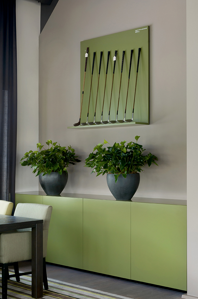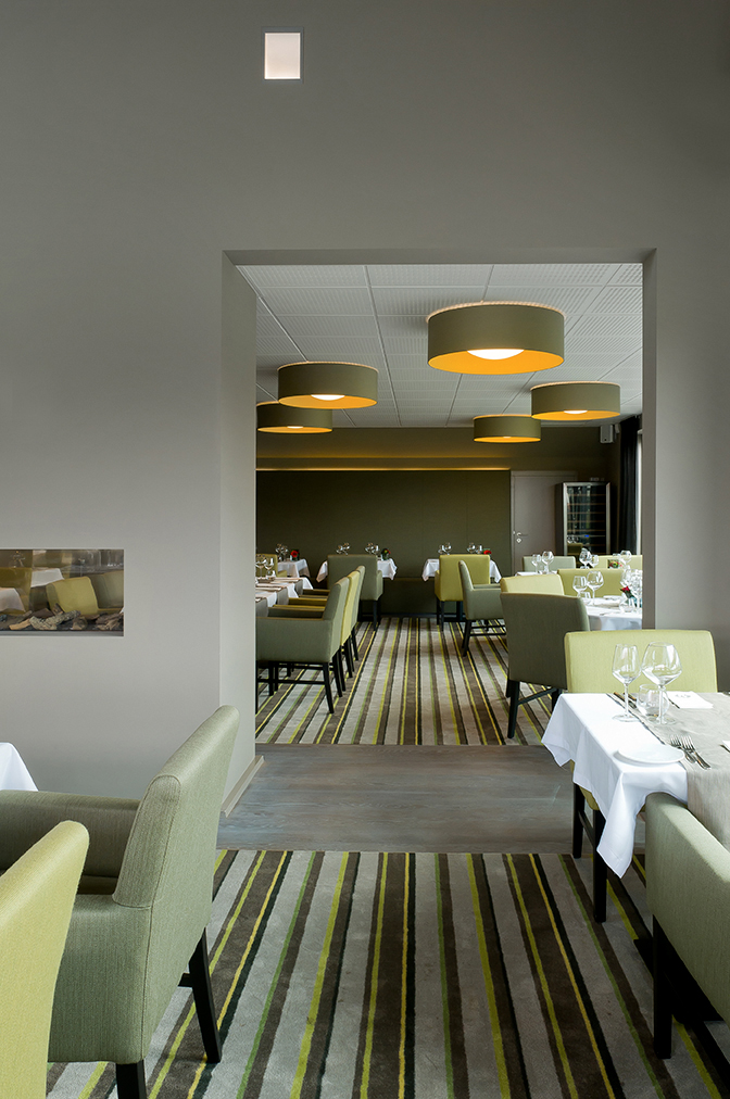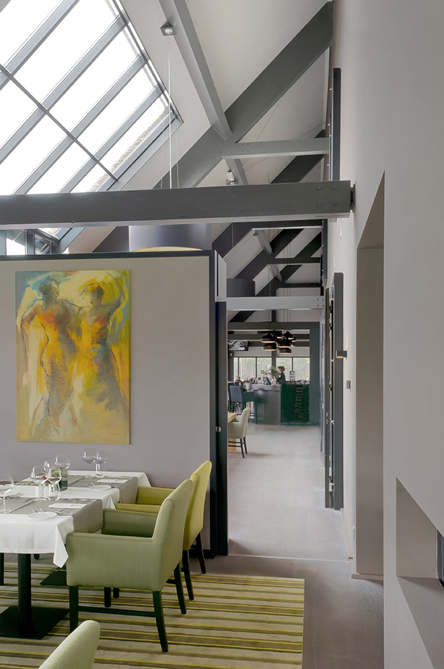 De centrale hal is letterlijk in het midden gesitueerd waardoor gangen nagenoeg niet voorkomen. Deze hal krijgt erg veel licht door grote glazen insnijdingen in de kap en ontwikkelt zich rond een vide met een royale trap. Die leidt op de eerste verdieping naar de belangrijkste verblijfsruimten, zoals de brasserie met verschillende sferen, het restaurant, de professionele keuken met bijruimten, en een zeer riant terras. En dat alles op niveau! De verhoogde ligging van deze ruimten en een rondlopende glasstrook in de gevels zorgt vanop elke plek in het clubhuis voor een riant uitzicht over de golfbanen.