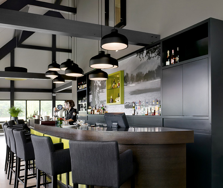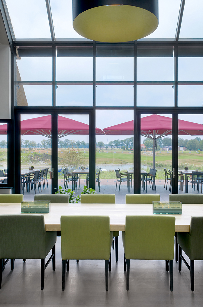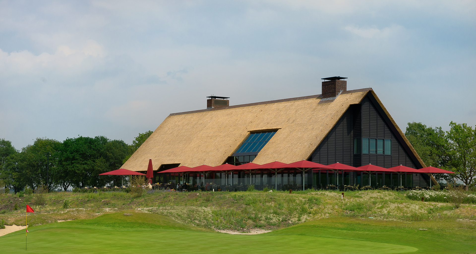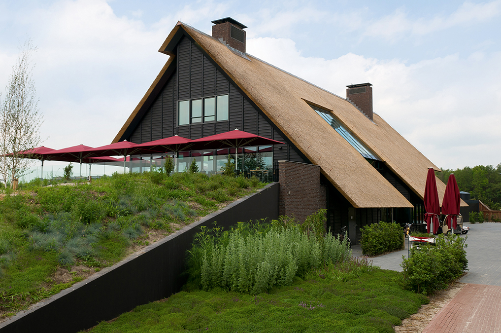 Om het zo goed mogelijk in het landschap in te passen, is het exterieur van het clubhuis samengesteld uit natuurlijke materialen zoals diep roodpaarse bakstenen, riet en donker hout. De gekozen vormgeving, kleuren en de detaillering zorgen voor een eigentijdse, landelijke uitstraling.