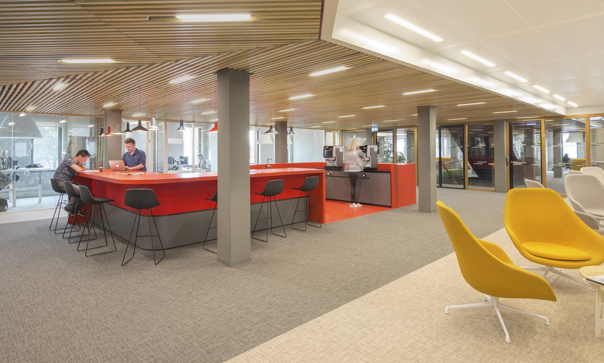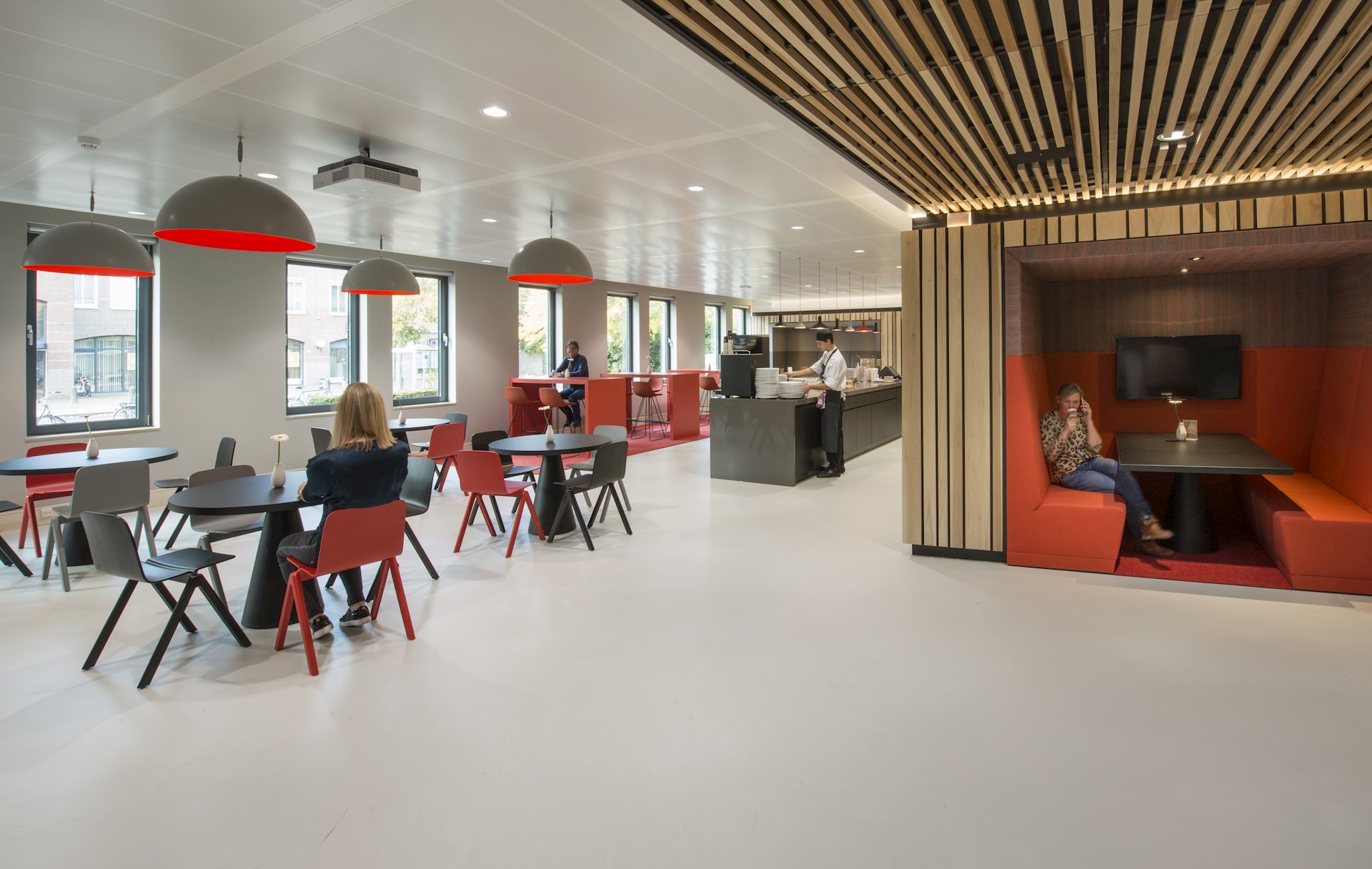 Op de begane grond loopt het openbare gebied vanaf de centrumzijde door naar de parkzijde. Hier liggen de functies van het KAC, de bibliotheek en ketenpartners verdeeld. Er zijn géén specifieke, eigen domeinen, maar de gebruiksgroepen zijn juist gemixt om zo optimale synergie te bereiken. Aan het openbare gebied liggen de multifunctionele ruimte en de creativiteitsversneller. De multifunctionele ruimte is middels taatsdeuren te combineren met de bedrijfskantine. De bedrijfskantine ligt op de begane grond in het privédomein en staat via een brede open trap in verbinding met de werkgebieden op de eerste verdieping.