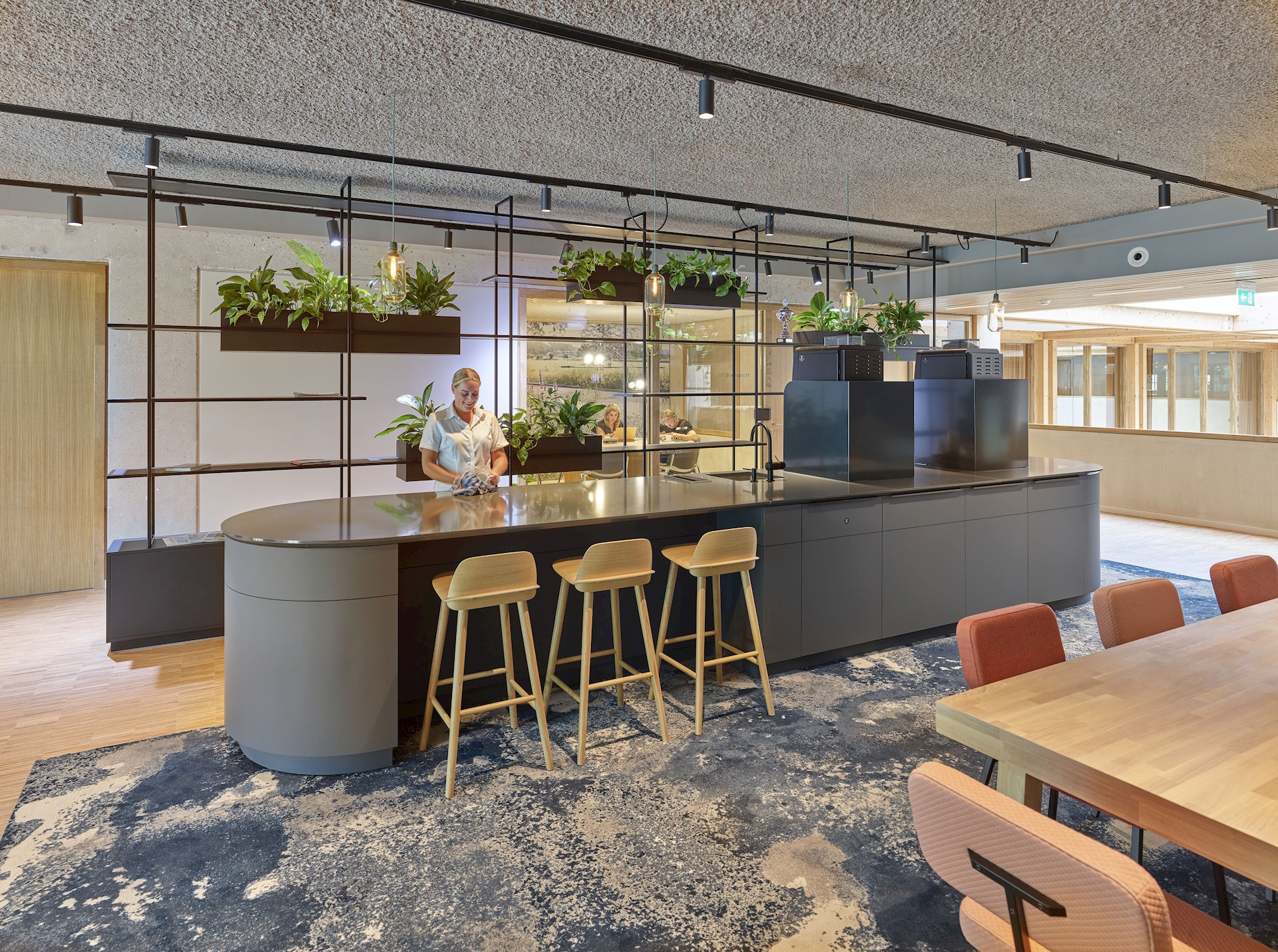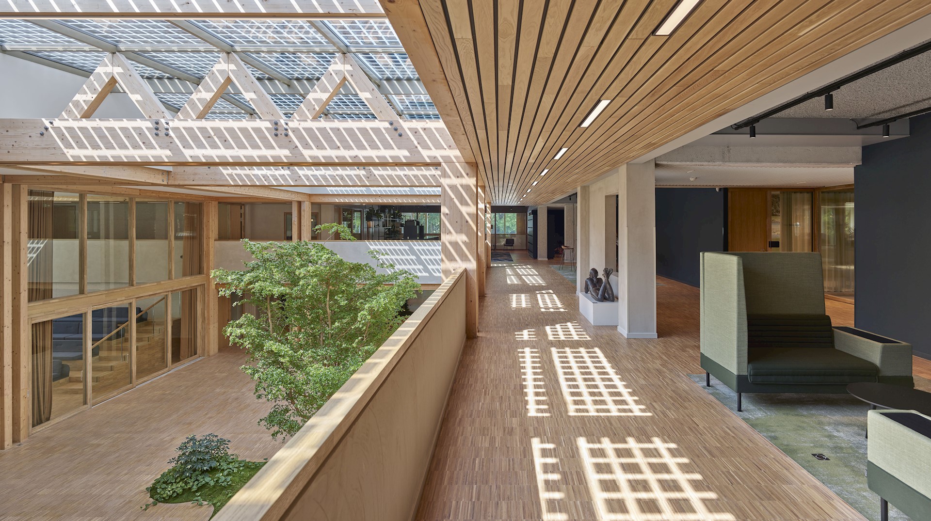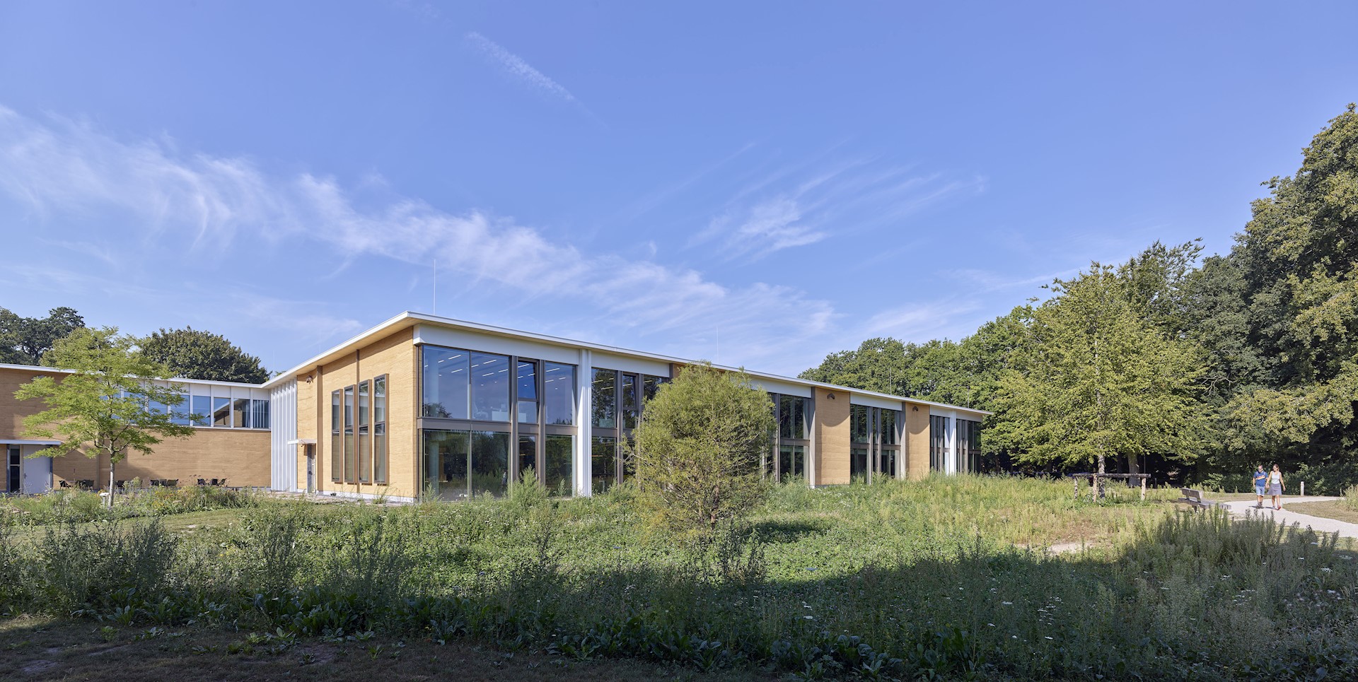 In het nieuwe ontwerp zijn we gaan voortborduren op de mooie structuur. Om een compacter volume te maken is het voorplein bebouwd met een constructie die precies aansluit op de constructieve lijnen van het oorspronkelijke gebouw. Vanuit de biobased gedachte is het gemaakt van gelamineerd hout. Binnenin wordt direct duidelijk welke onderdelen tot de oorspronkelijke constructie behoren en welke nieuw zijn. De bestaande constructie is nog meer dan vroeger zichtbaar en de nieuwe indeling is volledig afgestemd op de constructielijnen.