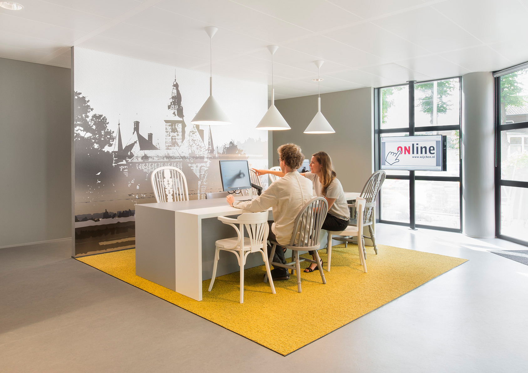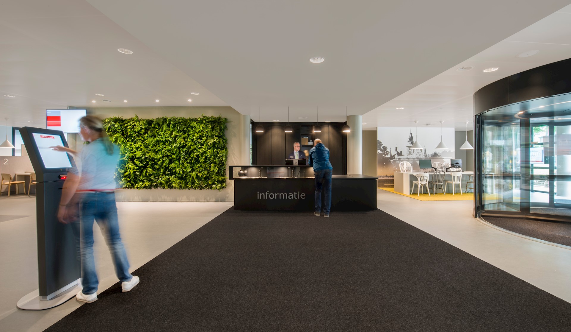 De centrale ontvangsthal is door de lichtinval, ruimtelijke en transparante opzet uitnodigend voor de burgers, medewerkers en vooral ook de raadsleden van de gemeente die hier fractievergaderingen houden in de vergaderkamers. Deze zijn vernoemd naar de zeven Wijchense dorpskernen: Alverna, Balgoij, Niftrik, Batenburg, Bergharen, Hernen en Leur.