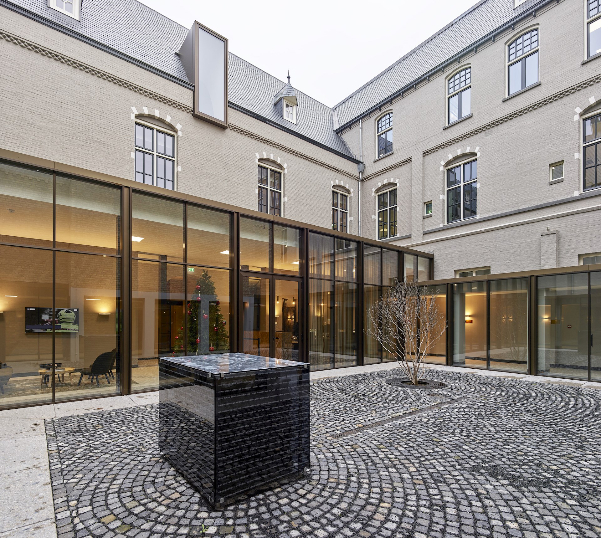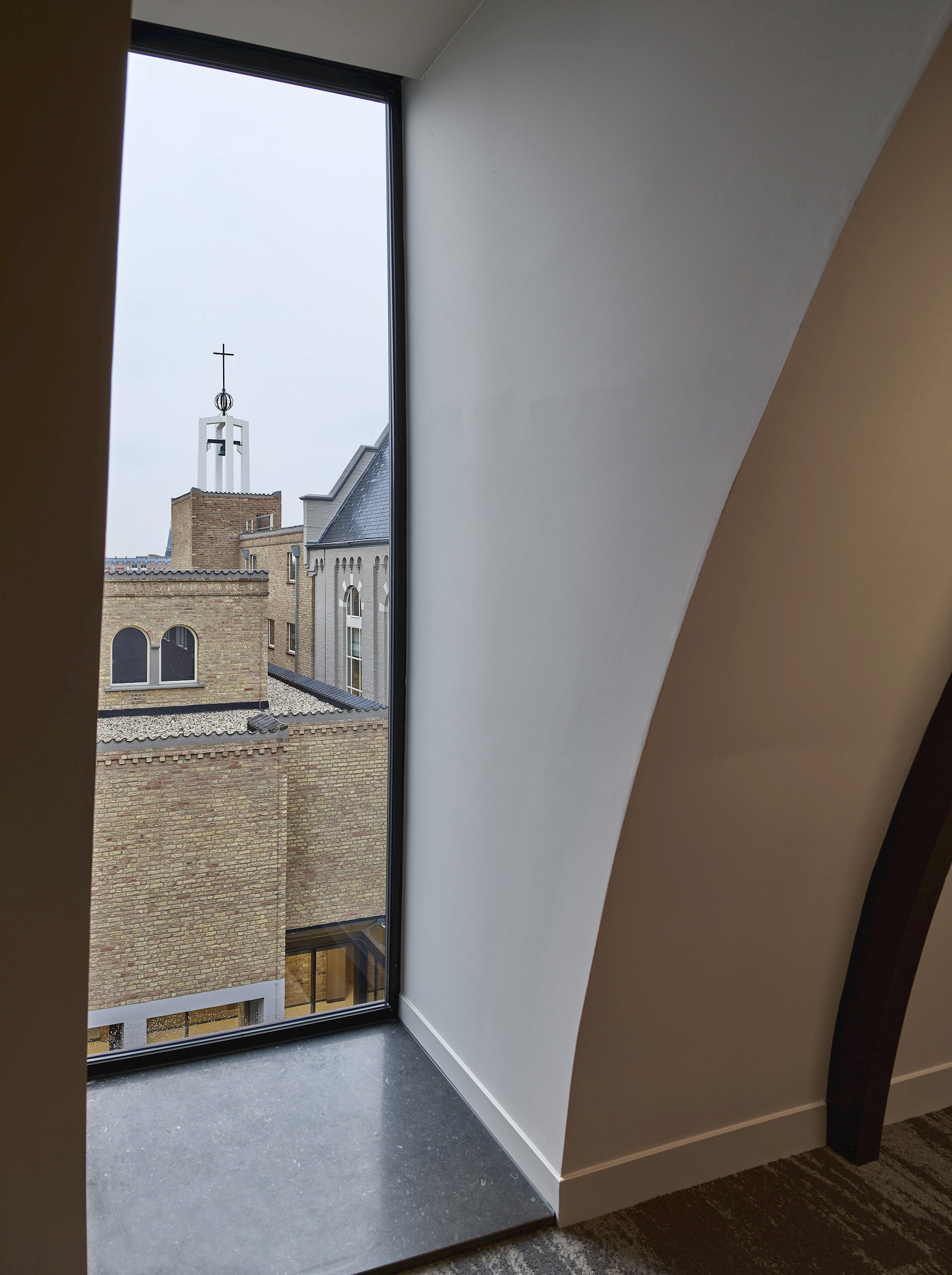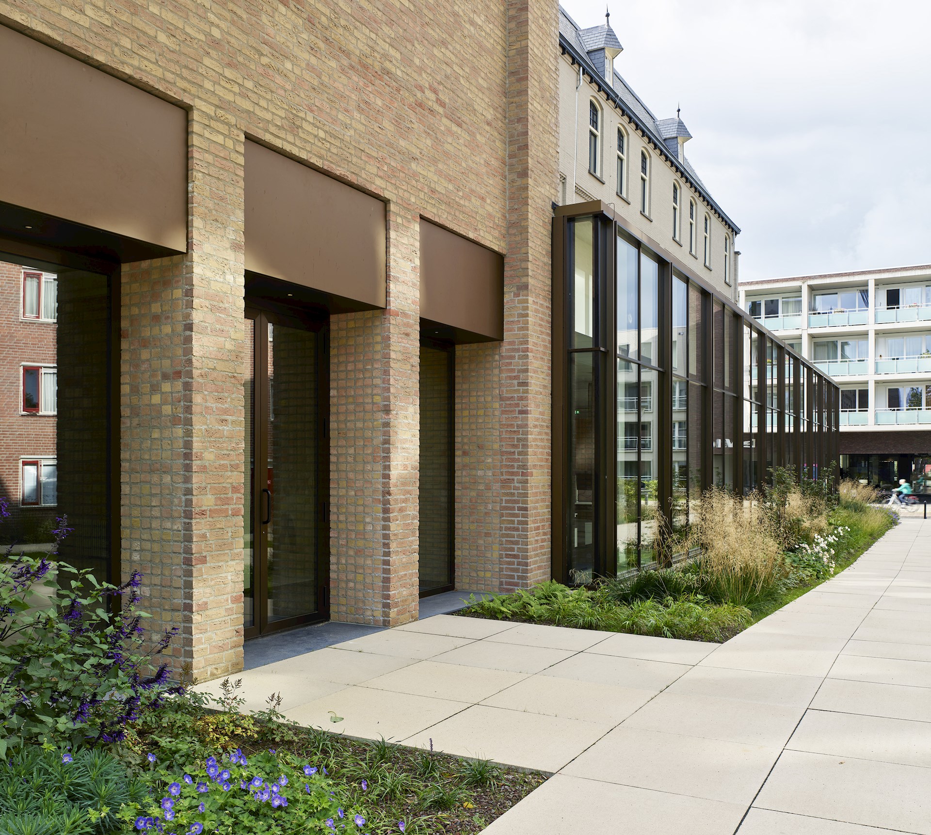 We hebben daarom met onze interventies geprobeerd om een logische volgende stap te zetten in de ontwikkeling van het complex, door alle delen die nieuw werden aangebouwd op een herkenbare, eigentijdse manier vorm te geven. De nieuwe kloostergang aan de patio en de glazen uitbreidingen aan de achtergevel en de linker zijgevel, zijn daarom allemaal op een eenduidige manier opgetrokken uit ranke, brons geanodiseerde aluminium vliesgevels. De eenheid tussen de drie bouwstijlen is daarbij gezocht in de vormgeving, de ritmes en de zorgvuldige detaillering. De twee gesloten nieuwe bouwdelen die we aan de achterkant van het monument hebben toegevoegd zijn uitgevoerd met nieuwe bakstenen die in vorm en kleur nagenoeg gelijk zijn aan de stenen uit de tweede bouwperiode in de jaren ’50. Hierdoor vormen deze nieuwe bouwdelen samen met de bestaande kapel, de klokkentoren en het trappenhuis in de achtergevel van het gebouw een fraaie en rustige compositie van geometrische blokken in dezelfde kleur en textuur. Door het metselwerk van de nieuwe bouwdelen echter uit te voeren in een tegelverband wordt in tweede instantie het verschil duidelijk tussen de historische en de nieuwe bouwdelen. Zo hebben we samen met Berghege en haar onderaannemers consciëntieus gewerkt aan een verfijnde vormgeving van de nieuwe gevels.