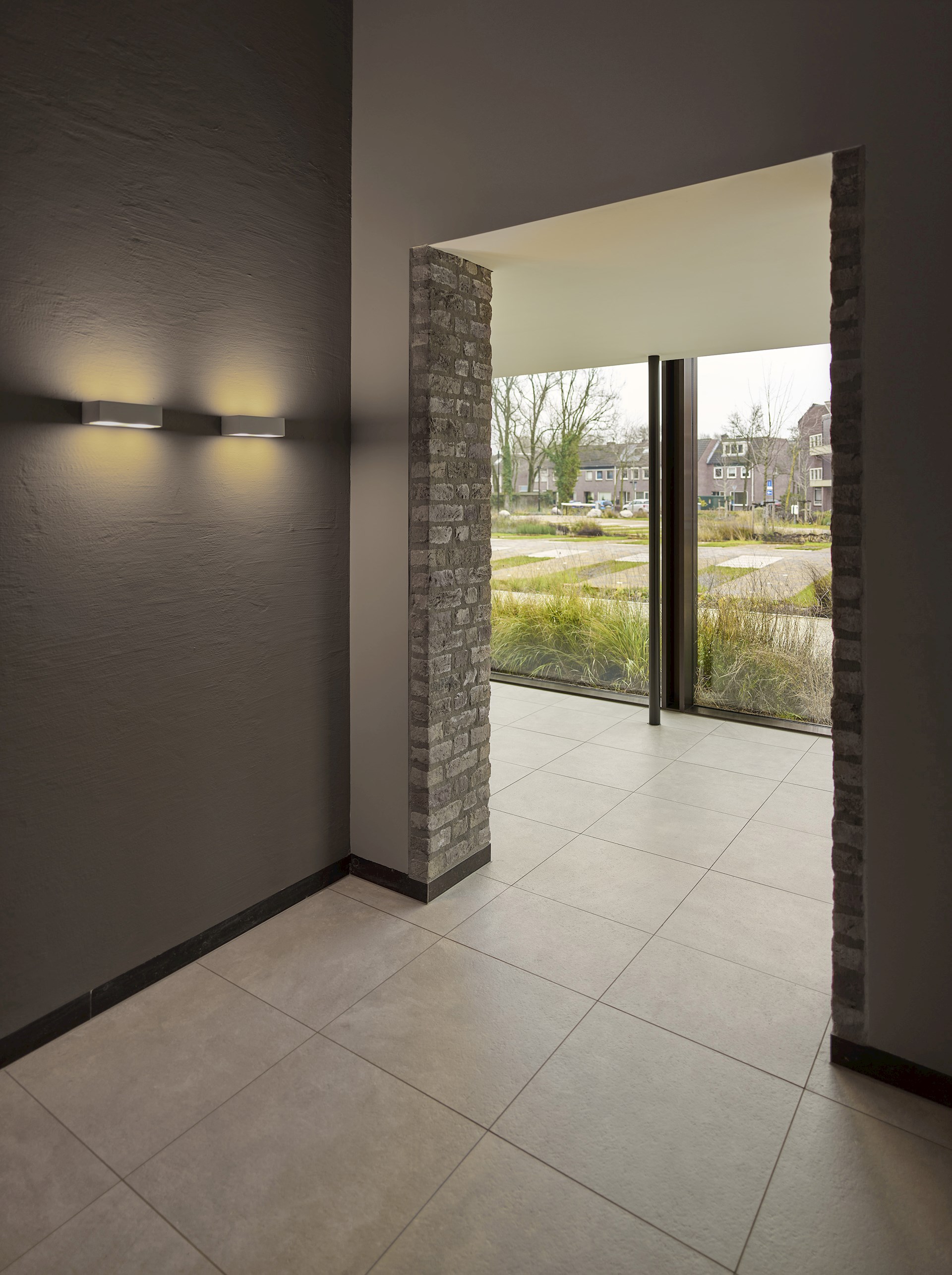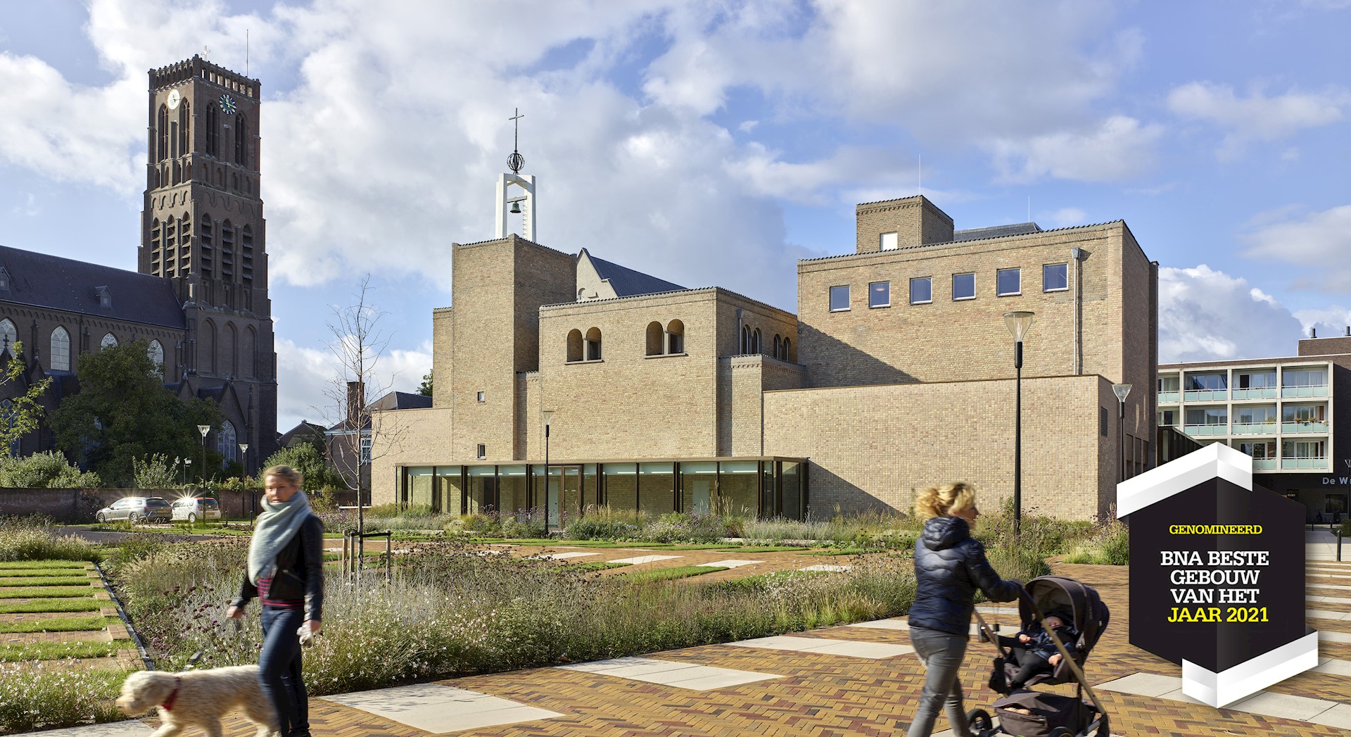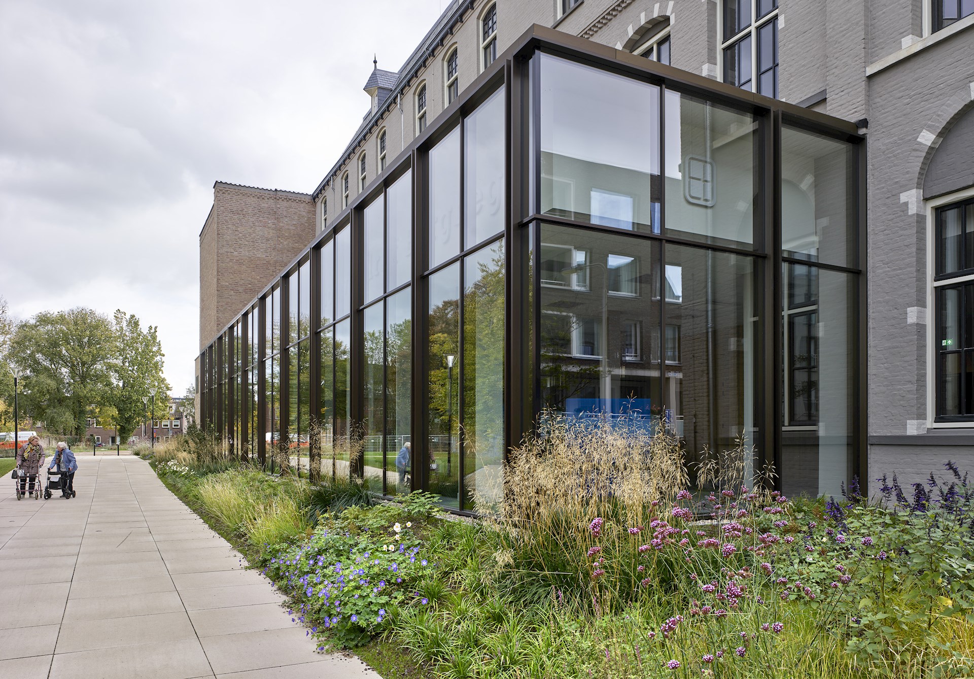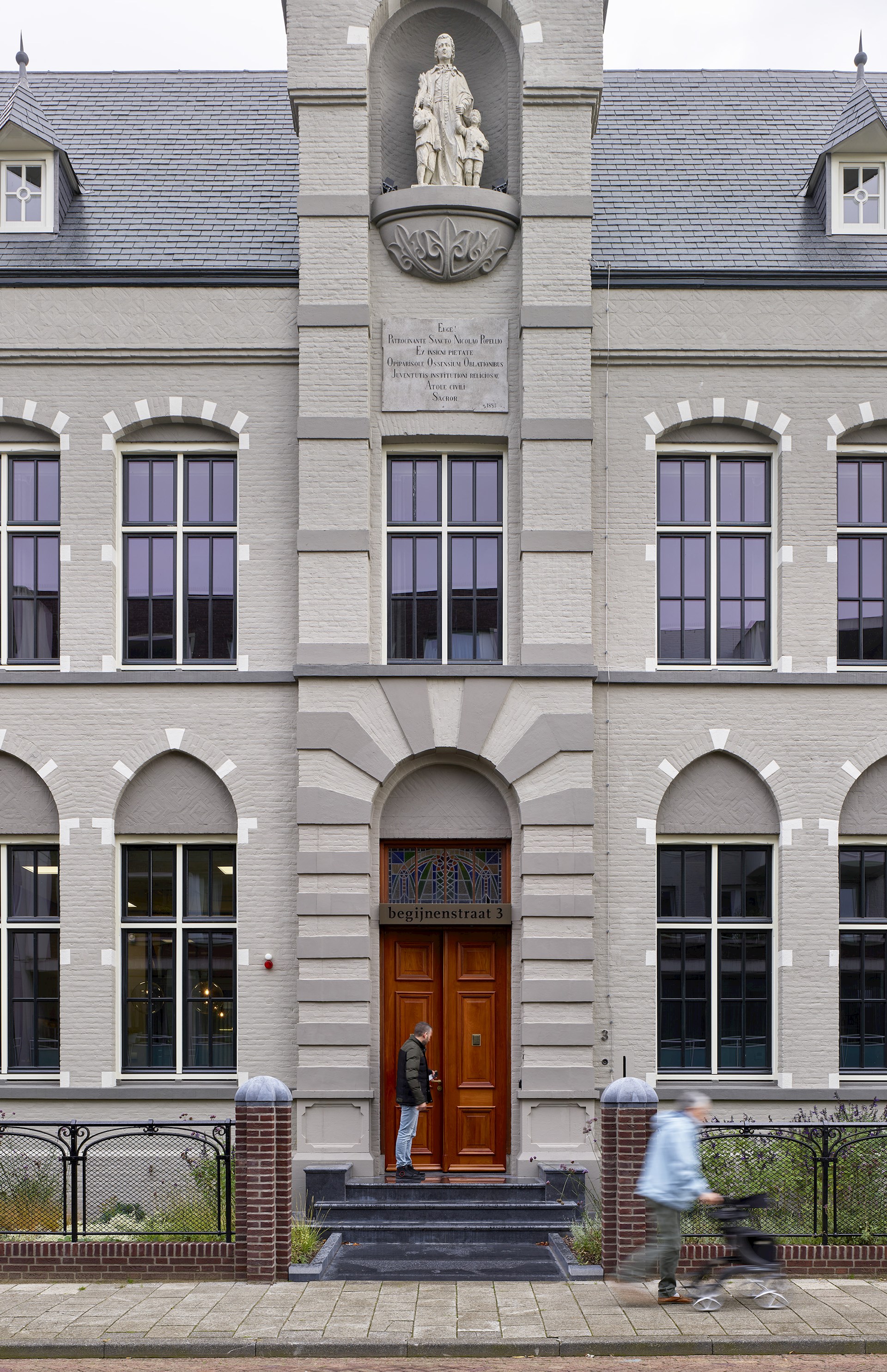 We hebben daarom met onze interventies geprobeerd om een logische volgende stap te zetten in de ontwikkeling van het complex, door alle delen die nieuw werden aangebouwd op een herkenbare, eigentijdse manier vorm te geven. De nieuwe kloostergang aan de patio en de glazen uitbreidingen aan de achtergevel en de linker zijgevel, zijn daarom allemaal op een eenduidige manier opgetrokken uit ranke, brons geanodiseerde aluminium vliesgevels. De eenheid tussen de drie bouwstijlen is daarbij gezocht in de vormgeving, de ritmes en de zorgvuldige detaillering. De twee gesloten nieuwe bouwdelen die we aan de achterkant van het monument hebben toegevoegd zijn uitgevoerd met nieuwe bakstenen die in vorm en kleur nagenoeg gelijk zijn aan de stenen uit de tweede bouwperiode in de jaren ’50. Hierdoor vormen deze nieuwe bouwdelen samen met de bestaande kapel, de klokkentoren en het trappenhuis in de achtergevel van het gebouw een fraaie en rustige compositie van geometrische blokken in dezelfde kleur en textuur. Door het metselwerk van de nieuwe bouwdelen echter uit te voeren in een tegelverband wordt in tweede instantie het verschil duidelijk tussen de historische en de nieuwe bouwdelen. Zo hebben we samen met Berghege en haar onderaannemers consciëntieus gewerkt aan een verfijnde vormgeving van de nieuwe gevels.