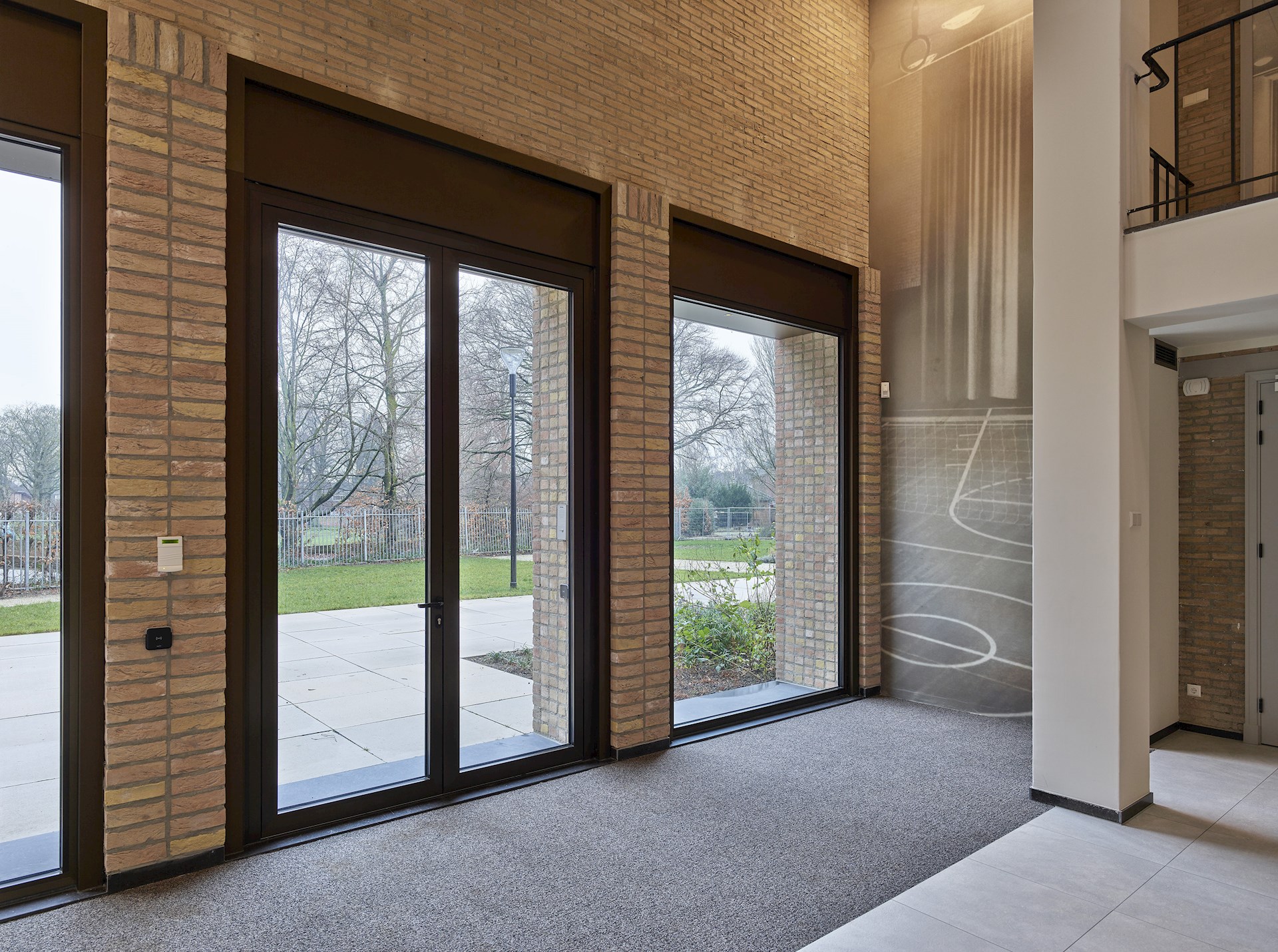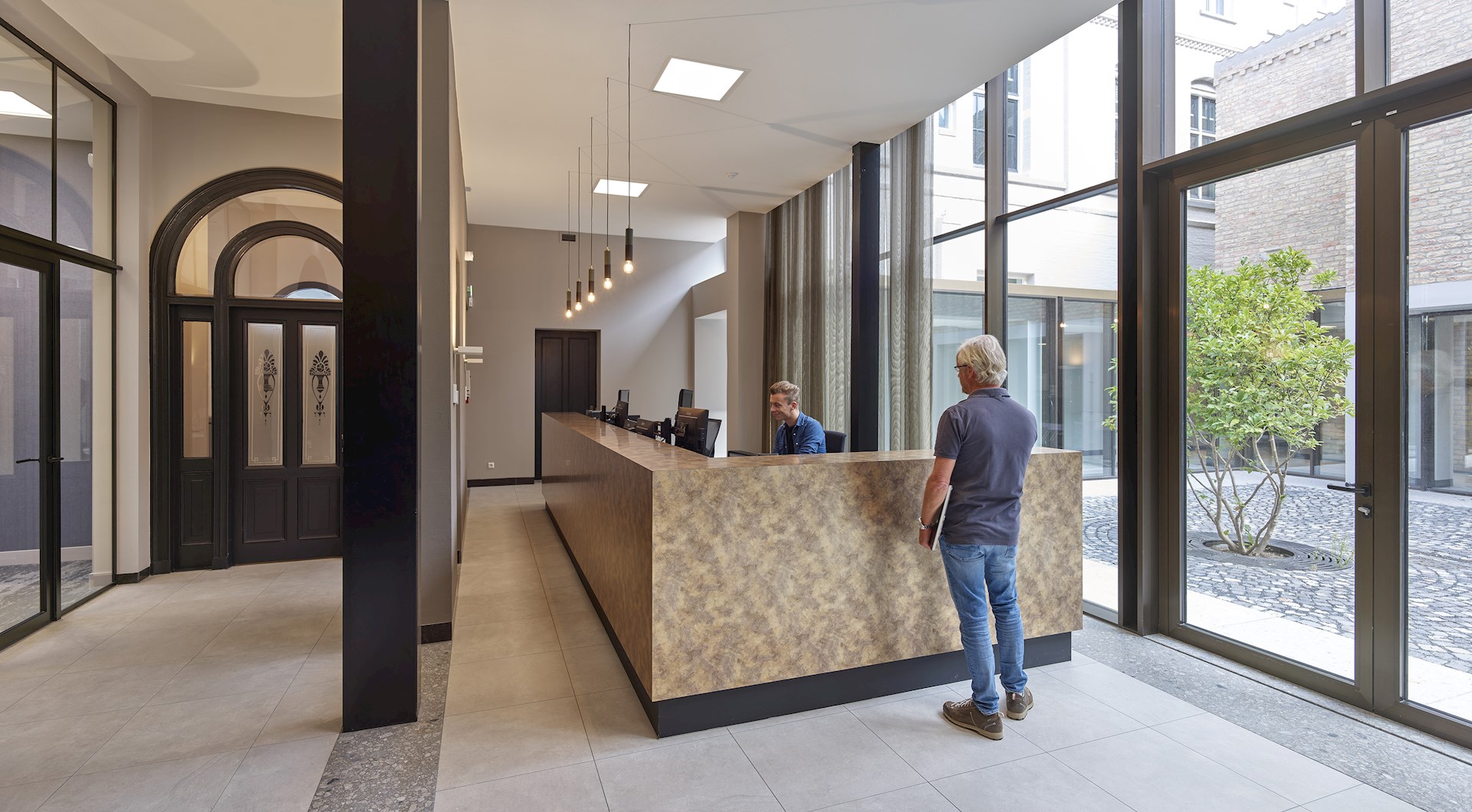 Bij binnenkomst door de hoofdentree wordt de bezoeker aangetrokken door het licht, met zicht op de patio en daaromheen een prachtige rondgang (de voormalige kloostergang). Op deze plek komen de drie bouwperioden op een prachtige manier samen. De bestaande deuren, die uit de vroegste periode stammen, zijn gemaakt van antraciet. De tinten en materialen die in deze ruimte zijn gebruikt hebben een rijke uitstraling. De ruimte heeft een warme sfeer, onder meer door de natuurstenen vloer, de bronskleurige pui en het gebruik van aardse kleuren. De balie is op een eigentijdse manier vormgegeven en uitgevoerd in een bronskleurig materiaal.