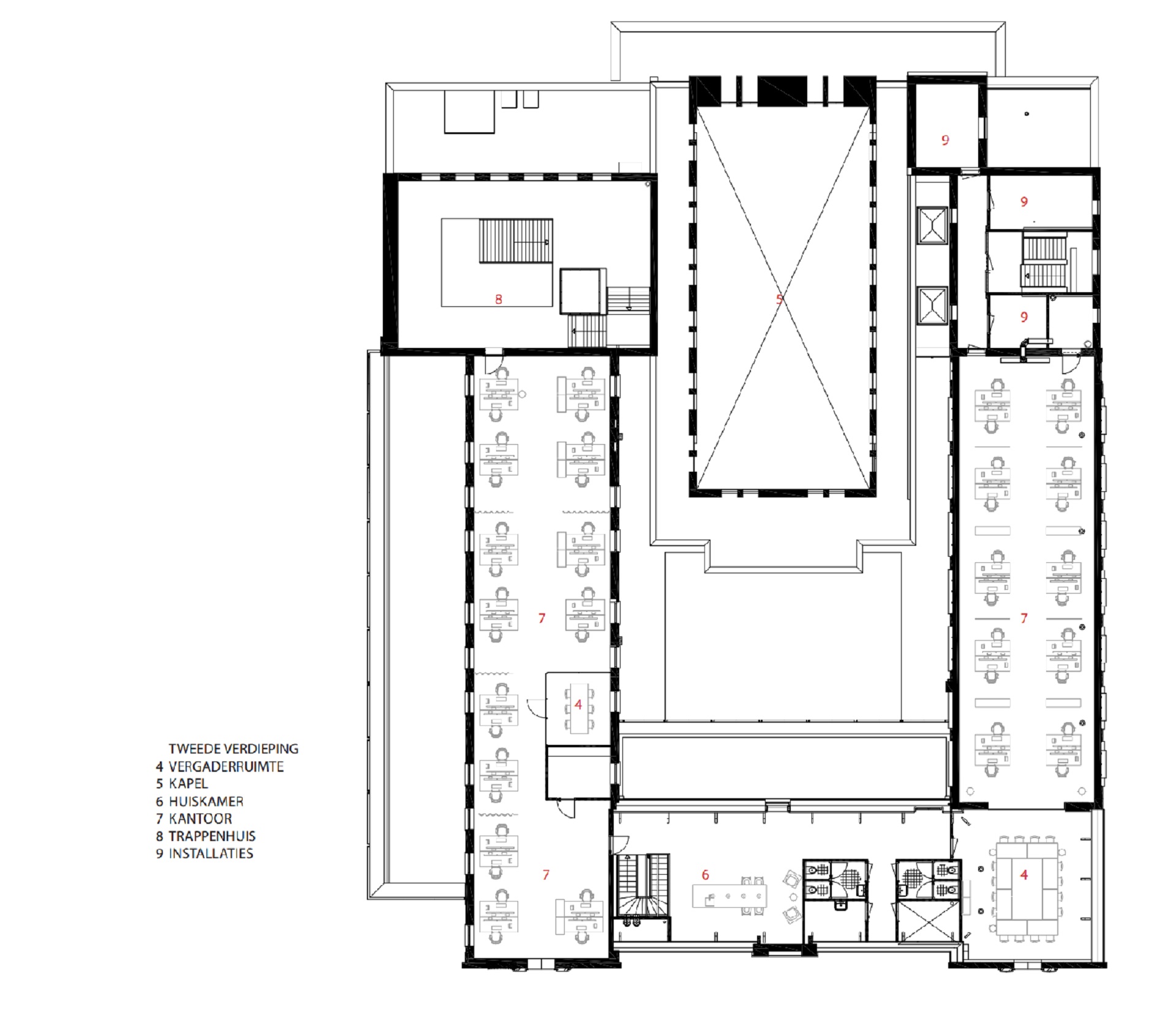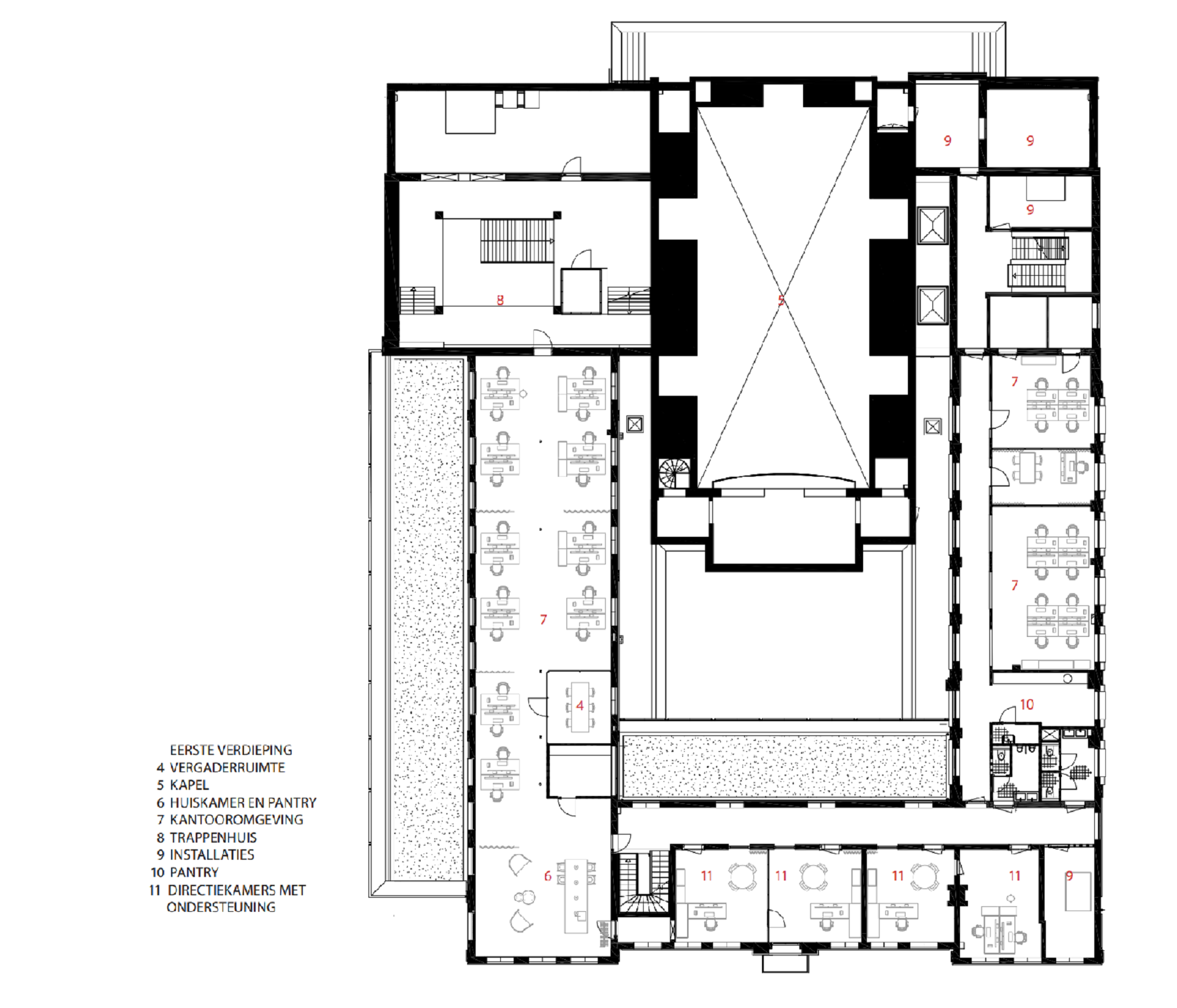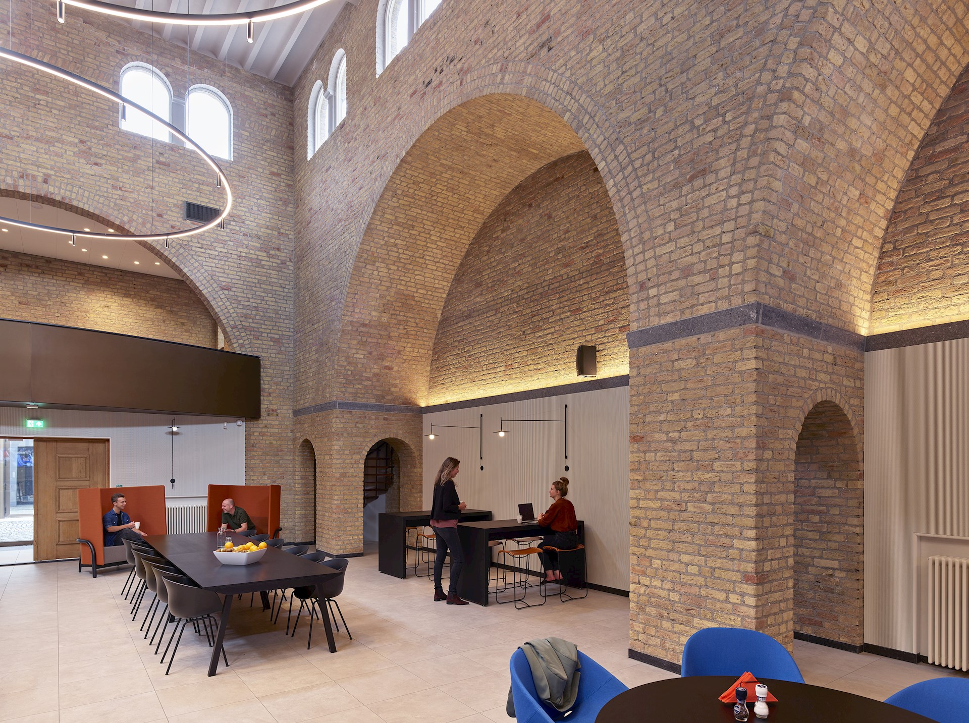 De centraal gelegen kapel uit de tweede bouwperiode fungeert als ontmoetingsruimte. Een multifunctionele plek waar het personeel luncht en bezoekers worden ontvangen, maar waar ook scrumsessies en bouwvergaderingen worden gehouden. In de hoge ruimte worden de prachtige gewelfvormen door middel van lichtinval geaccentueerd. De demontabele akoestische wandafwerking in lichte kleur zorgt voor een serene sfeer en een aangename ruimteakoestiek.