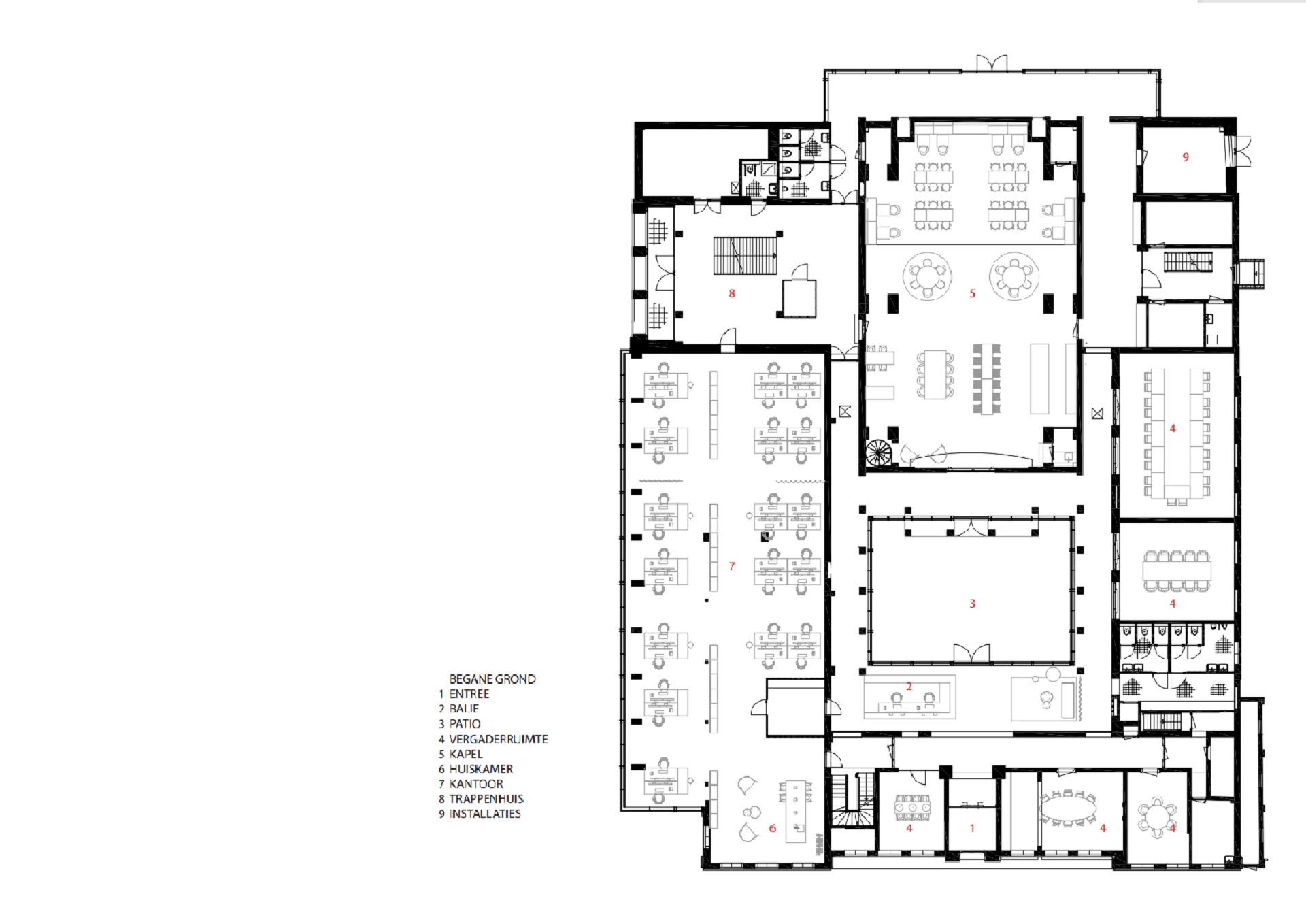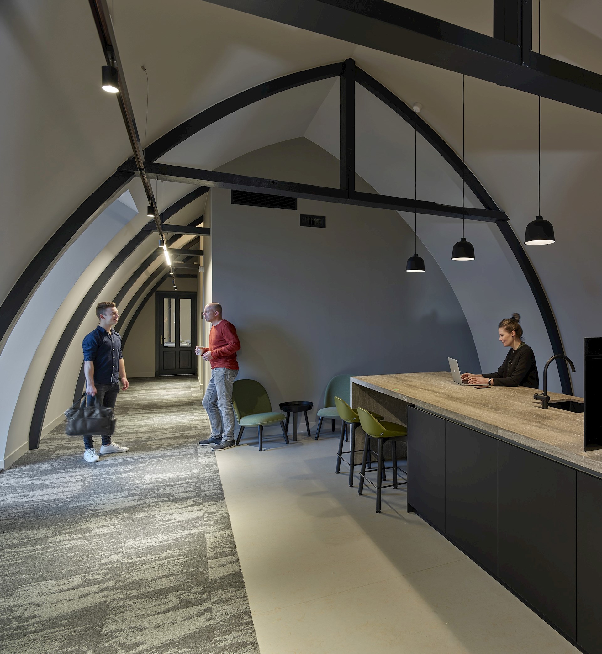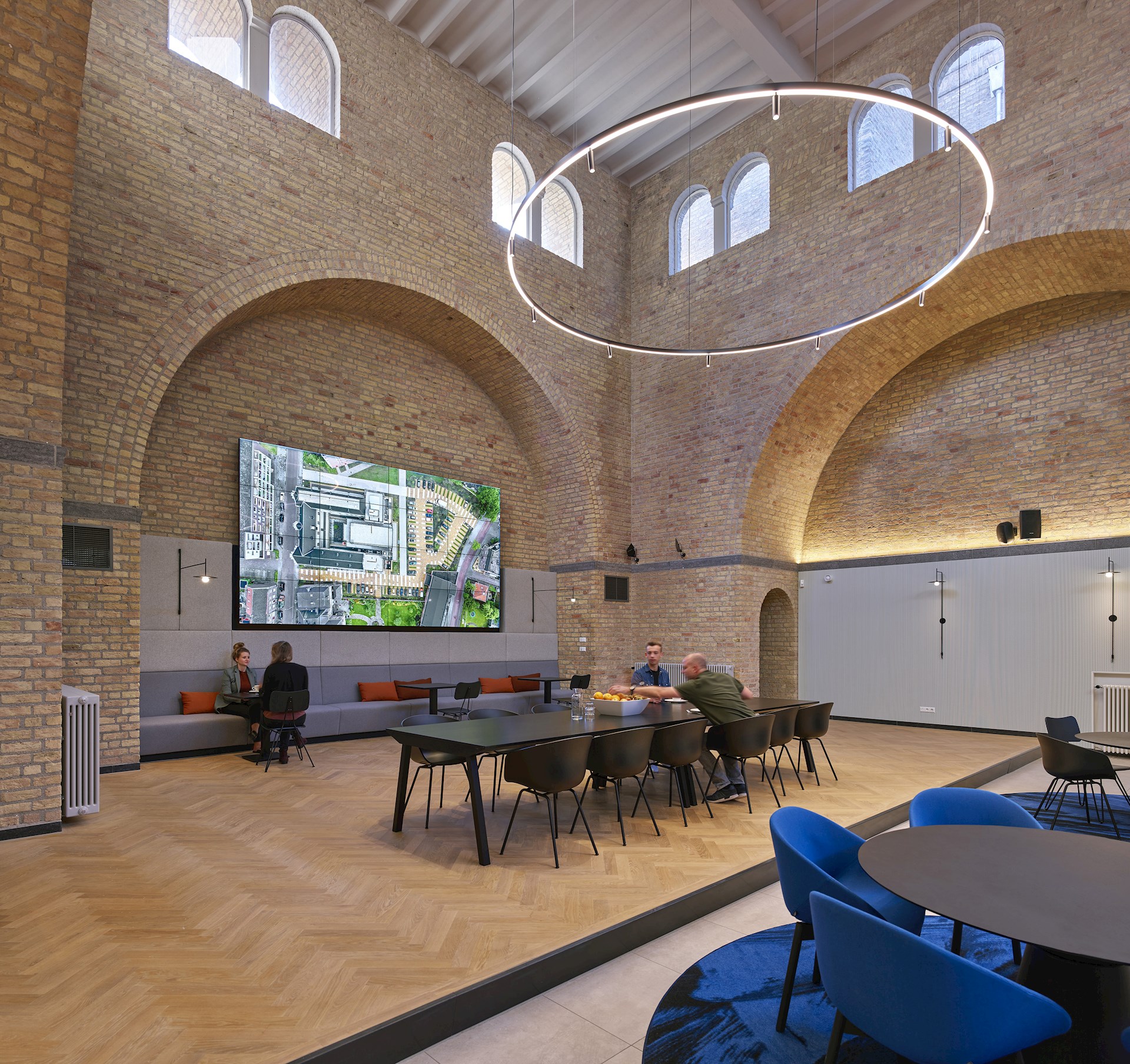 De centraal gelegen kapel uit de tweede bouwperiode fungeert als ontmoetingsruimte. Een multifunctionele plek waar het personeel luncht en bezoekers worden ontvangen, maar waar ook scrumsessies en bouwvergaderingen worden gehouden. In de hoge ruimte worden de prachtige gewelfvormen door middel van lichtinval geaccentueerd. De demontabele akoestische wandafwerking in lichte kleur zorgt voor een serene sfeer en een aangename ruimteakoestiek.