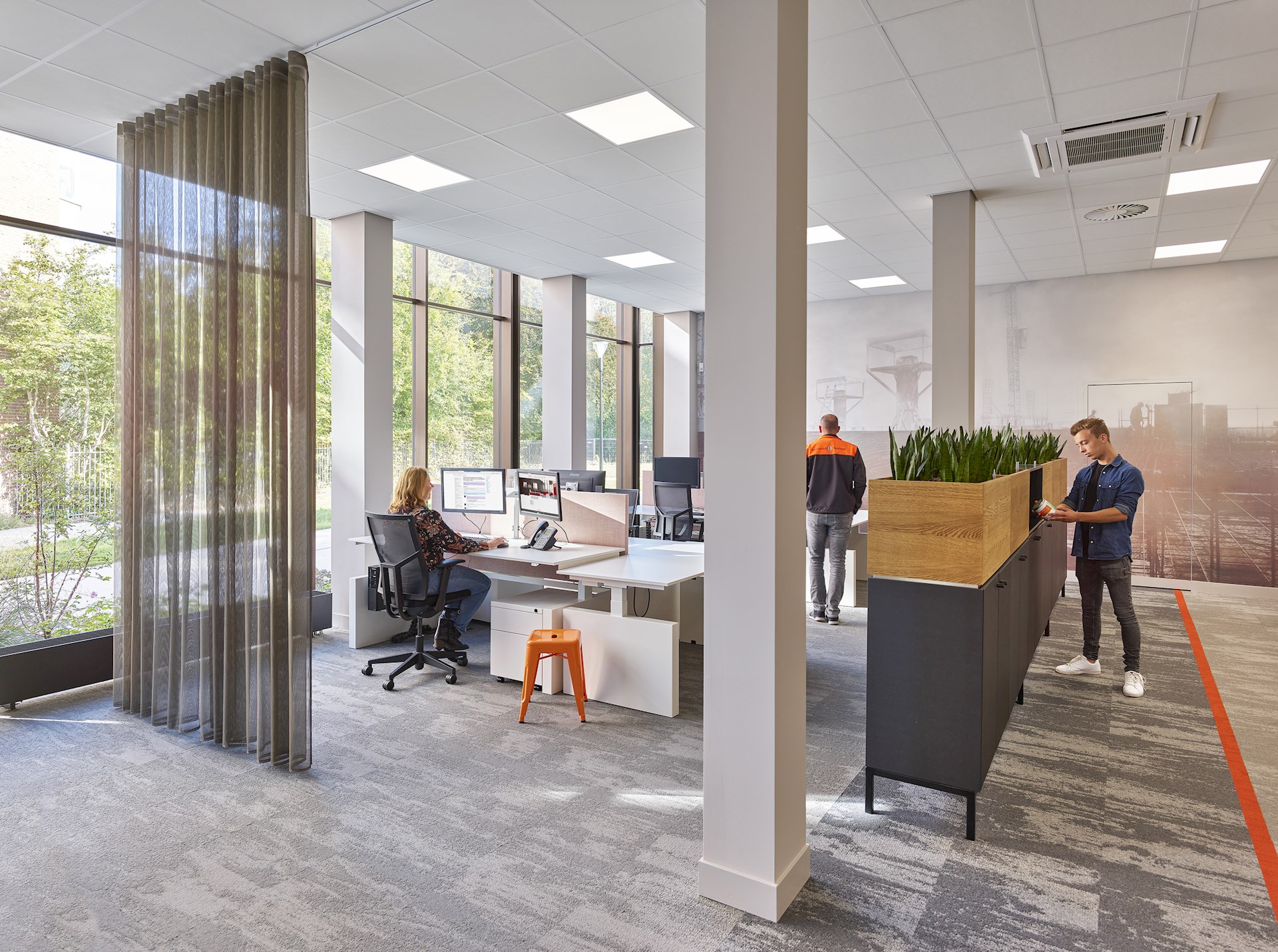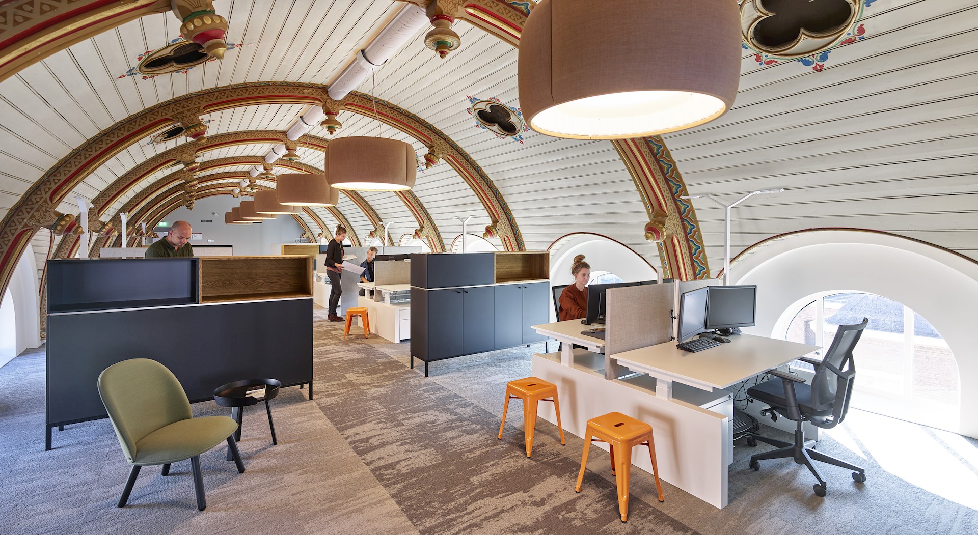 De verschillende werkverdiepingen bevatten eenzelfde frisse en ingetogen sfeer. De meer dynamische plekken, zoals de overlegruimtes, hebben we geaccentueerd met meer kleur. Op de tweede verdieping bevindt zich een zeer bijzondere werkomgeving. Hier is het plafond van de vroegere kapel uit de eerste bouwperiode namelijk zichtbaar: een in bonte kleuren houtafwerking met gouden details en siersnijwerk. Deze prachtige ornamentering vonden wij verstopt onder een systeemplafond. Ook hier zijn werkplekken gesitueerd. Deze werkplekken zijn opgezet in een kleine schaal, om de ruimte akoestisch aangenaam te houden. De sfeerverlichtingsarmaturen die wij hebben toegevoegd dragen bij aan een verdere verbetering van de akoestiek. Het daglicht komt hier laag binnen, waardoor we ervoor kozen om extra daglicht simulatie lampen aan de werkplekken toe te voegen. Ook hier is gekozen voor rijke materialen zoals eikenhout. Door gekleurd MDF met subtiele details zoals een lichte bronskleurige rand, brengen we een verdere verfijning aan in deze ruimte.
