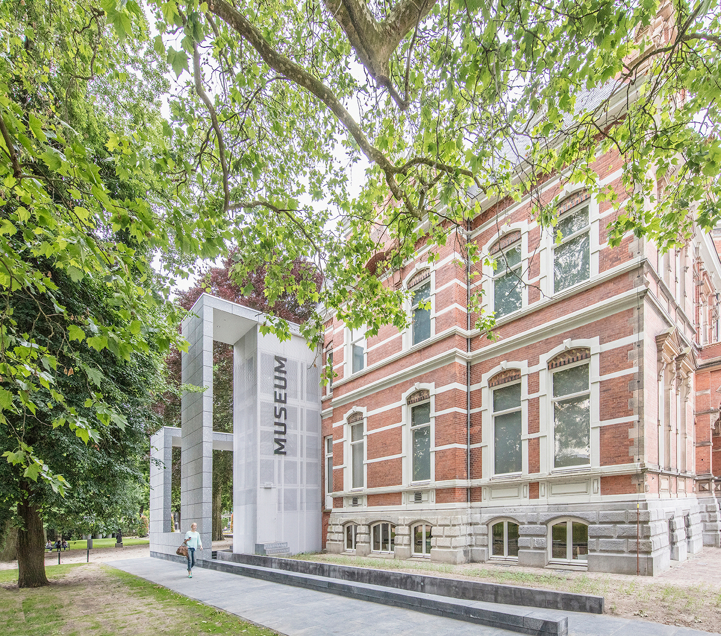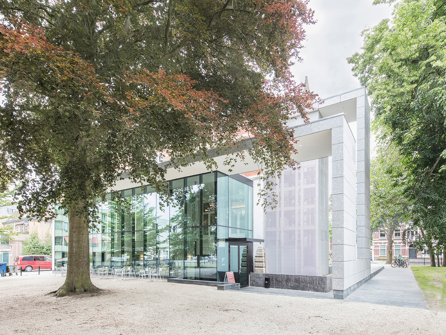 De nieuwbouw geeft een nieuw gezicht aan het museum aan de parkzijde, en integreert een bestaand vluchttrappenhuis in een omvattend architectonisch gebaar. Het vluchttrappenhuis is bekleed met lichtgrijs strekmetaal. Het entreegebouw is maximaal transparant, en heeft een monumentale aluminium vliesgevel; de dichte delen zijn bekleed met Spaanse natuursteen en wit stucwerk. In het dubbelhoge grand café hangt een doos, eveneens bekleed met strekmetaal, waarin zich een extra museumruimte bevindt. Deze ruimte is gedacht als autonome, eigentijdse toevoeging aan de enfilade van museale ruimten.