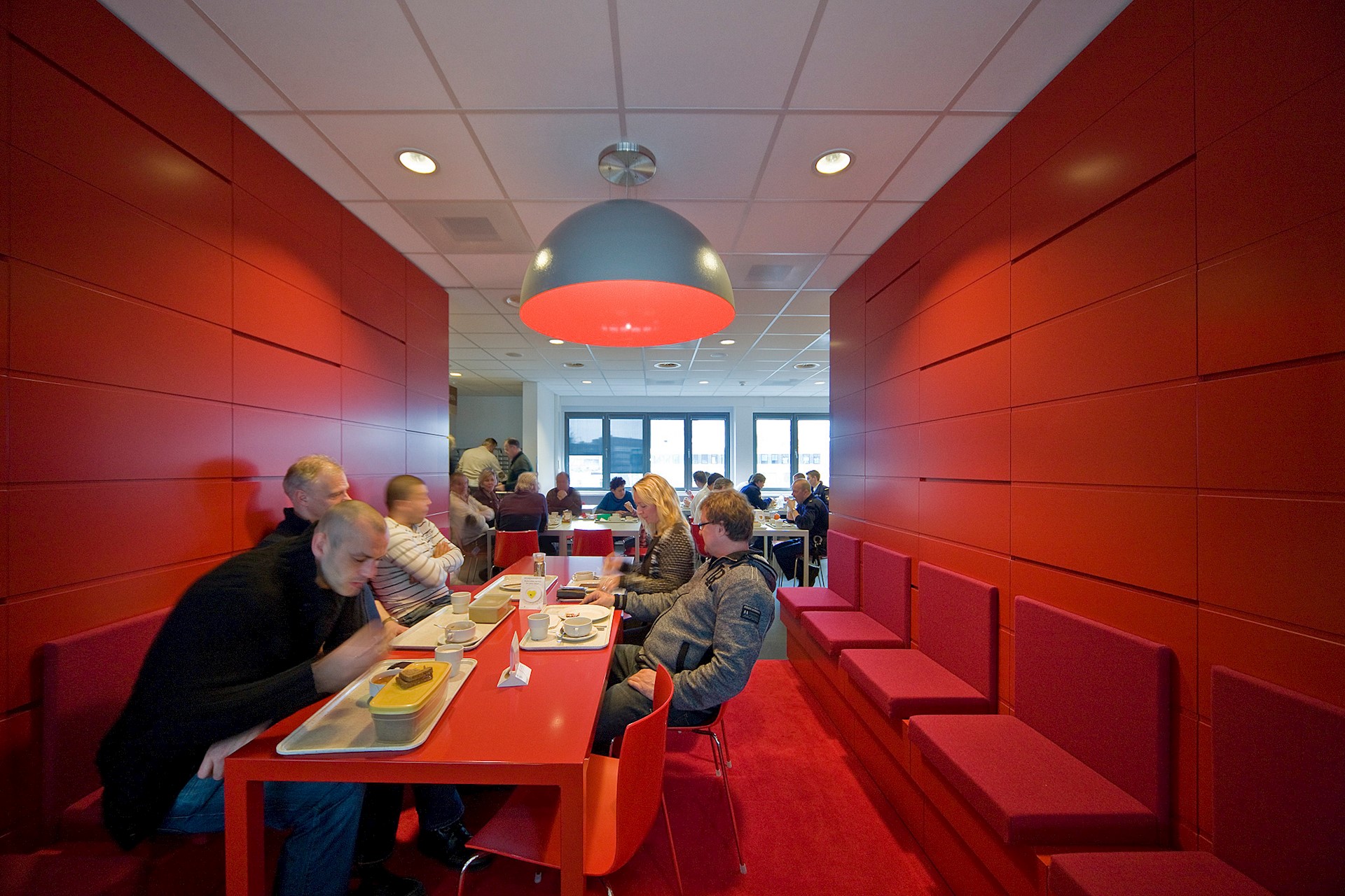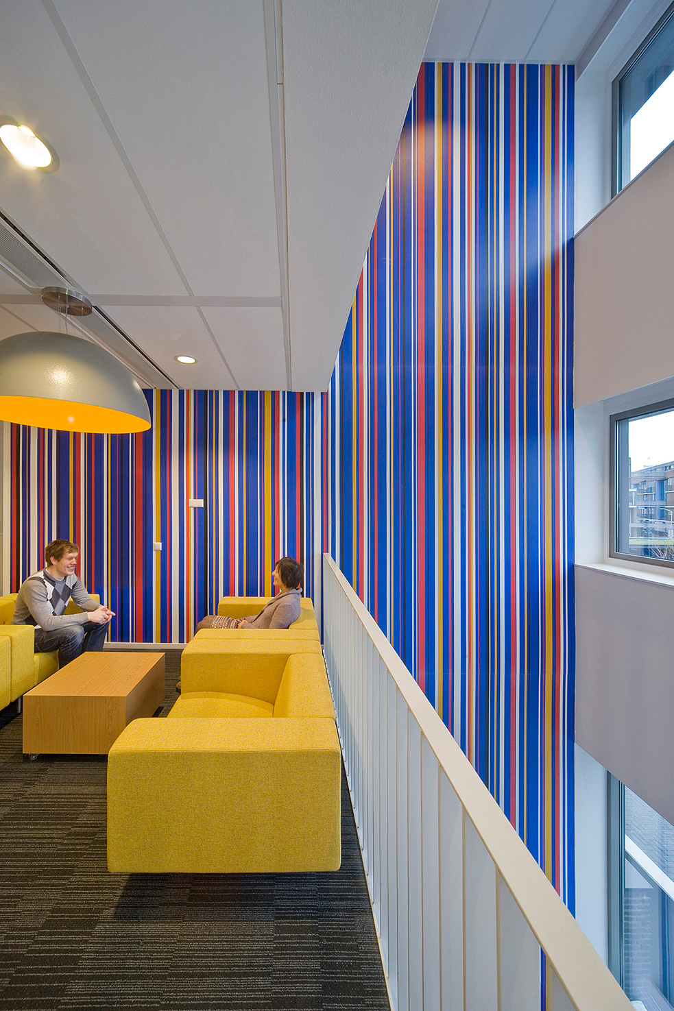 Deze middenzones hebben per verdieping een eigen kleurstelling gekregen (blauw, geel en rood). In de middenzones liggen aan de lopers informele overlegplekken, aanlandwerkplekken en loungeplekken. In de vide, waar op elke verdieping een loungeruimte met een pantry wordt gecombineerd, komen de kleuren van de drie verdiepingen bij elkaar en smelten samen tot één geheel. Op deze wijze ontstaat dus ook in verticaal opzicht, in de vide tussen de verdiepingen, een ontmoetingszone.