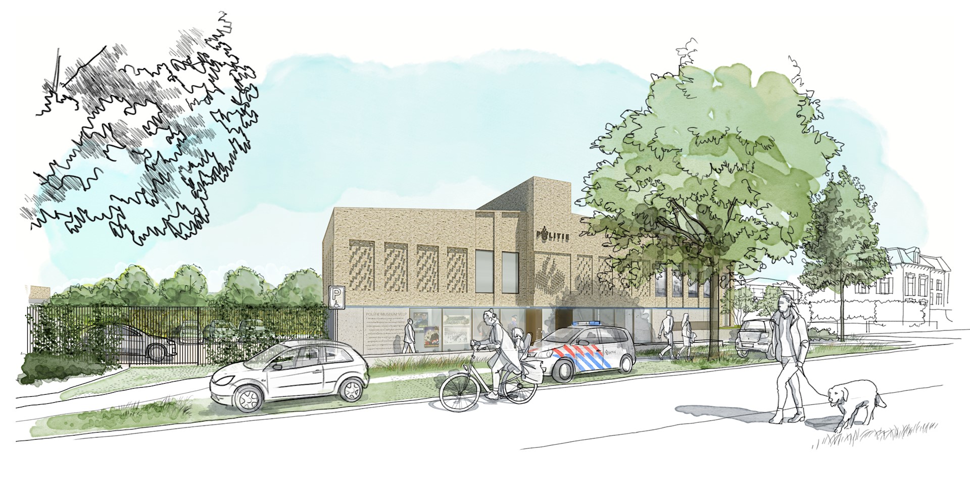 Het gebouw verrijst te midden van een aantal statige monumentale panden. In het ontwerp is daarom gekozen voor een moderne benadering van de rijke gevelarchitectuur die de klassieke omliggende villa’s typeren. De hiërarchische manier van ordenen met kleinere massa en prachtige gevelprincipes zijn in het ontwerp meegenomen. Daarnaast krijgt het nieuwe politiekantoor net als de omliggende villa’s een prachtig groen voorterrein. Zo ontstaat er een ‘villa in het groen’ die uitstekend in de omgeving past.