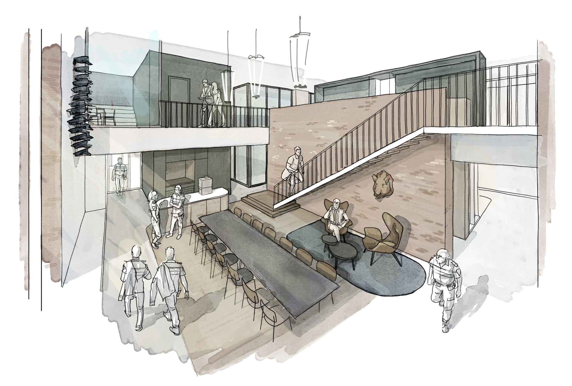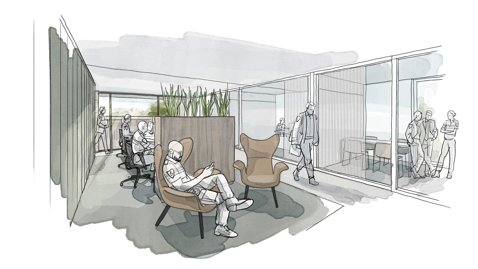 In de hoek van het L-vormige gebouw ligt een vide. Vanuit deze ontmoetingsplek krijgt het personeel toegang tot het dynamische politiewerkgebied, maar ook naar de verdieping, met briefingruimte, kleedruimtes en het rustige werkgebied. In deze huiskamer wordt koffie gedronken, maar is ook plek om aan te landen. Er kan worden gewerkt op de werkplekken aan de grote ramen en aan de tafel in het midden van de vide. De kantooromgeving wordt ingericht en afgestemd op alle processen van het specifieke team, met een goede mix van werken en ontspannen volgens het Activiteit Gerelateerd Werken.