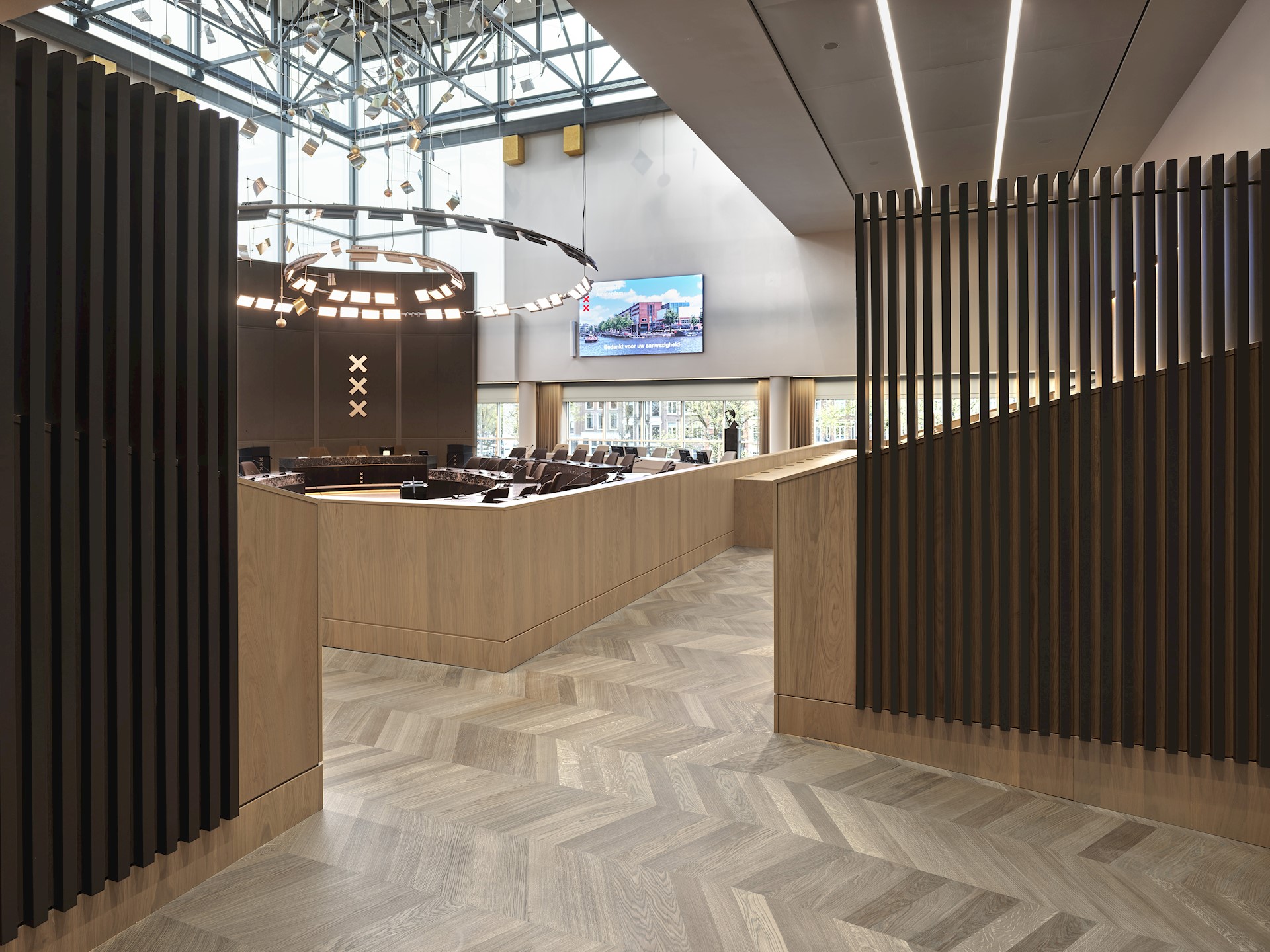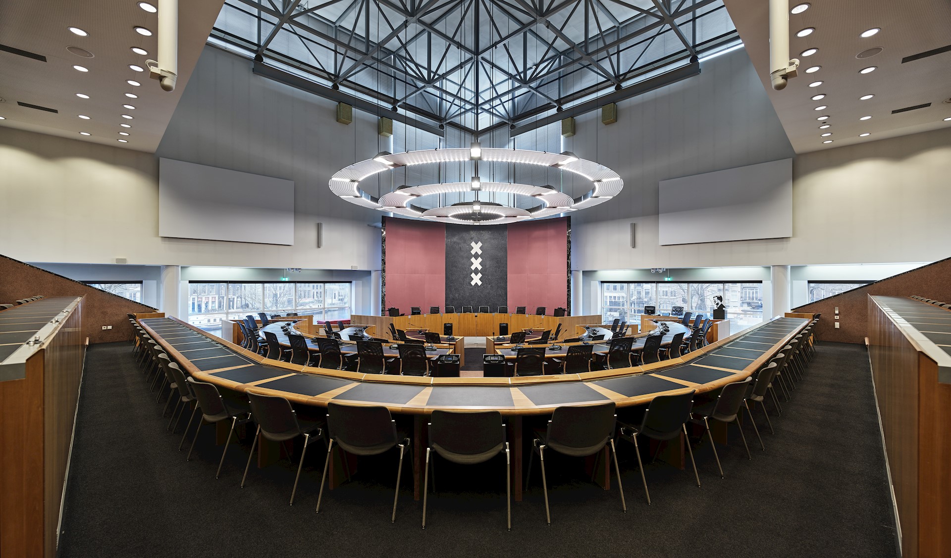 De raadzaal van het stadhuis is een plek met grote betekenis. Hier wordt de stad vertegenwoordigd, wordt het debat gevoerd en worden besluiten genomen die direct invloed hebben op het dagelijks leven van de Amsterdammer. Die democratische functie vraagt om een ruimte die helder, waardig en ondersteunend is aan het gesprek.