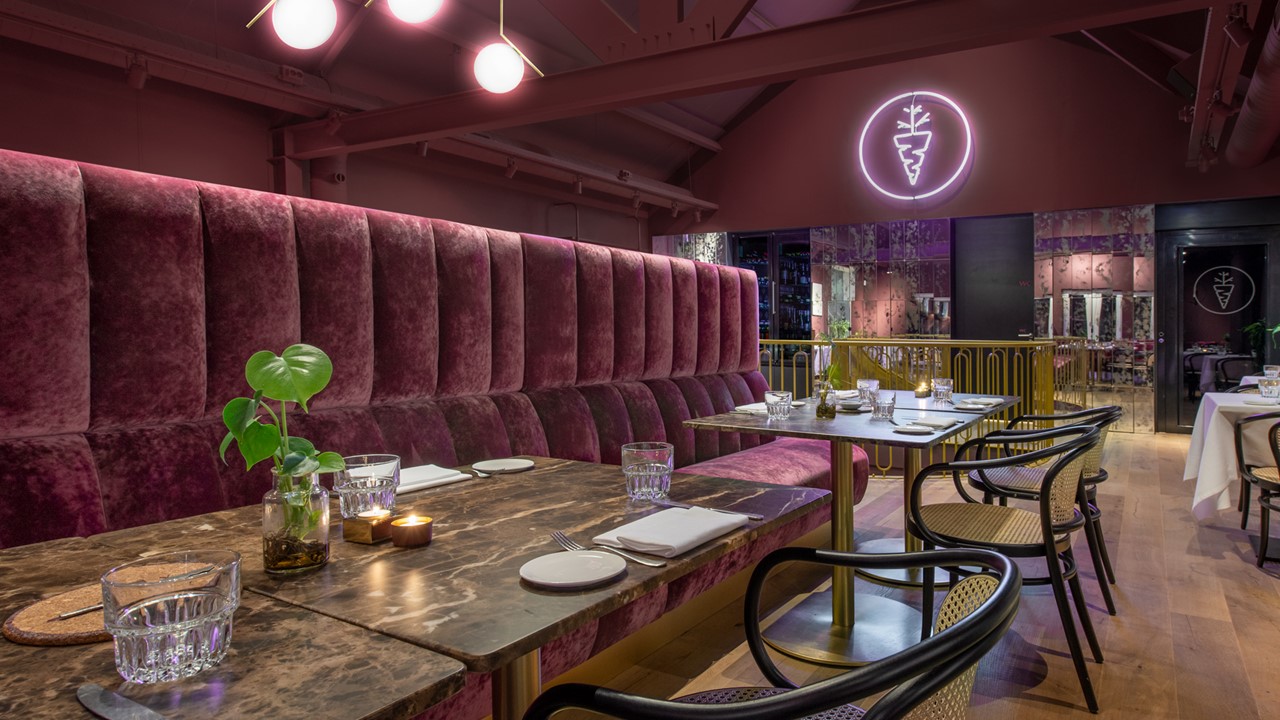We wilden in Sukerieje een intieme sfeer creëren die elegant en stoer tegelijk is, met een knipoog naar de klassieke uitstraling van de horeca in het begin van de 20e eeuw. De auberginegekleurde wanden en plafonds, in combinatie met de eikenhouten vloer, geven het interieur een diepe, warme toon. Deze kleuren resoneren op hun beurt heel mooi in het elegante geelkoper van de lange messing bar op de begane grond en de bar op de verdieping.