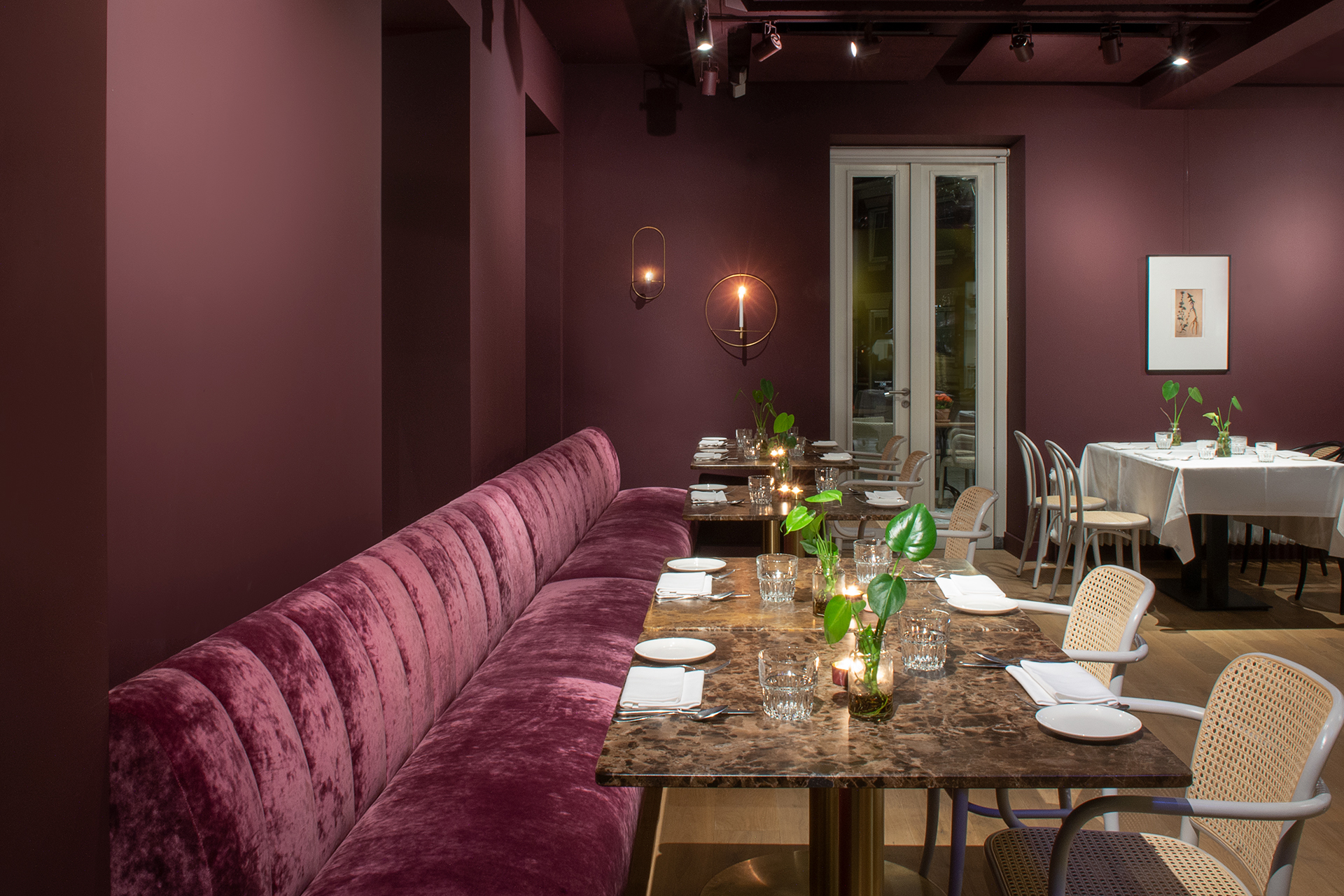 We wilden in Sukerieje een intieme sfeer creëren die elegant en stoer tegelijk is, met een knipoog naar de klassieke uitstraling van de horeca in het begin van de 20e eeuw. De auberginegekleurde wanden en plafonds, in combinatie met de eikenhouten vloer, geven het interieur een diepe, warme toon. Deze kleuren resoneren op hun beurt heel mooi in het elegante geelkoper van de lange messing bar op de begane grond en de bar op de verdieping.
