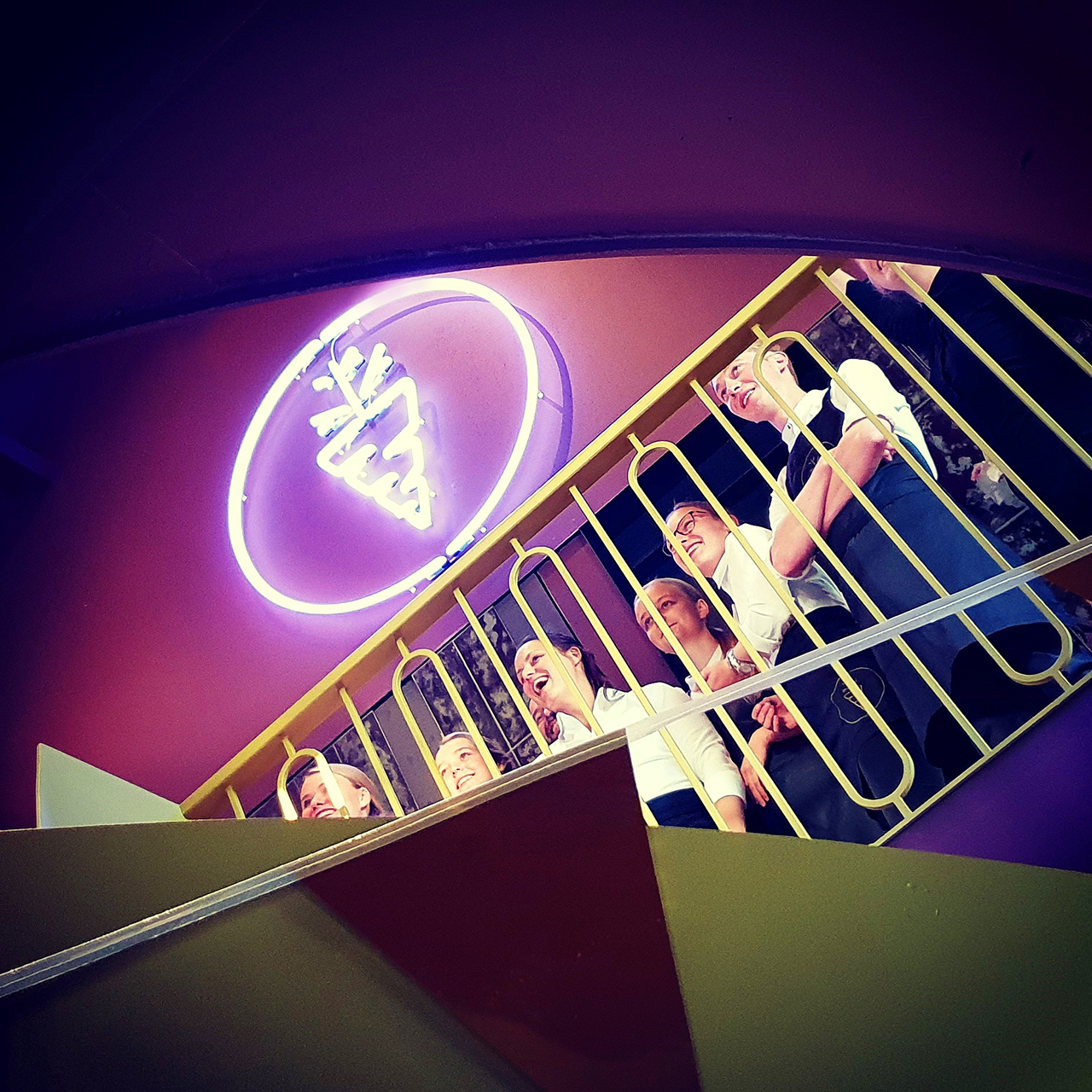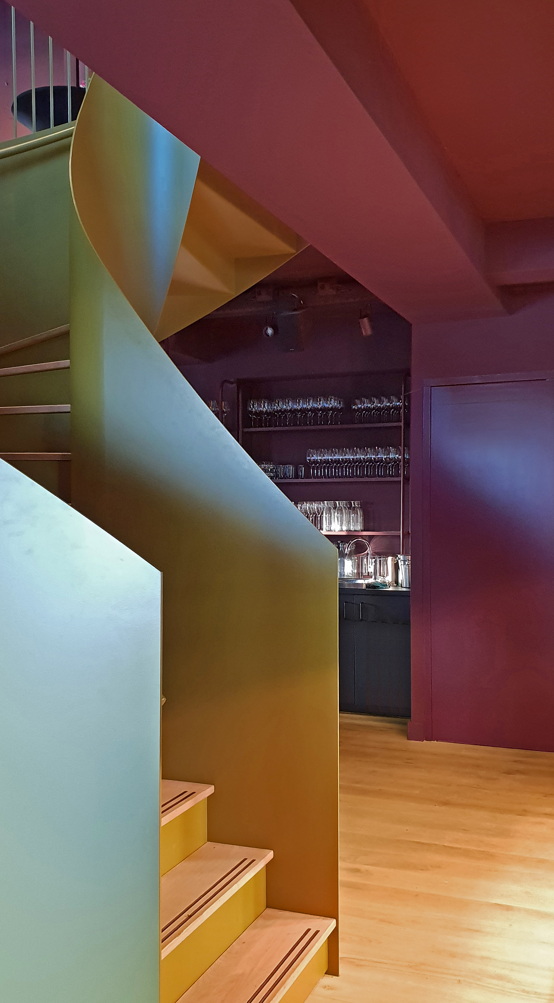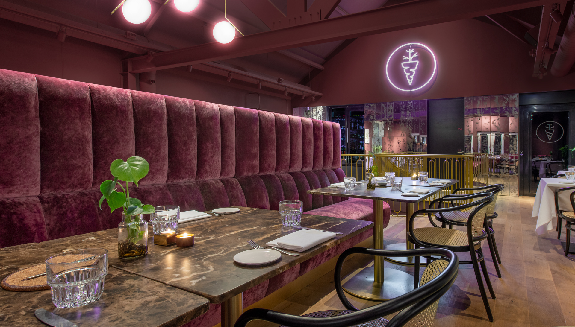 Een stalen groengoude wenteltrap leidt de gasten naar boven. Bij het betreden van de verdieping krijgen ze via de gematteerde spiegels een spannend indirect zicht op het interieur. De klassieke stijl komt ook weer terug in de luxe velours banken en de marmeren tafelbladen met accenten van messing.
