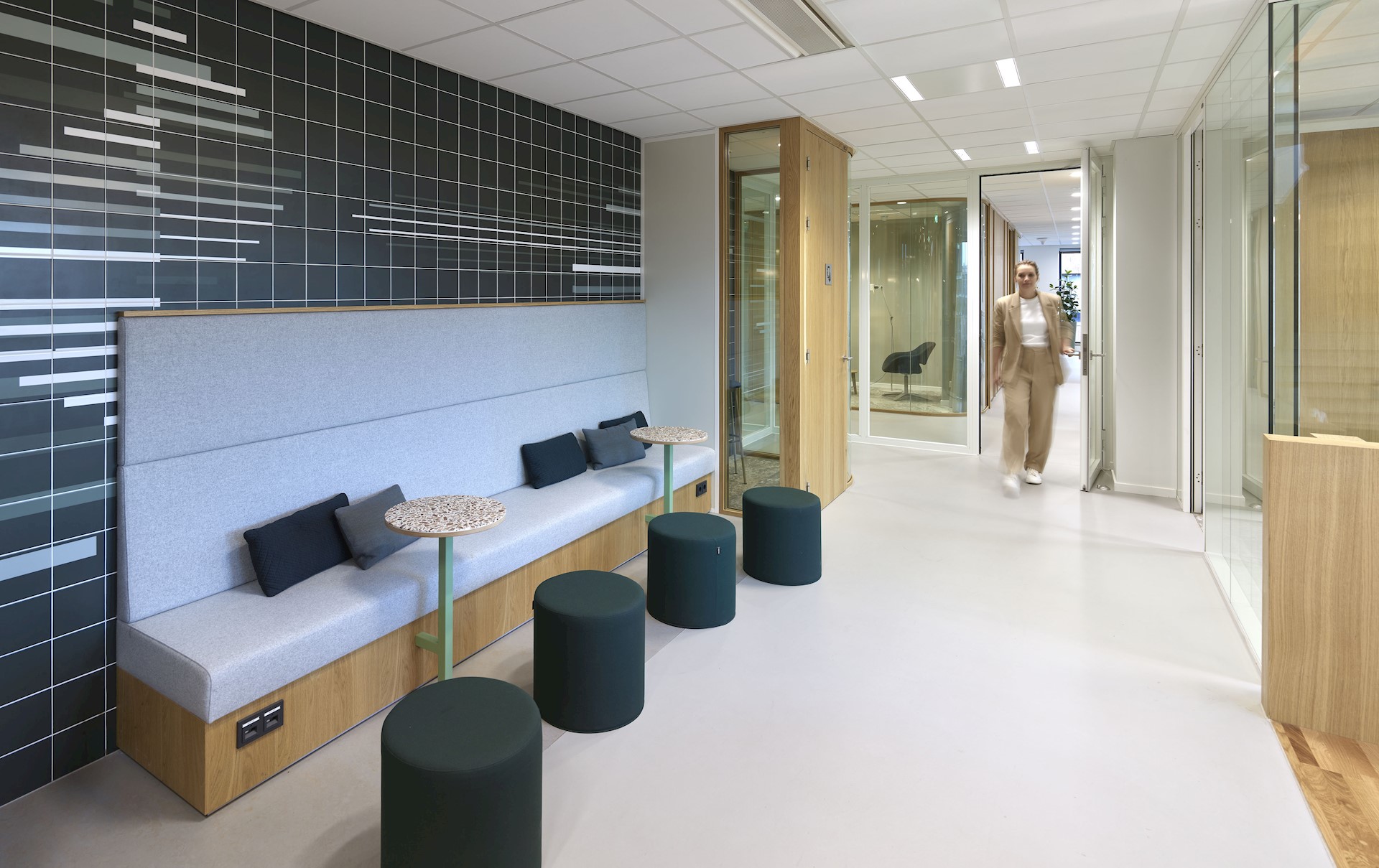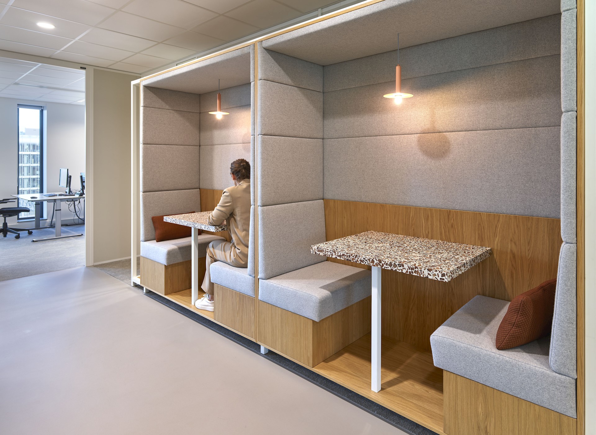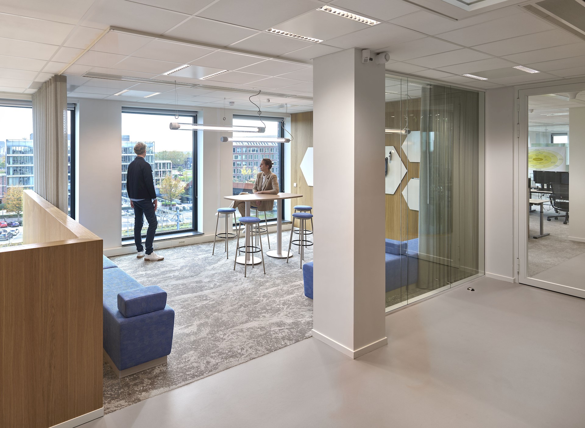 Op iedere verdieping liggen aan de vide dynamische ontmoetingsplekken waar medewerkers iets drinken, even bijpraten of kort overleggen. Vanuit daar lopen medewerkers de kleine vergaderruimtes in. Het interieur van de sfeervolle vergaderruimtes heeft een moderne vormgeving, geïnspireerd op een bruin café. Gevarieerd ingericht met een breed scala aan vergadermogelijkheden zijn er ruimtes met lage en hoge vergadertafels, een ‘huiskameropzet’ en/of scrumvoorzieningen. Deze vormen een buffer naar de rustige werkzones.