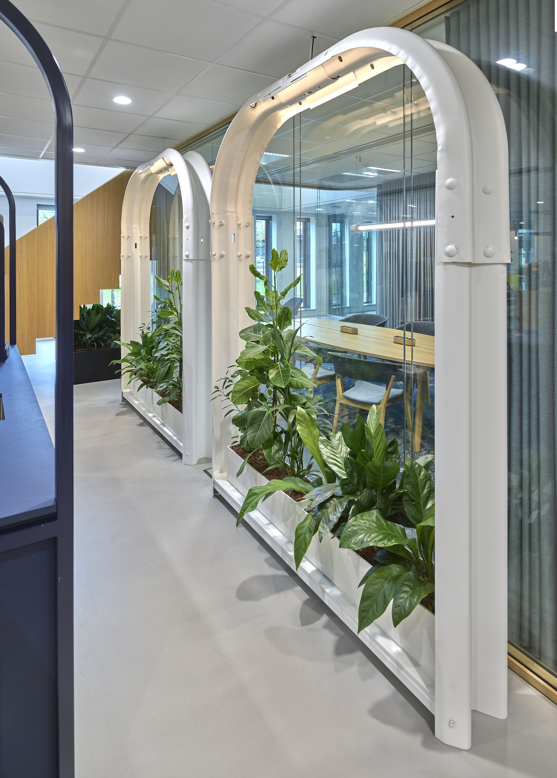 In het vergadercentrum is de bourgondische markt van ‘s-Hertogenbosch vertaald in de sfeer en uitstraling van verschillende ankerpunten, waar mensen elkaar ontmoeten. Hier is voornamelijk gewerkt met terra kleuren. In de nabijgelegen spreekkamers en scrumruimten ontstaan creatieve ideeën, net als in de Bossche cafeetjes. De werkgebieden op de tweede tot en met de vijfde verdieping dienen als rustige uitvalsbasis waar je niet gestoord wordt. De hoogste verdieping, een omgeving met stiltewerkplekken, is geïnspireerd op het Bossche Broek. Op het dakterras kan worden gewerkt op akoestische werkplekken, genietend van een prachtig uitzicht over ’s-Hertogenbosch.
