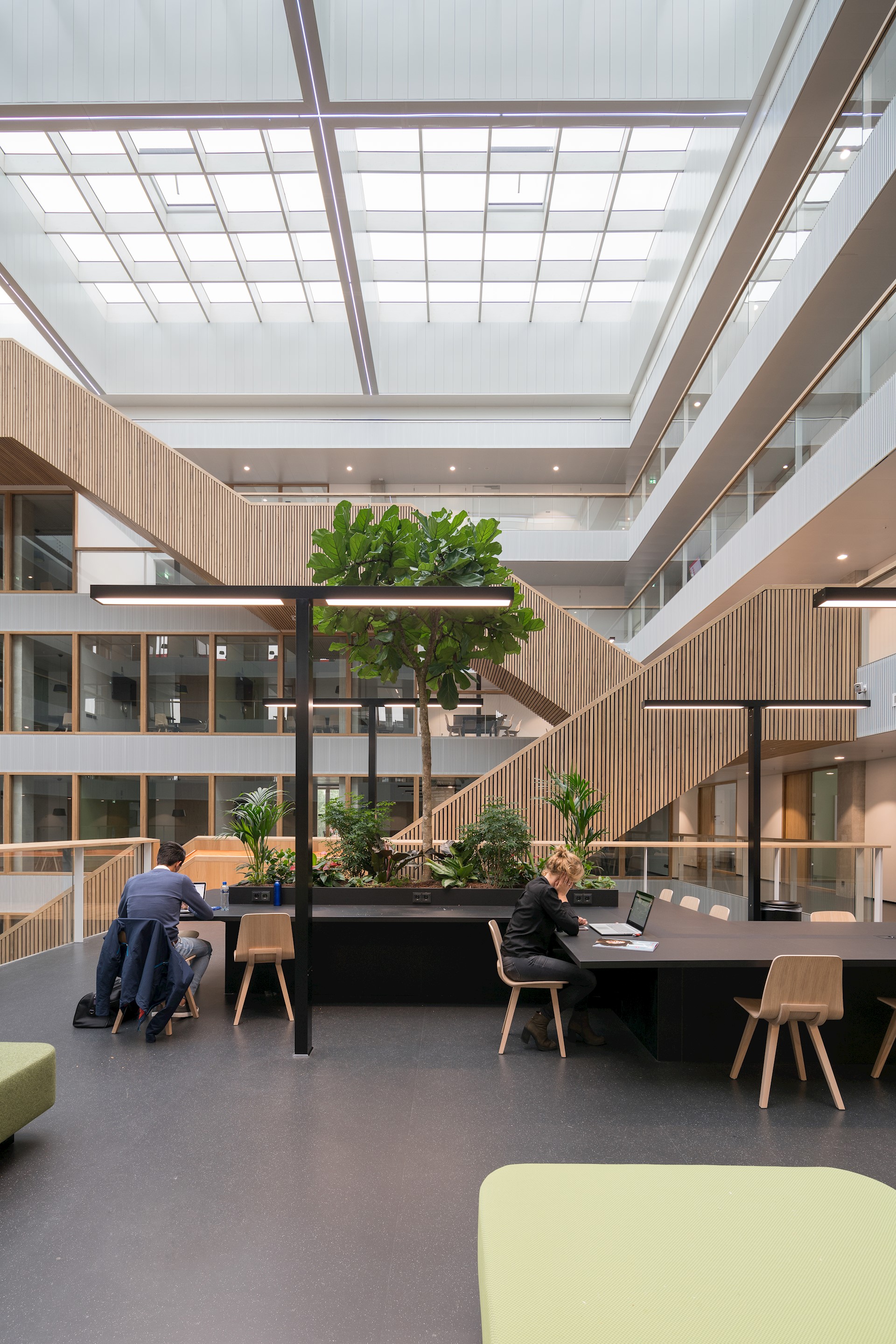 De bestaande studiestraat is doorgetrokken tot aan de ingang van de nieuwbouw, waar deze zich opent via een entree met brede podiumtrap. De studiestraat is voorzien van een koffiebar en flexibel meubilair, wat deze geschikt maakt voor informele ontmoetingen en evenementen. De 20 meter brede trap geeft toegang tot het lichte hart van het nieuwe onderwijsgebouw, het atrium. Rondom het atrium zijn projectruimtes, leslokalen en kantoren gesitueerd. In het atrium bevinden zich op elke verdieping studiepleinen verbonden met een uitgesproken en uitnodigende houten trap.