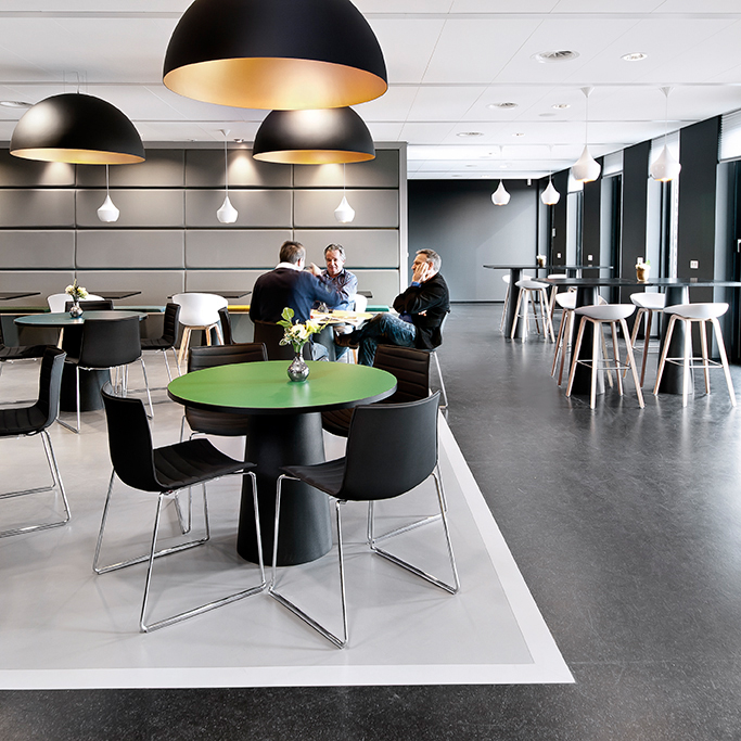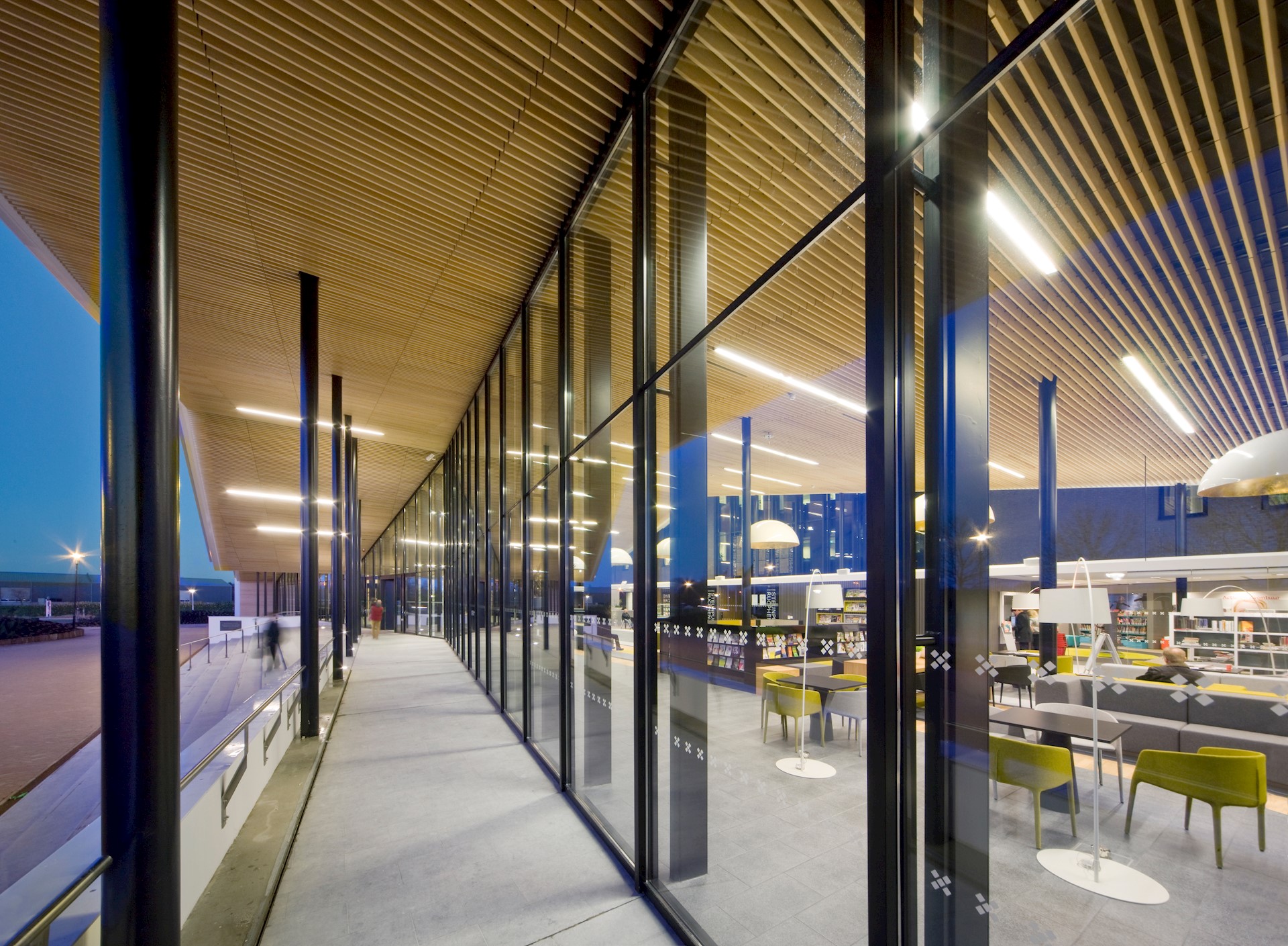 De puien in de voorgevel en de binnenzijde van dit dak zijn van blank hout waardoor een prettige, warme sfeer ontstaat. Om het uitnodigende karakter vanuit de noordzijde extra te benadrukken zijn door de verschuivingen in het kantoorblok een tweetal patio’s ontwikkeld. Hierdoor kan het daglicht tot diep in het centrale deel doordringen en zodoende als extra trekker werken. Om het ontmoetingsgedeelte extra kracht te geven is voor het kantoorgedeelte bewust gekozen voor een nagenoeg zwarte baksteen. Ook de verticale lichtstroken zijn voorzien van donkere kozijnen.