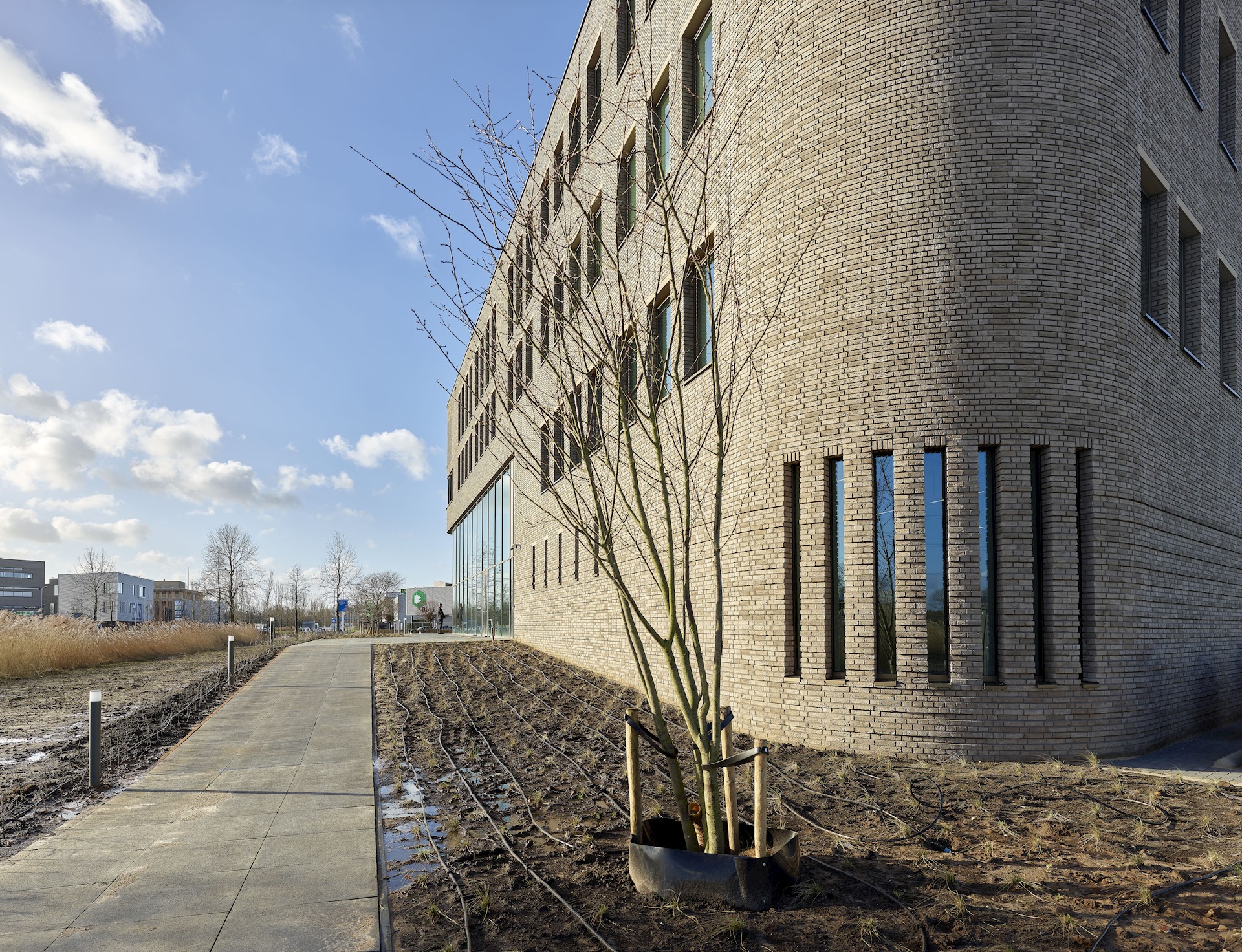 Het nieuwe gebouw is als een echte eenheid vormgegeven, met gebruik van hoogwaardige materialen en detaillering. Het volledige exterieur is uitgevoerd in een handvorm baksteen met een warme kleur. Door de verspringende voegdiepten heeft het metselwerk een mooie tactiliteit, waarbij er door de verschillen in schaduwval ogenschijnlijk kleurverschillen ontstaan. Ook bijzonder is dat dit metselwerk is uitgevoerd in een Noors kettingverband; elke laag bestaat uit een herhaling van twee strekken met één kop. De posities van de ramen, met slanke, brons geanodiseerde aluminium kozijnen zijn daar vervolgens speciaal op afgestemd. De hoeken met de diepe neggen moesten namelijk goed ingepast worden in dit verband. Hierbij moesten we ook rekening houden met een ander programmatisch uitgangspunt; om een flexibel gebouw te creëren, hebben we er namelijk voor gezorgd dat op elke 1,80 meter een binnenwand kan worden geplaatst. Zo zijn de ramen volgens een zeer specifieke ordening in de gevel geplaatst, waardoor het typische gevelpatroon is ontstaan.