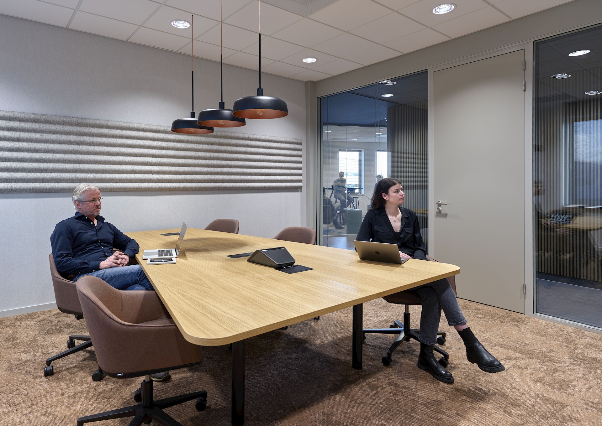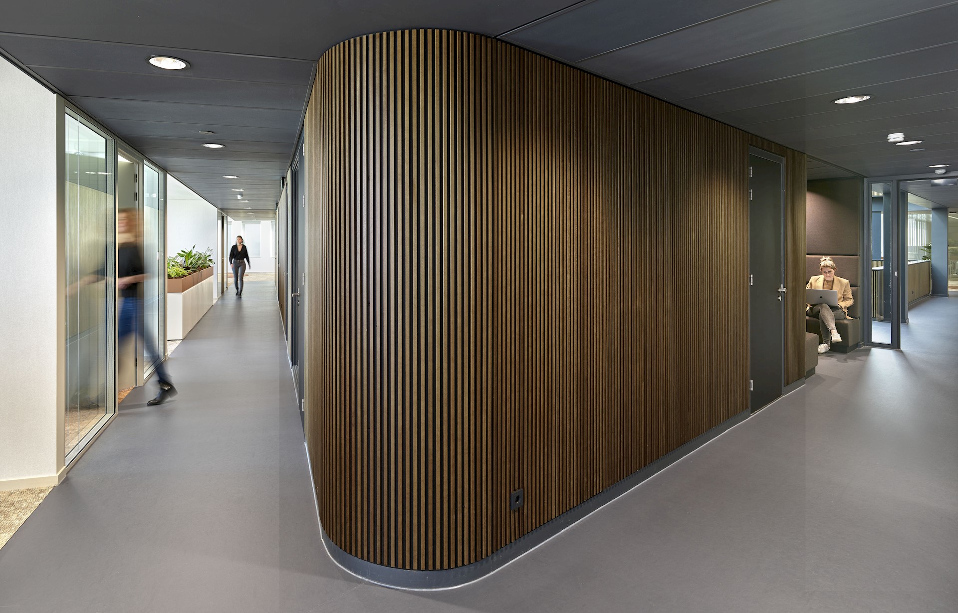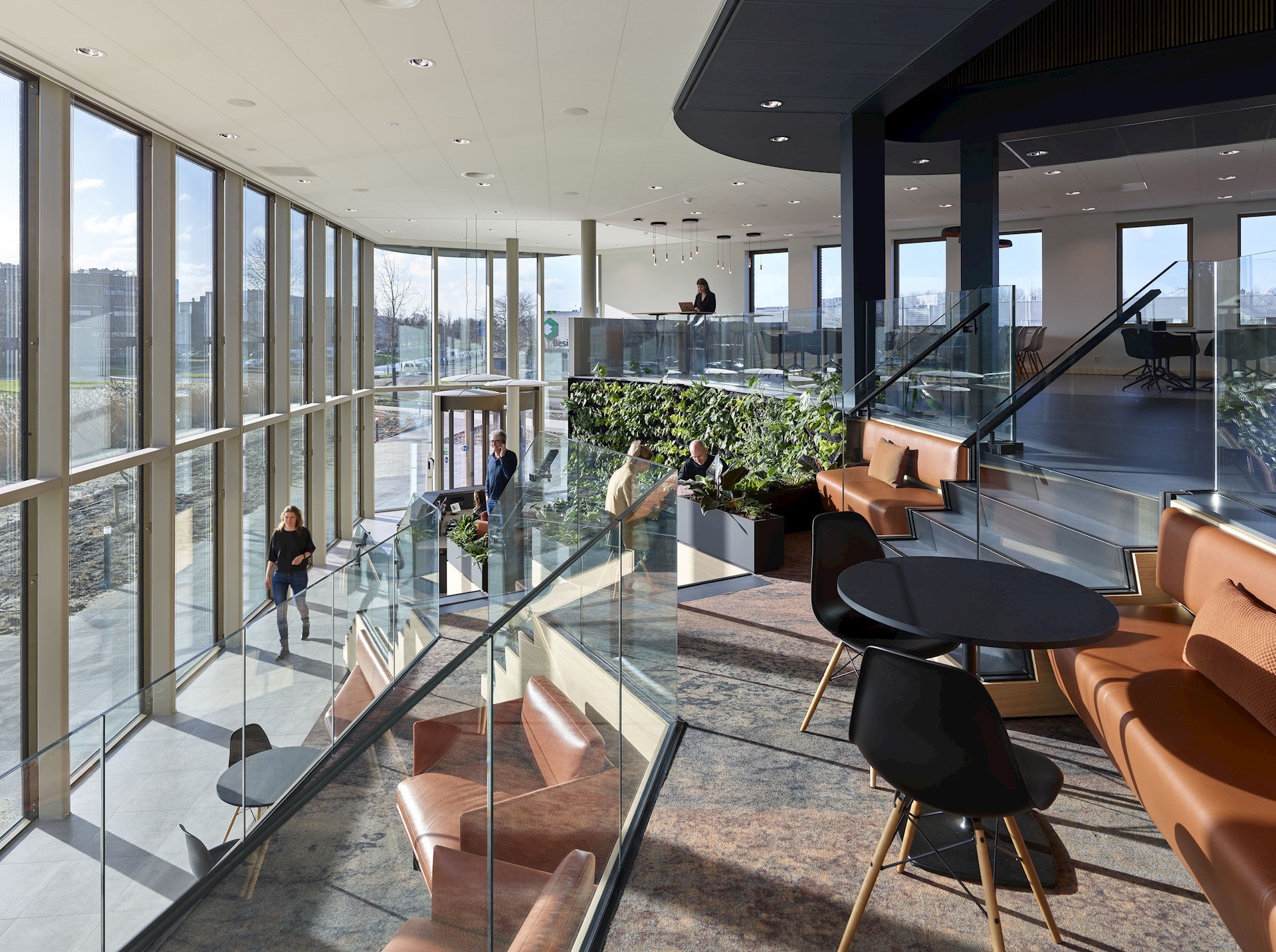 De werkplekken op de tweede en derde verdieping zijn ontworpen als hybride en gezonde werkomgeving. Deze zijn te betreden via de fraaie trappen in de vide. Personeel kan hier op ieder moment kiezen voor bijvoorbeeld een aanlandplek, open werkplek, samenwerkplek of scrumruimte. Doordat de werkplekken aan de gevel liggen, krijgen deze altijd genoeg daglicht. Ook is er een daily start up punt gerealiseerd en kan er in de gebouwkern worden gekozen voor een concentratiecocon. Door een combinatie van PET-vilt en houten latten als plafond- en wandafwerking heeft de werkomgeving een optimale akoestiek. Beweging wordt gestimuleerd door de prominente trappen in de vide en het op sommige punten bewust weglaten van krukken bij hoge tafels. Na de komst van het coronavirus hebben we snel geschakeld en de verschillende werkplekken aangepast voor een optimale inzet van digitale schermen en camera’s. Ook zijn de ronde tafels vervangen door tafels in trapeziumvorm, zodat een team gemakkelijk naar een scherm kan kijken.