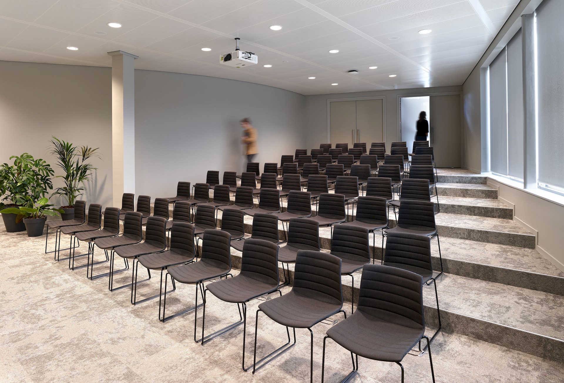 Bij binnenkomst vloeit het publieke gebied via het trappenlandschap prachtig over op de eerste verdieping. Dit landschap vormt de centrale drager van dit gebied en zorgt voor de open verbinding tussen de begane grond en de eerste verdieping. De verschillende soorten zitjes en beplanting maken het een sfeervolle ontmoetingsplek die ruimte biedt voor ontspanning onder het genot van een kopje koffie of een heerlijke lunch. De grote, glazen pui aan de waterkant geeft het ontvangstgebied een open uitstraling en voorziet bezoekers en medewerkers van een prachtig uitzicht.