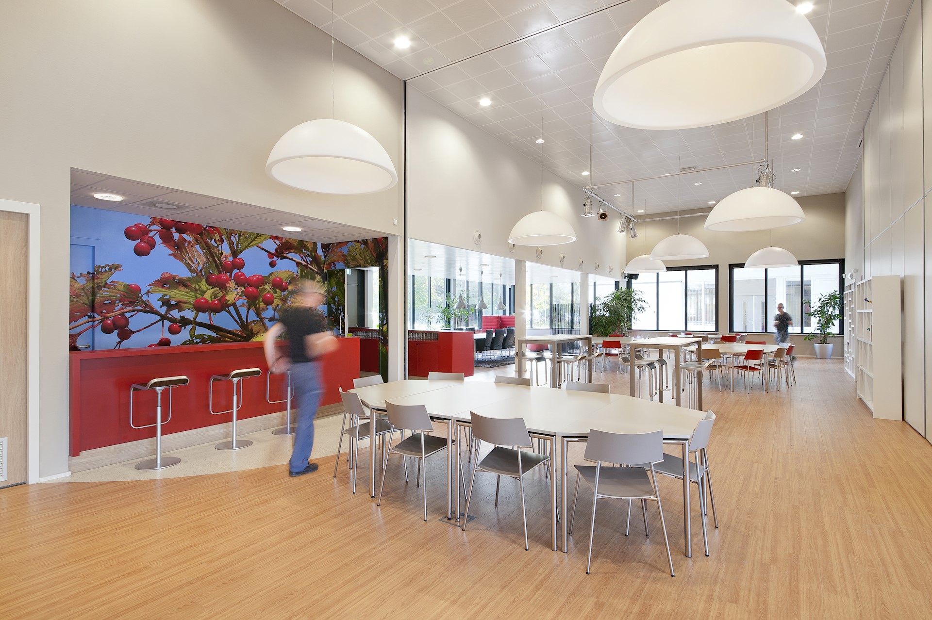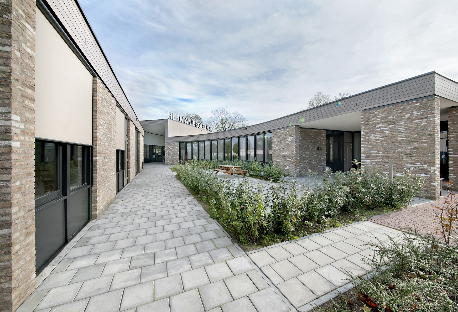 BewarenDe Herman Broerenschool bestaat uit verschillende paviljoens te midden van een bosachtige omgeving. Deze ‘campusopzet’ past niet alleen bij het landschap, maar ook bij het karakter van de brede school, die bestaat uit verschillende scholen voor speciaal onderwijs. De diverse, vrijstaande paviljoens hebben elk hun eigen voordeur. De ronde gevellijnen van de verschillende paviljoens zorgen voor een geborgen sfeer binnen én buiten, op de plekken tussen het hoofdvolume en de paviljoens. Hier liggen aan beide uiteinden van het hoofdgebouw besloten speelplaatsen, waar de kinderen ongestoord en veilig (onder toezicht) kunnen vertoeven