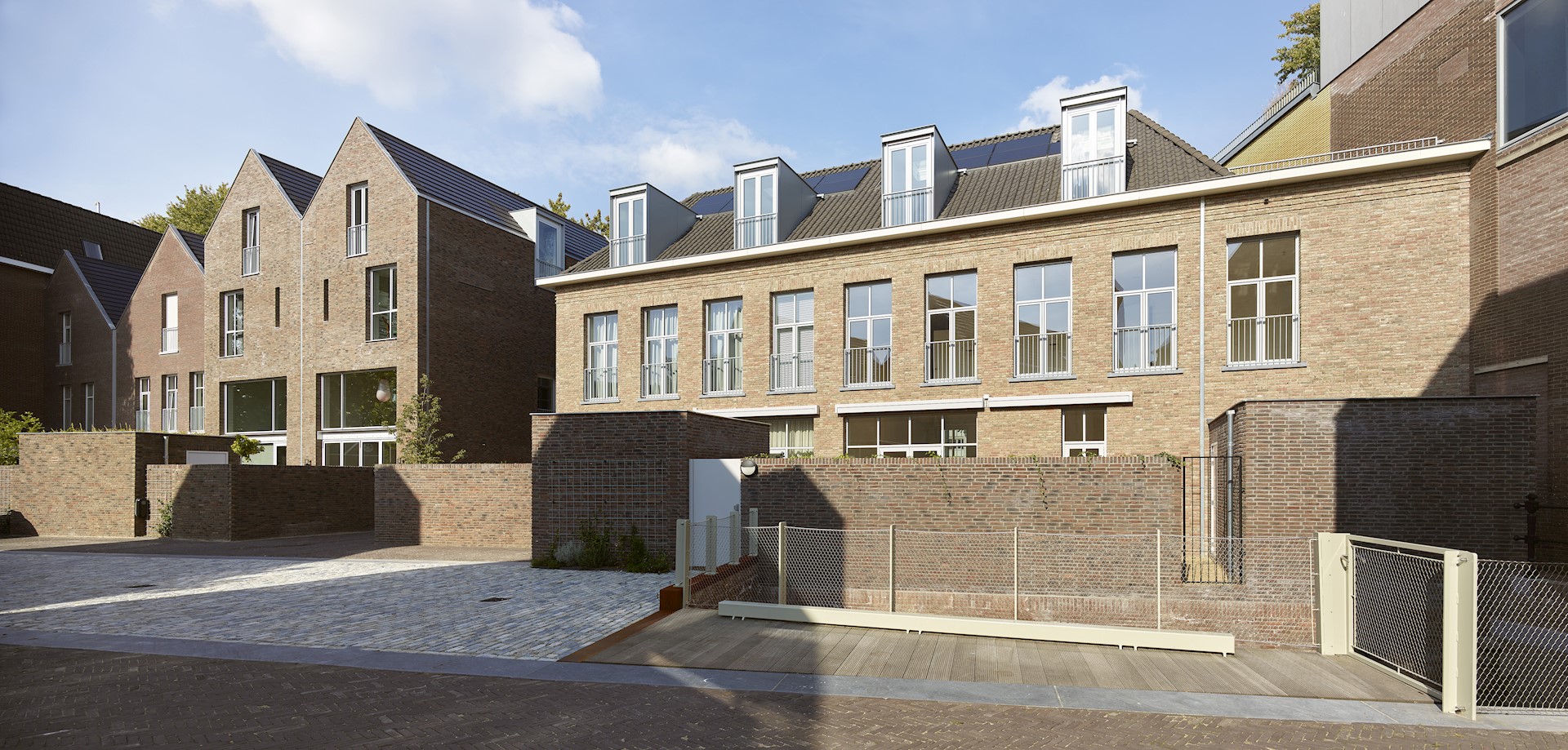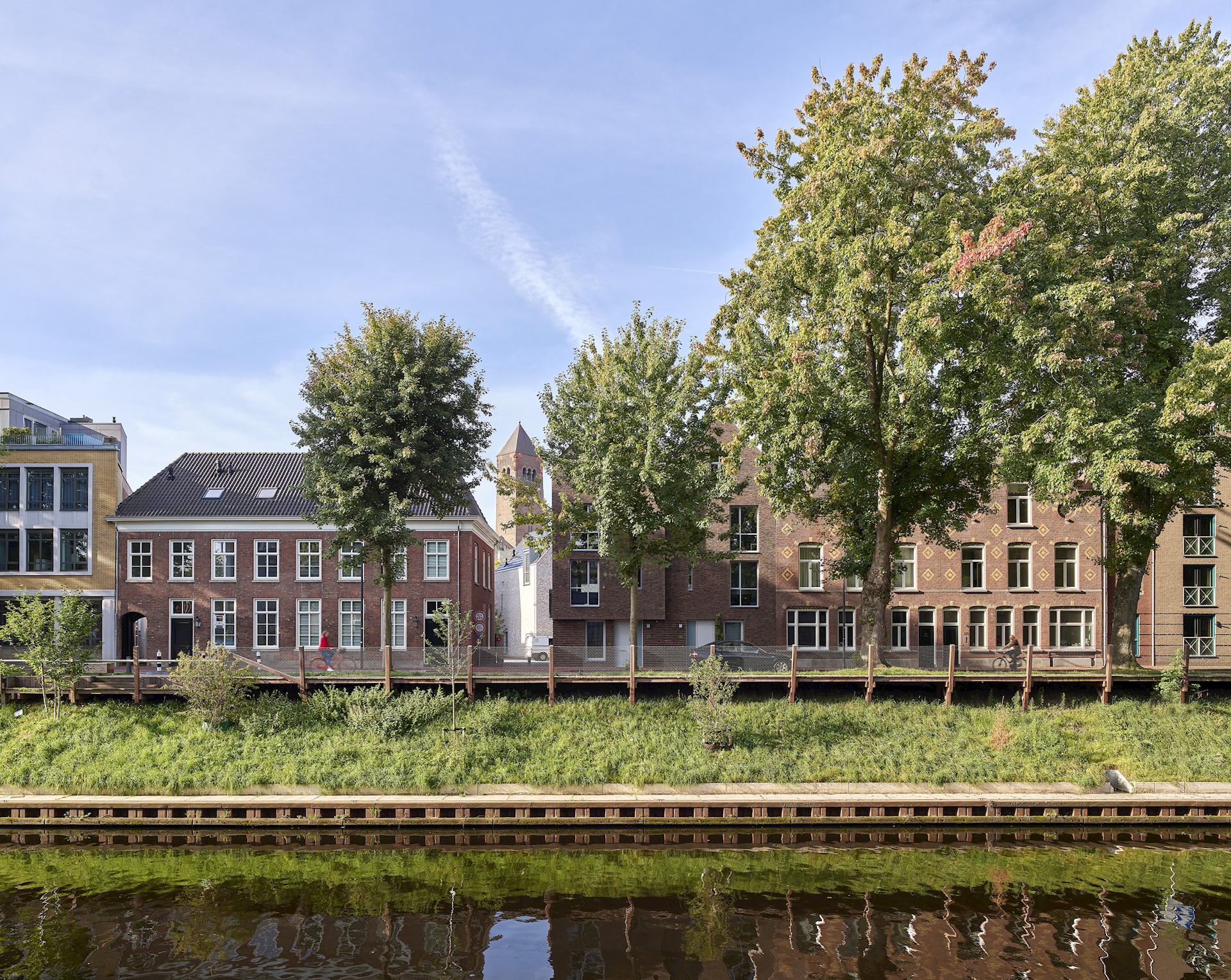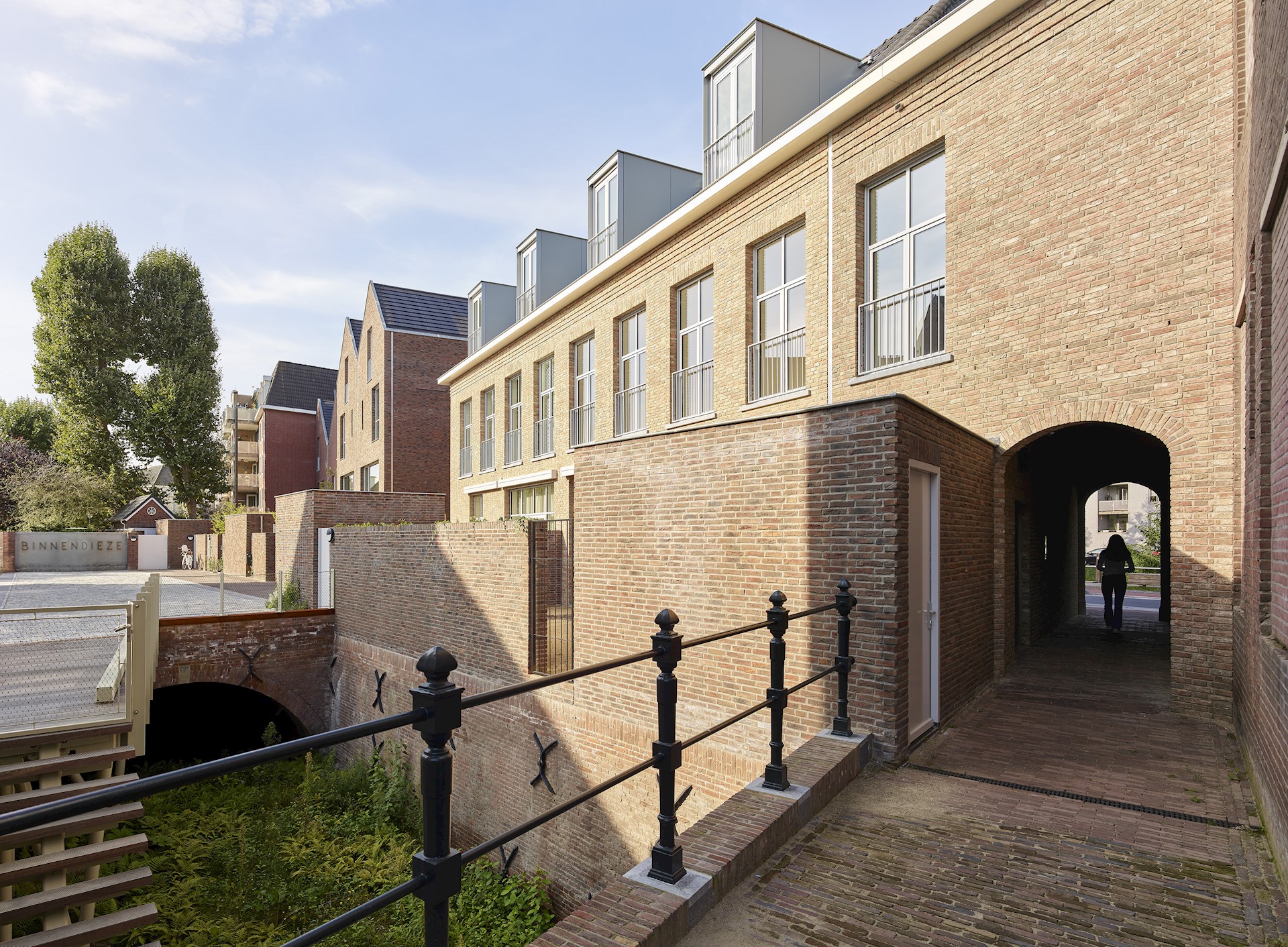 Dit project in deze historische omgeving is gevormd door hedendaagse uitdagingen als regenwaterafvoer, biodiversiteit en duurzame energie. Bij het ontwerpen van dit nieuwbouwplan hebben we in samenwerking met MTD Landschapsarchitecten de locatie benut bij het vinden van oplossingen. Zo hebben we om piekregen te kunnen afvangen een gedempt deel van de Dieze, dat verborgen lag onder het terrein, weer geopend. De woningen zijn hier zorgvuldig omheen geplaatst en het ‘nieuwe’ stukje Dieze zorgt ervoor dat het regenwater op de locatie wordt gehouden en niet in het riool wordt geloosd. Het zakt vanzelf de grond in! Ook biodiversiteit speelt een rol in het plan. Planten die in vochtige omgevingen groeien, zoals varens, zien we door het openbreken van de Dieze weer terug in de binnenstad. Daarnaast zijn er in de gevels nestkasten voor vogels gebouwd. Zo ontstaat er flora in de Dieze en fauna, zoals vleermuizen en gierzwaluwen, in de gevels.