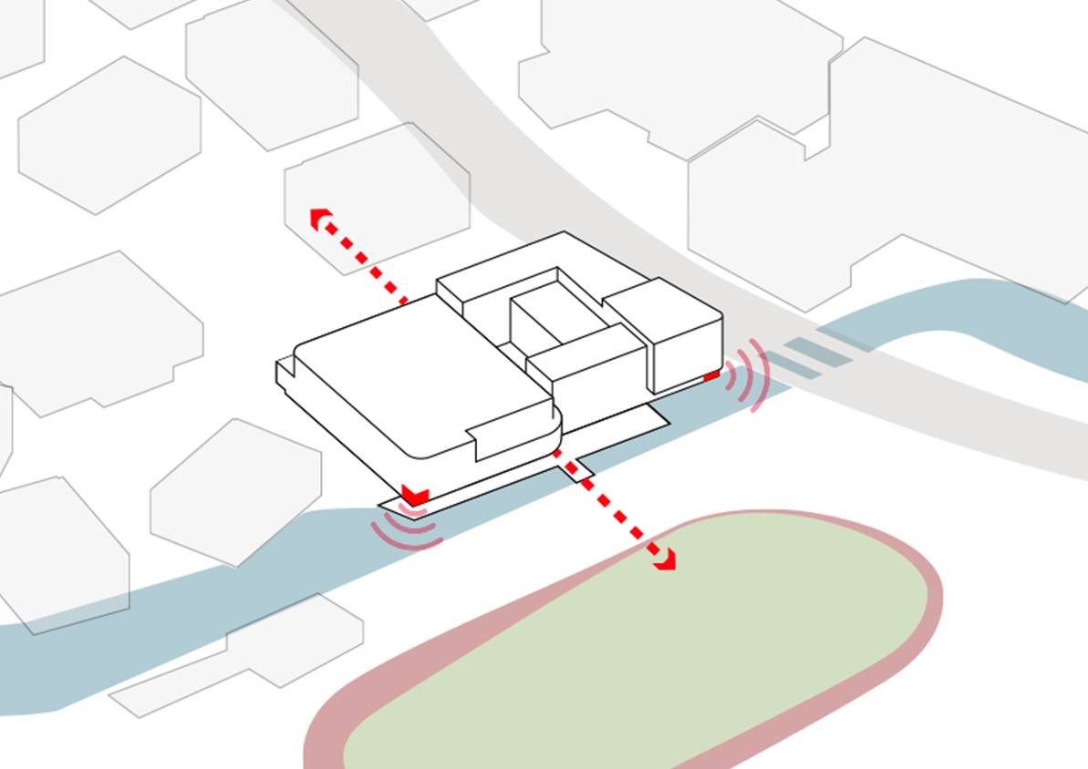Een nieuwe as op het grensvlak van school en sporthal maakt de gebouwen vanuit de omliggende ontsluitingsroutes van alle kanten bereikbaar. Daarnaast vormt de as de schakel tussen de buitenruimte van de school en de sporthal met een gezamenlijk ontmoetingsgebied aan het water en een brug naar de atletiekbaan.