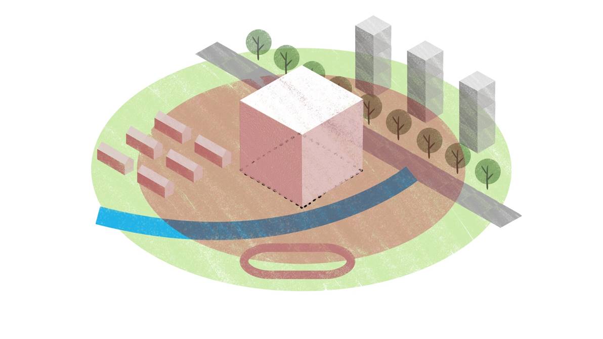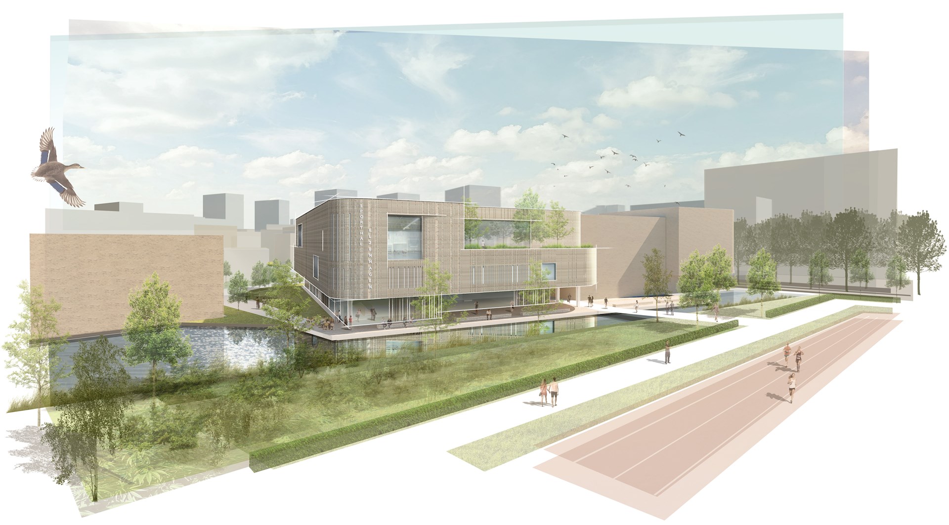 In het bestemmingsplan staan twee gescheiden functionerende gebouwen op een kavel: een sporthal en een school. Beide gebouwen zijn in ons plan georiënteerd op het water, op de atletiekbaan en de parkachtige Zuidbuurt. Het hoogste accent van de bouwmassa ligt bij de school (in lijn met de hoofdstructuur van het gebied), aflopend richting het park bij de sporthal. Het onderste deel van de gevel aan de kant van de woonwijk ligt een stuk terug ten opzichte van de verdieping. De karakteristieke overstekende bouwmassa boven het water, zorgt ervoor dat het gebouw al vanaf een afstand goed herkenbaar is. Ook vormt de overstek aan de zuidkant een natuurlijke zonwering: de basis voor een duurzaam gebouw.
