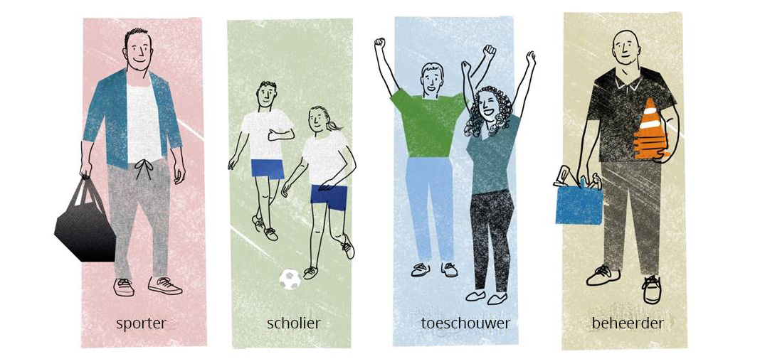 De vorm van de sporthal wordt grotendeels bepaald door de drie sportzalen. Om deze stringente vorm meer aantrekkingskracht te geven, maken we groene buitenruimten in het verlengde van de toeschouwerszone. Ze zorgen voor geleding in de gevel en laten het gebouw aansluiten op die omgeving. Ronde hoekaccenten geven richting aan de nieuwe as tussen de gebouwen en de hoofdentree. Het volume krijgt hierdoor een vriendelijk karakter, met een knipoog naar de Amsterdamse school. De plint van het gebouw is maximaal transparant uitgevoerd, om op maaiveldniveau interactie tussen binnen en buiten te stimuleren.